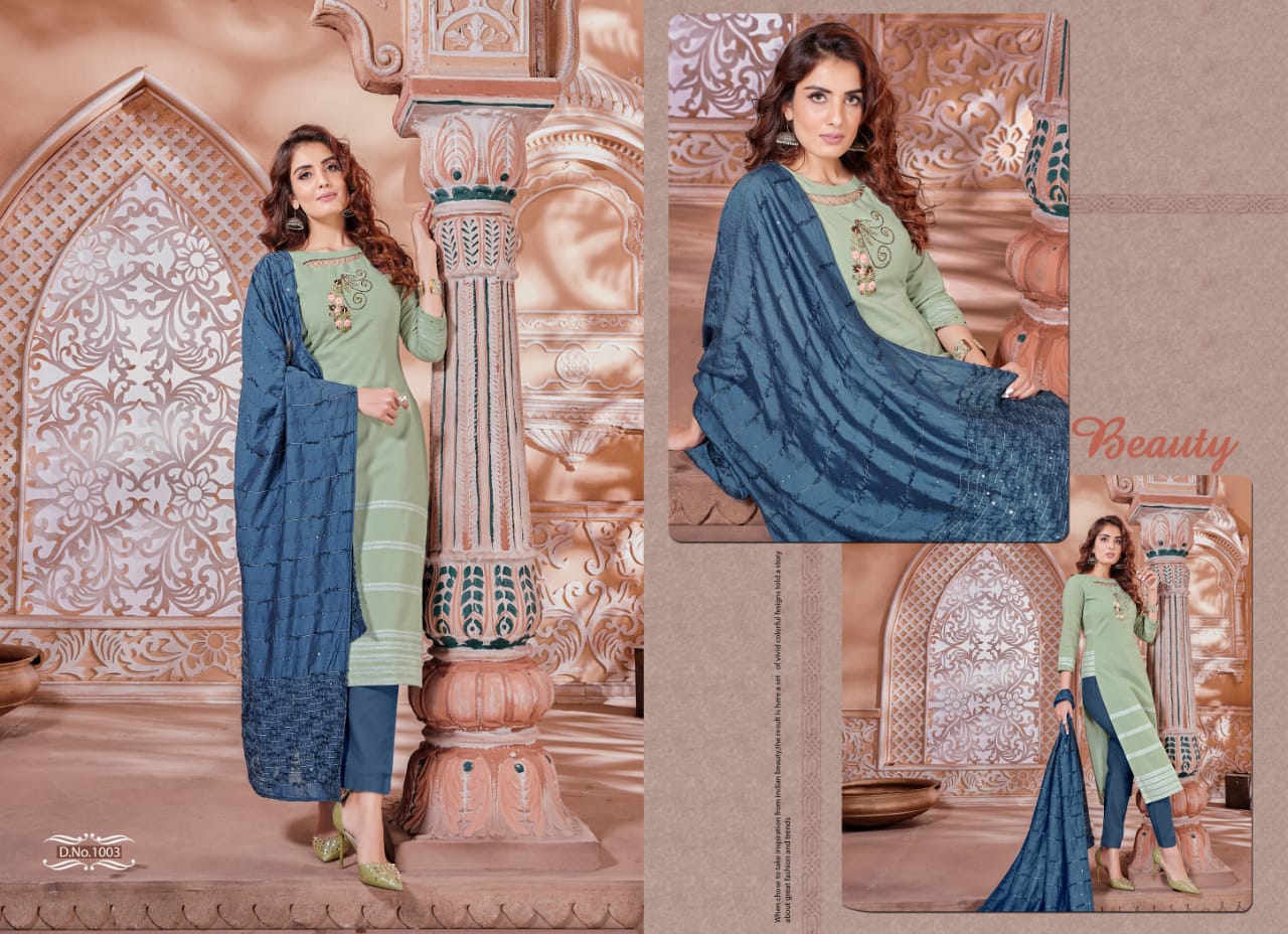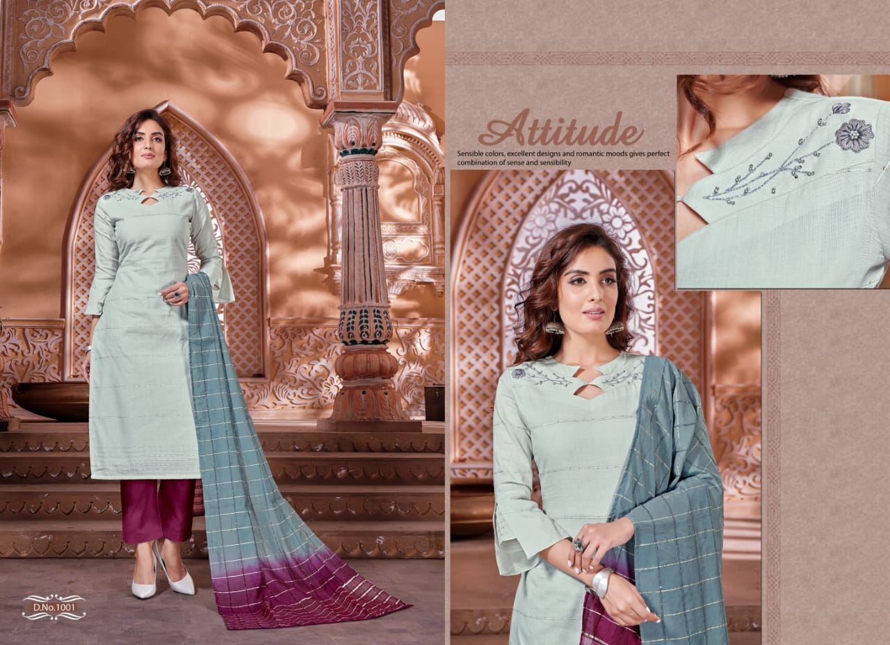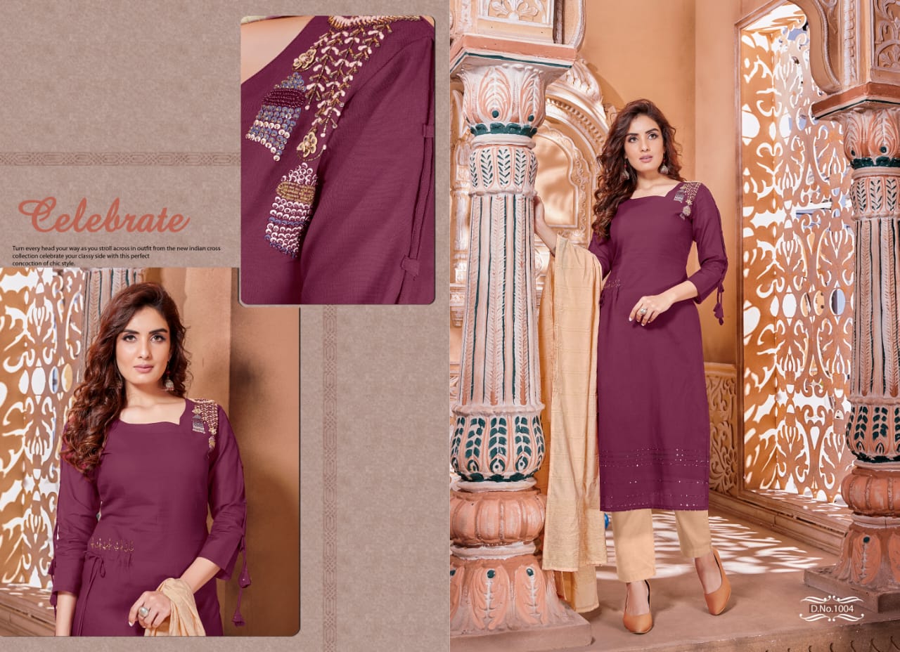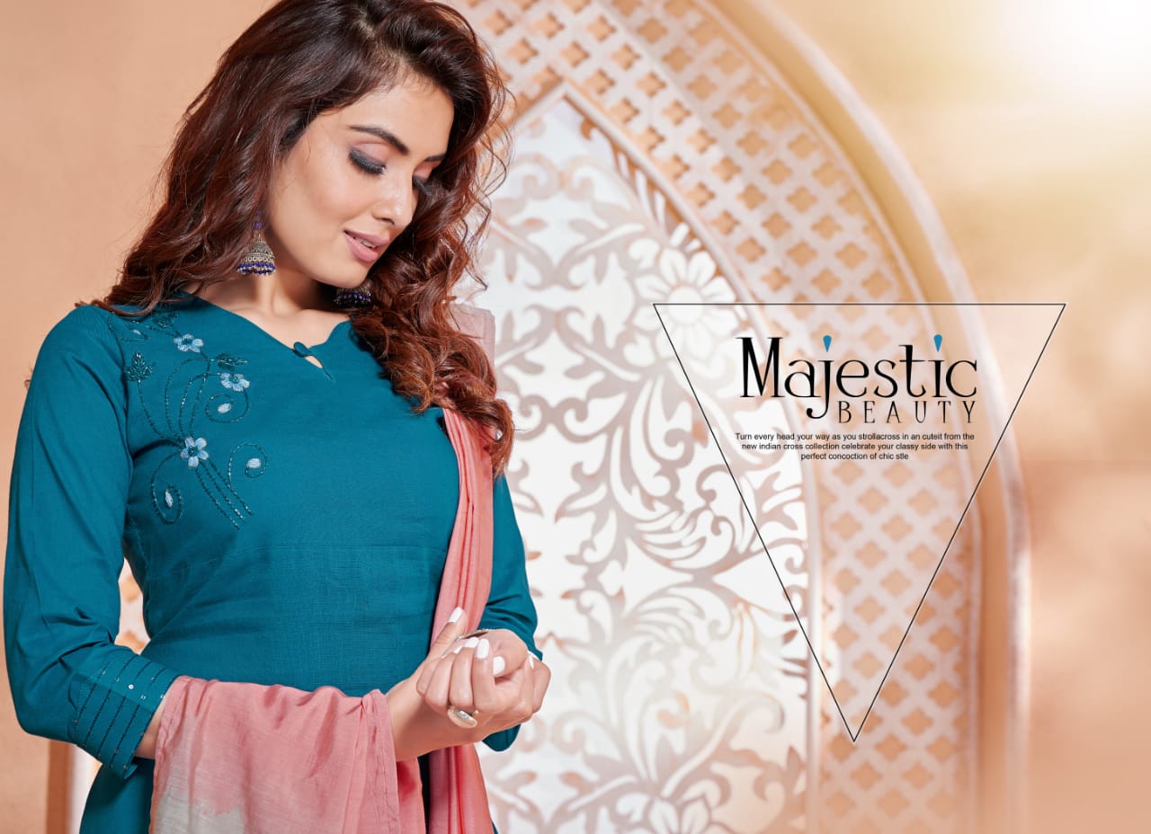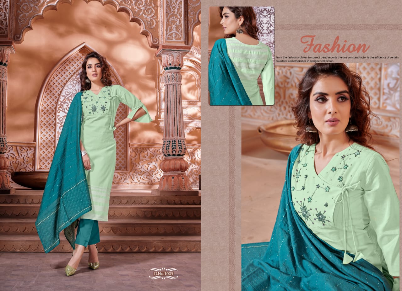 Brand name - SELESTA Catalogue name - NAYSHA Size - M L XL XXL Top fabric - pure cotton (DESIGNER) WITH HANDWORK & ACCESSORIES With COTTON LINING Bottom - glacé cotton Dupatta fabric - pure nylon viscose (DESIGNER) Rate - 1125/- GST-5% 5pcs |