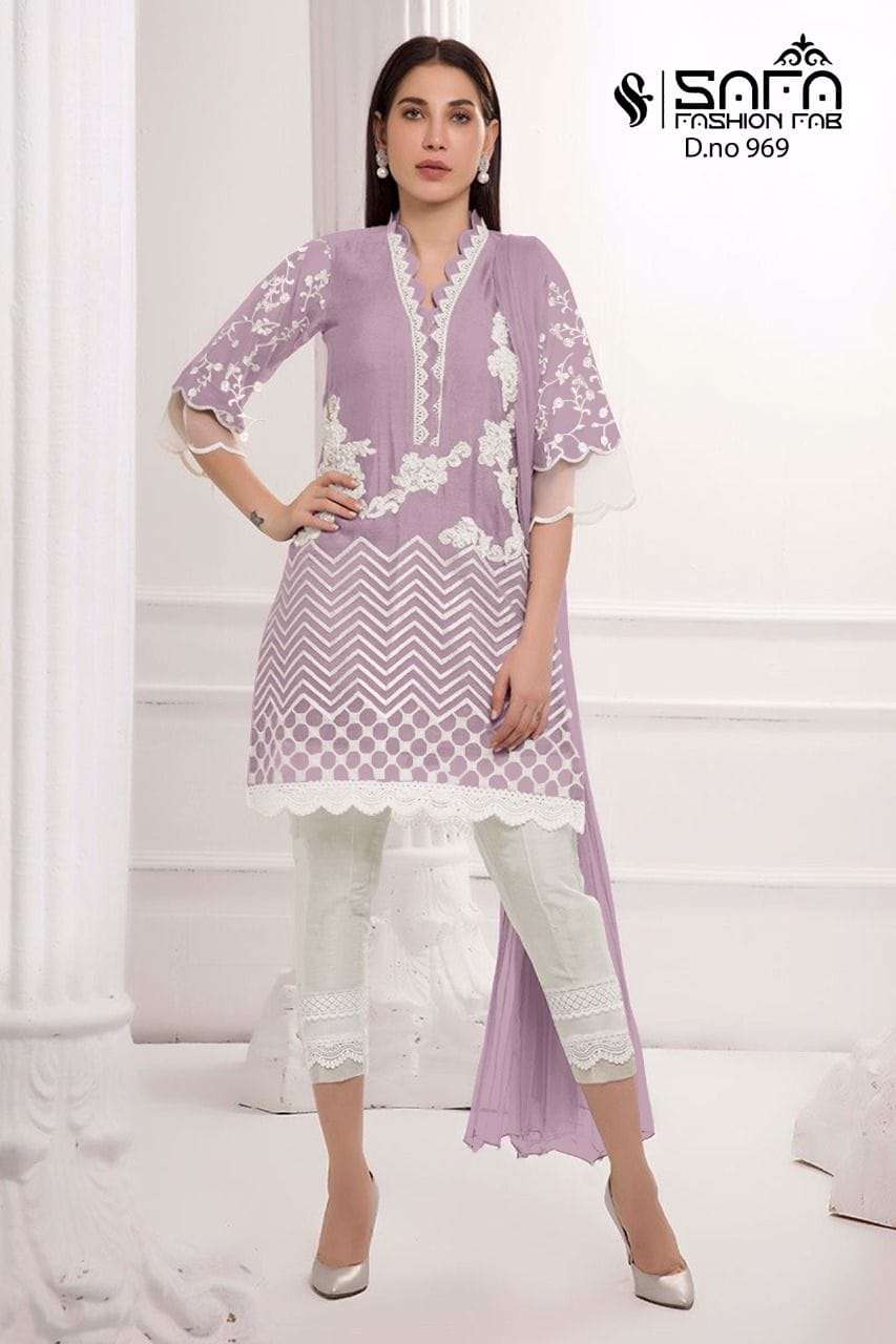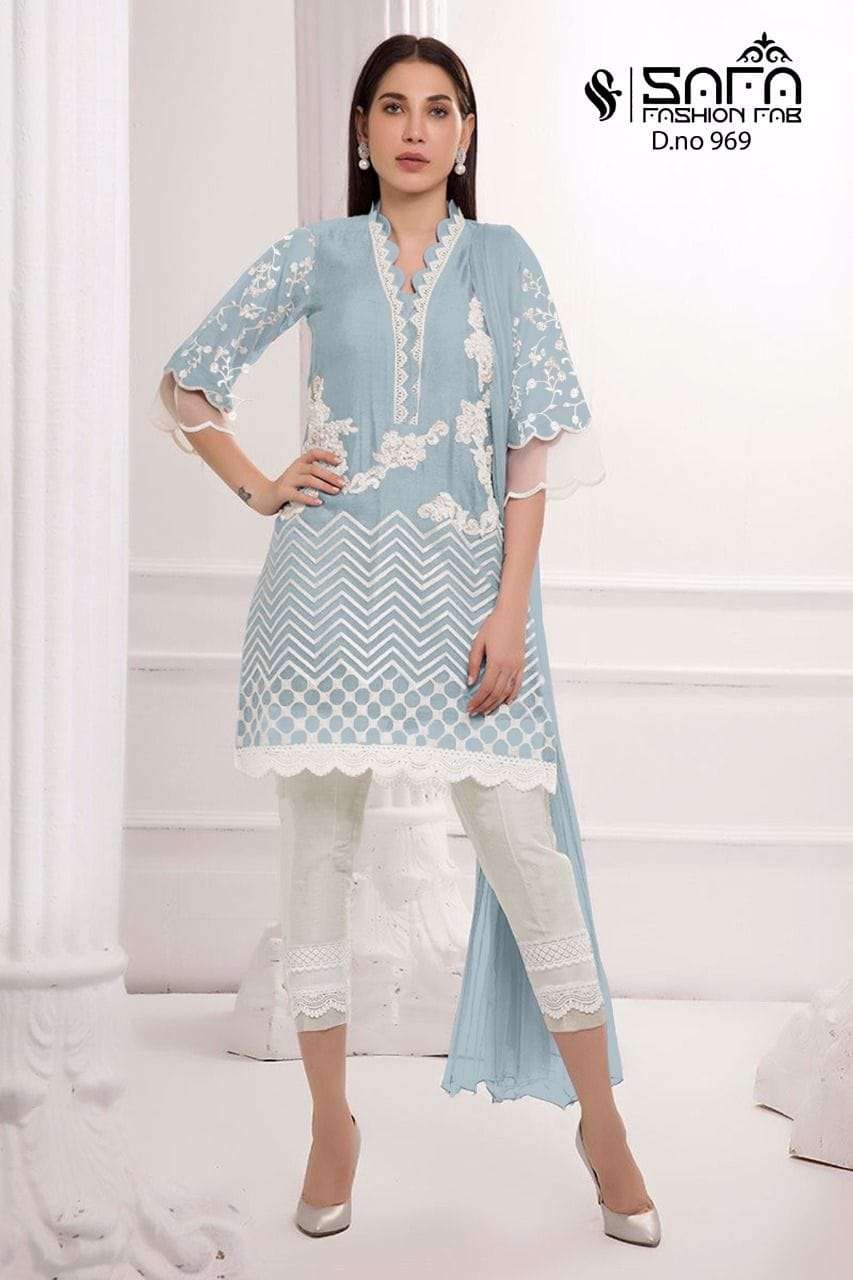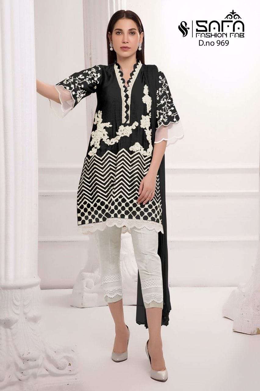 Safa fashion fab     (D.no=969) We are Introducing our LUXURY PRET FORMAL WEAR  COLLECTION To Make You Unique and Classy.. With Supirier Quality and Affordable Price  S.F.=969 by SAFA FASHION  FAB Description  Designer Embroidered Tunic with Sleeves paired with *Designer Cigarette pants*With  Embroidery work Details Top:- Pure gorgette Fabric Bottom :- Cotton Stretchable Fabrics Duptta :- Heavy Chinon Duptta Inner-Heavy Santoon Colour   Pink,D blue,,Black        Size Chart Top xl size chest (42) Bottom xl size (38) Rate- 1299/- Full set available      Colour may slightly vary due to light effect Book Fast Limited Stock        Dlv.- Ready |