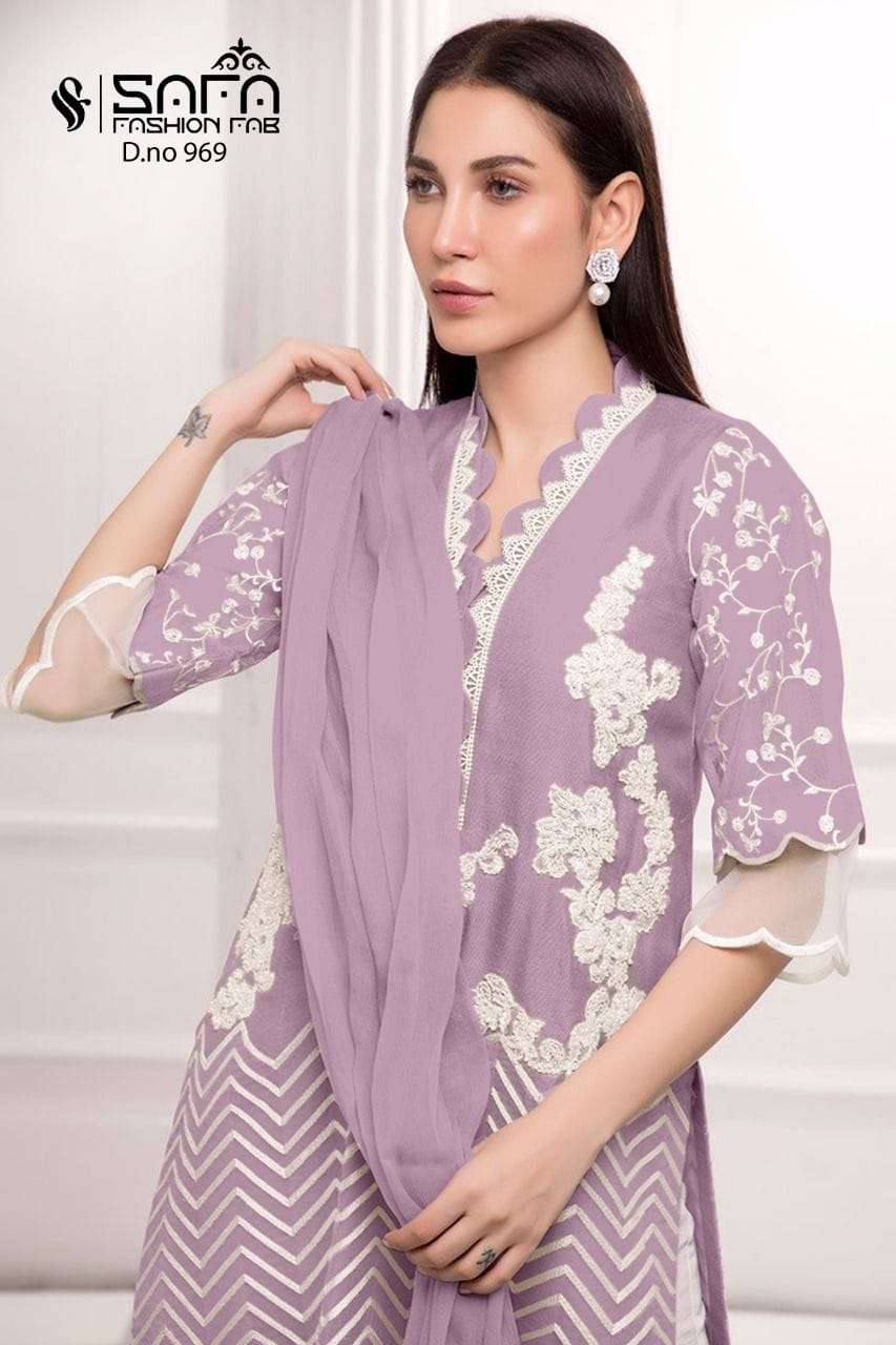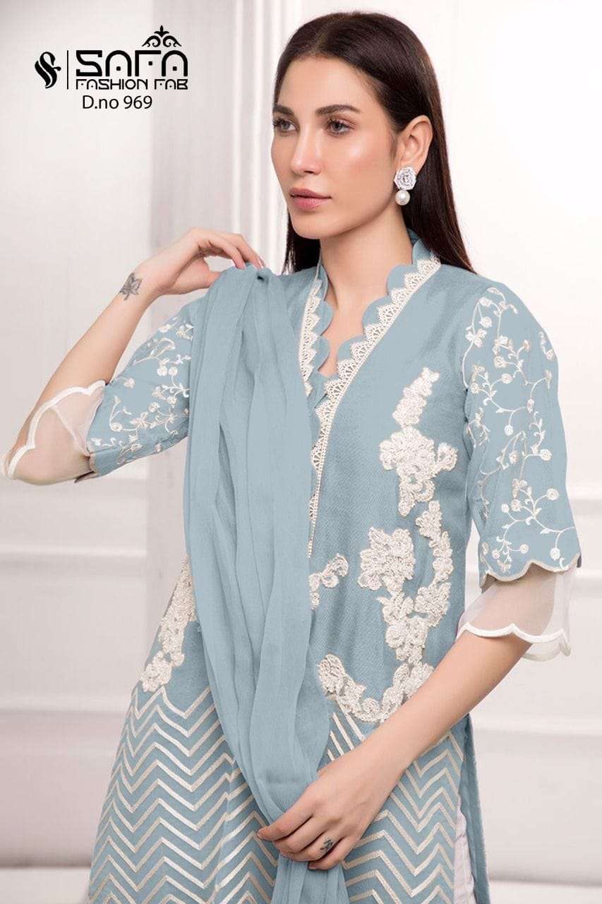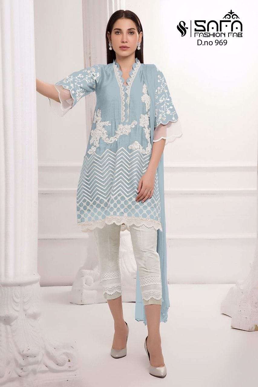 Safa fashion fab     (D.no=969) We are Introducing our LUXURY PRET FORMAL WEAR  COLLECTION To Make You Unique and Classy.. With Supirier Quality and Affordable Price  S.F.=969 by SAFA FASHION  FAB Description  Designer Embroidered Tunic with Sleeves paired with *Designer Cigarette pants*With  Embroidery work Details Top:- Pure gorgette Fabric Bottom :- Cotton Stretchable Fabrics Duptta :- Heavy Chinon Duptta Inner-Heavy Santoon Colour   Pink,D blue,,Black        Size Chart Top xl size chest (42) Bottom xl size (38) Rate- 1299/- Full set available      Colour may slightly vary due to light effect Book Fast Limited Stock        Dlv.- Ready |