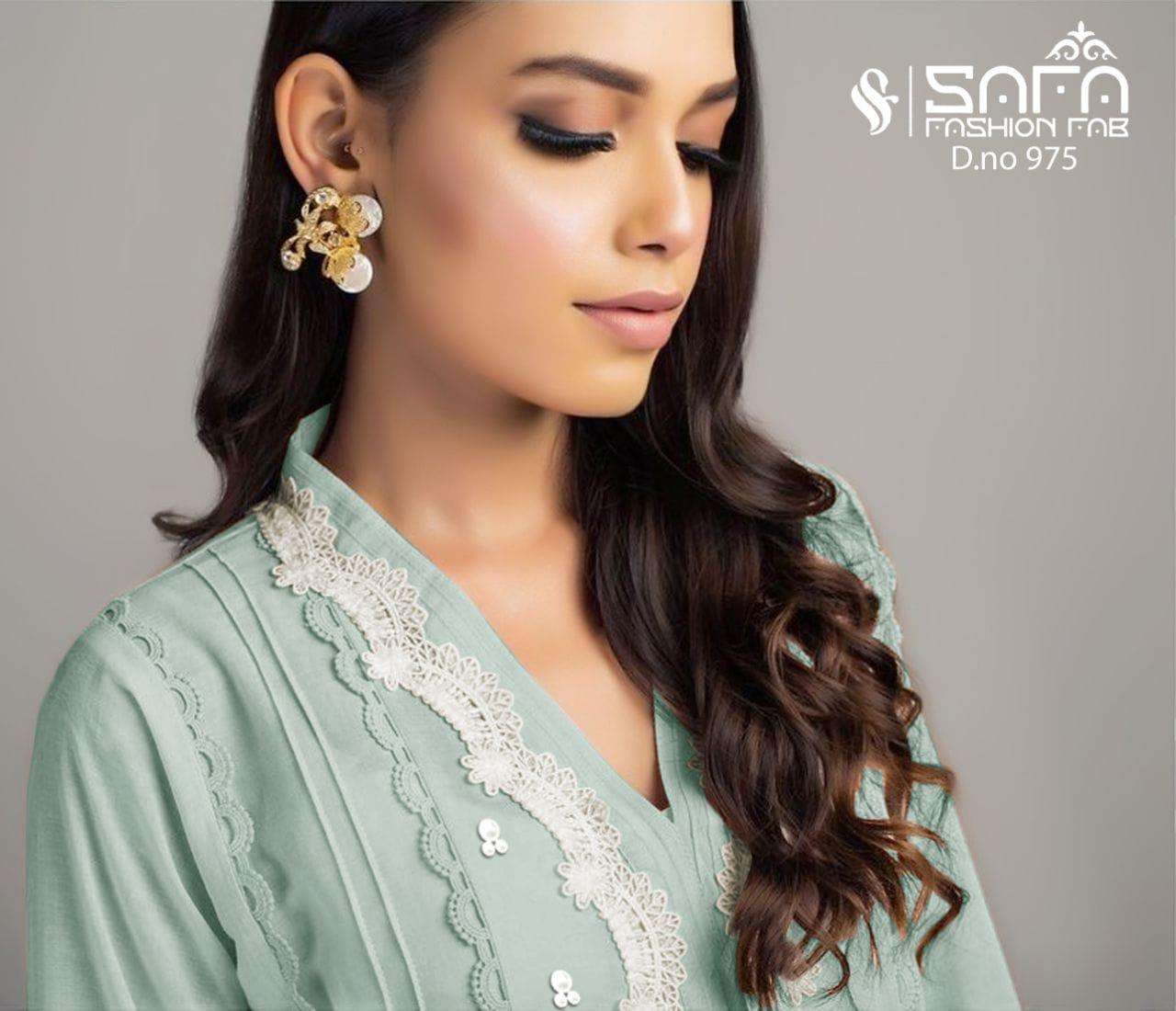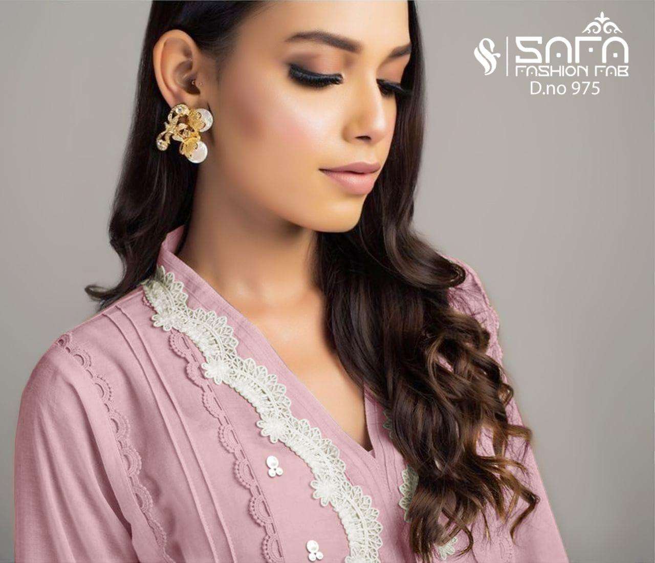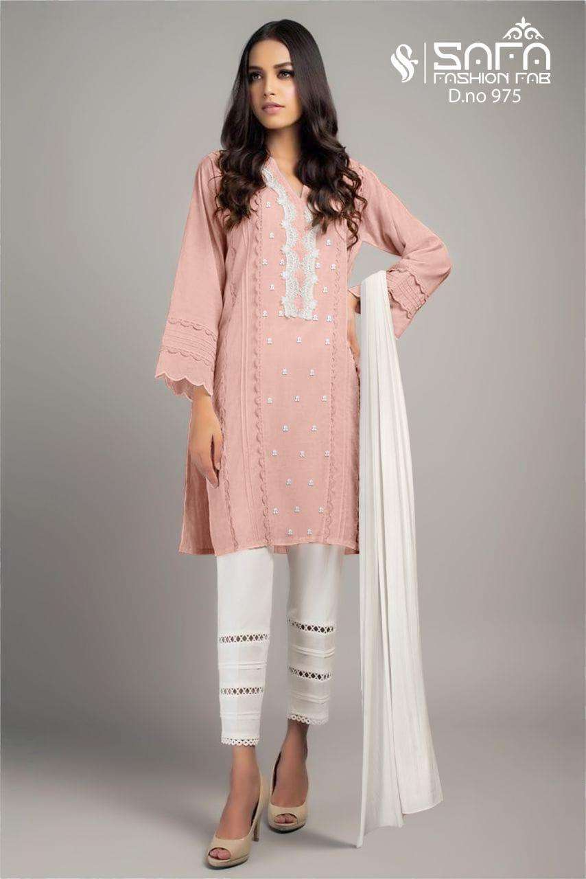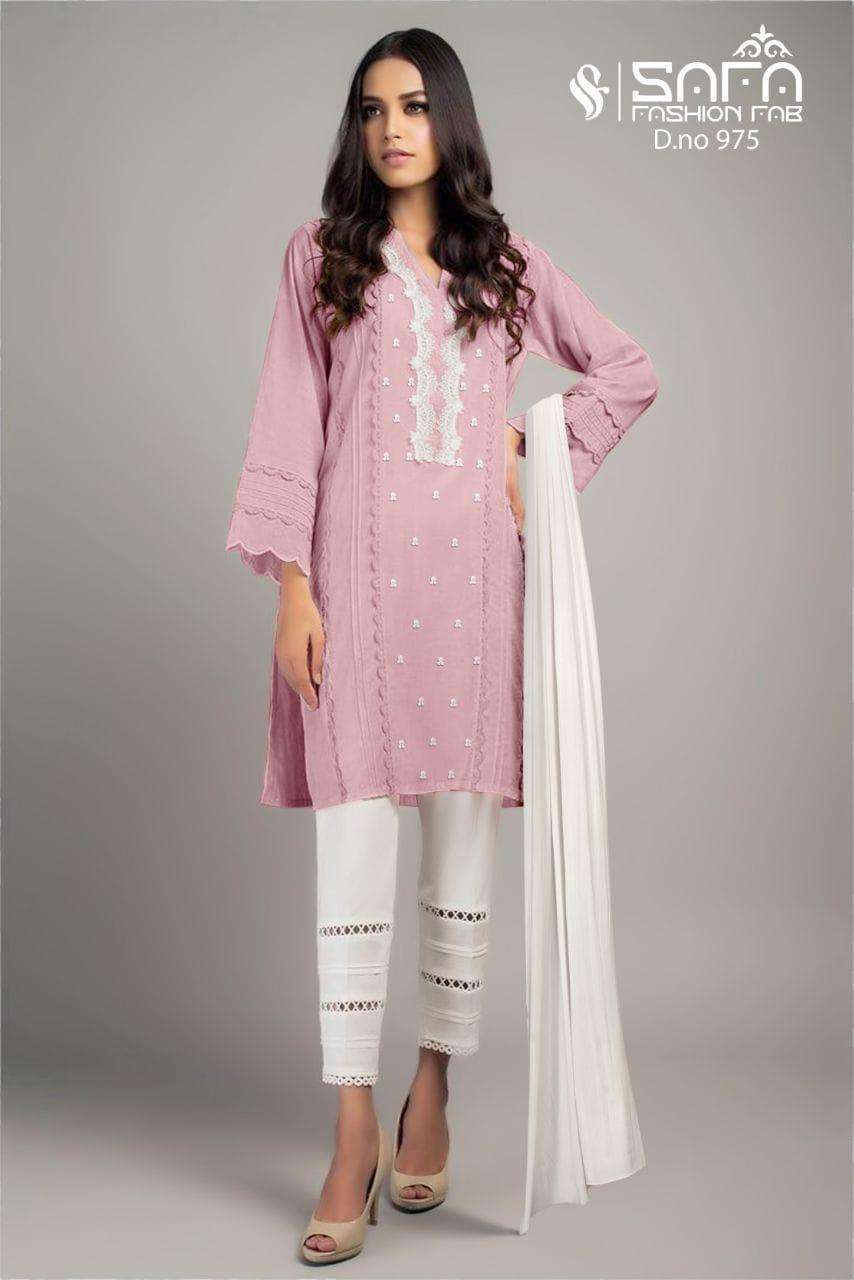 Safa fashion Fab       (S.F.975) We are Introducing our LUXURY PRET FORMAL WEAR  COLLECTION To Make You Unique and Classy.. With Supirier Quality and Affordable Price  (S.F.975) by SAFA FASHION  FAB Description  Designer Embroidered Tunic with Sleeves paired with Designer Cigarette pants*With  *Designer Duptta Details Top:-PureGeorgette Fabric Bottom :- Cotton Stretchable Fabric Duppta :- Designer Duptta Inner:- Pure Sentoon Colour  Pink.pich.green        Size Chart Top xl size chest (42) Bottom xl size (38) Rate 1099/- Full set available      Colour may slightly vary due to light effect Book Fast Limited Stock        |