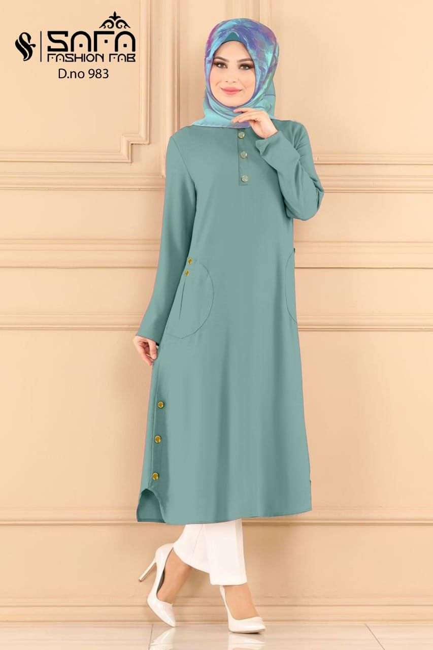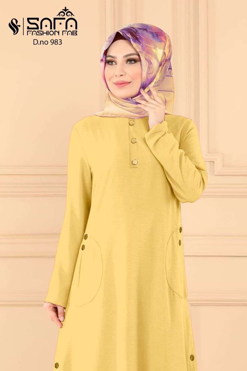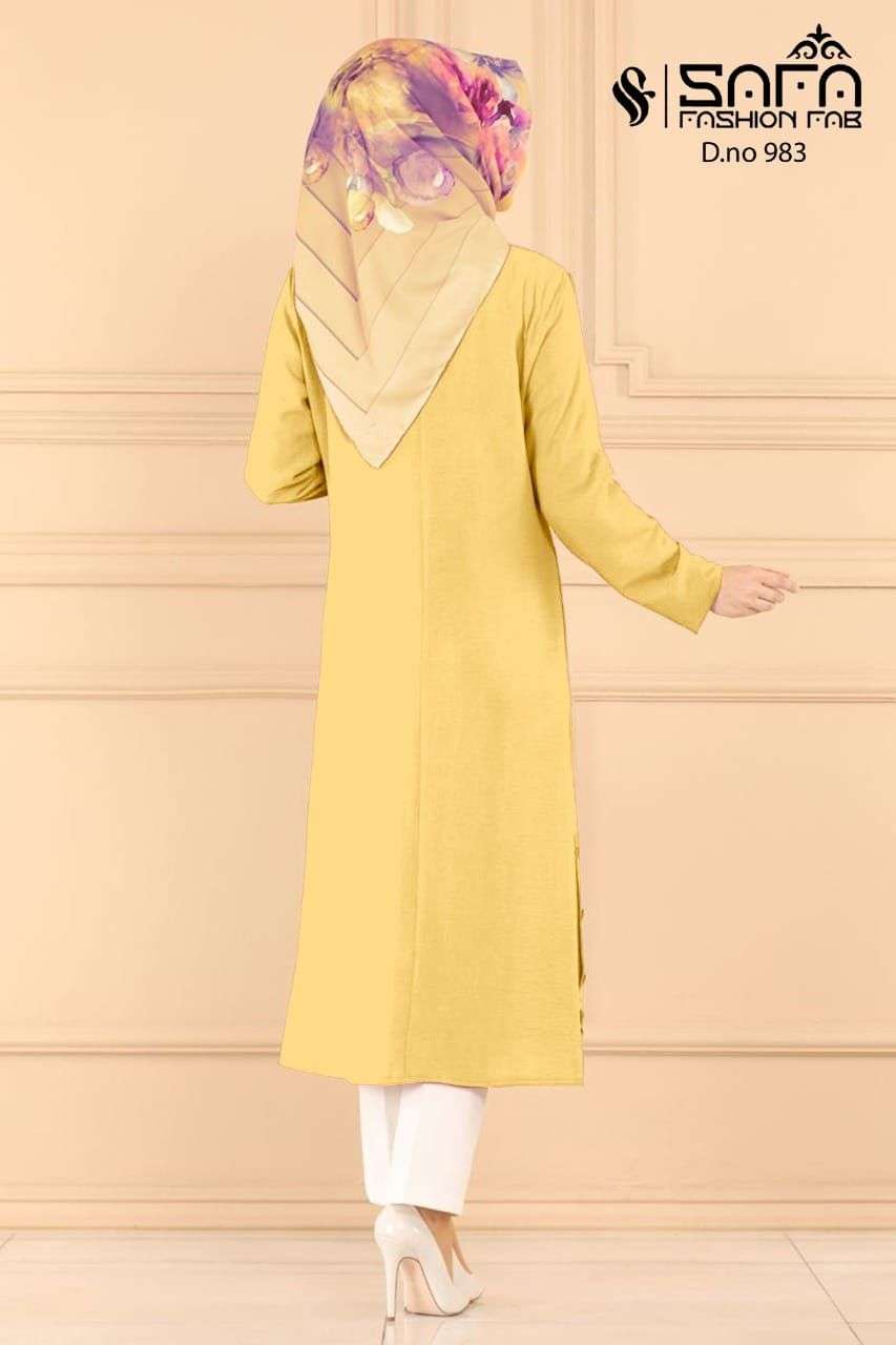 Safa fashion fab      (D.no=983) We are Introducing our LUXURY PRET FORMAL WEAR  COLLECTION To Make You Unique and Classy.. With Supirier Quality and Affordable Price  S.F.983 by SAFA FASHION  FAB Description  Designer Tunic with Sleeves paired with Designer Cigarette pants*With  *Designer Duptta Details Top:-Pure Strachable Fabric Bottom :- Cotton Stretchable Fabric Duppta :- Designer Duptta Colour  Yellow . Pich.Rama        Size Chart Top xl size chest (42) Bottom xl size (38) Rate 950/- Full set available      Colour may slightly vary due to light effect Book Fast Limited Stock        Ready To Ship |