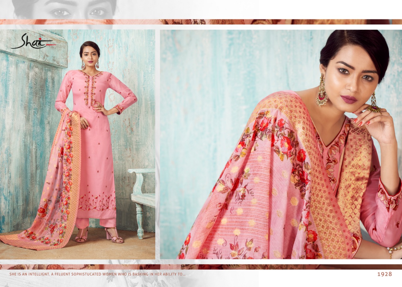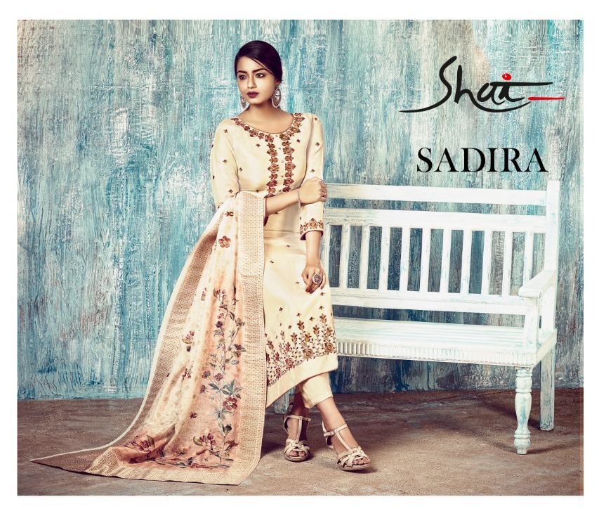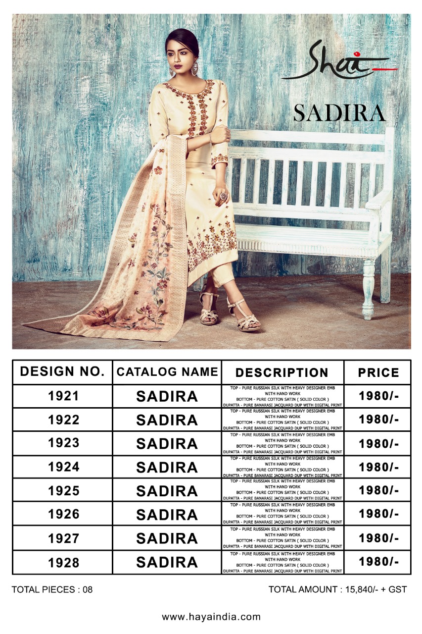 Brand - Shai . Catlog name - SADIRA . 08 Designs Singal Colour Fabric Details Top = Pure Russian Silk With Heavy Designer Emb With Hand Work Bottom = Pure Cotton Satin(Solid Color) Dupatta = Pure Banarasi Jacquard Dupatta With Digital Print Total pieces = 08 Rate = 1980/- Delivery 5-6 days . Set To Set. GST 5 Percent Extra |