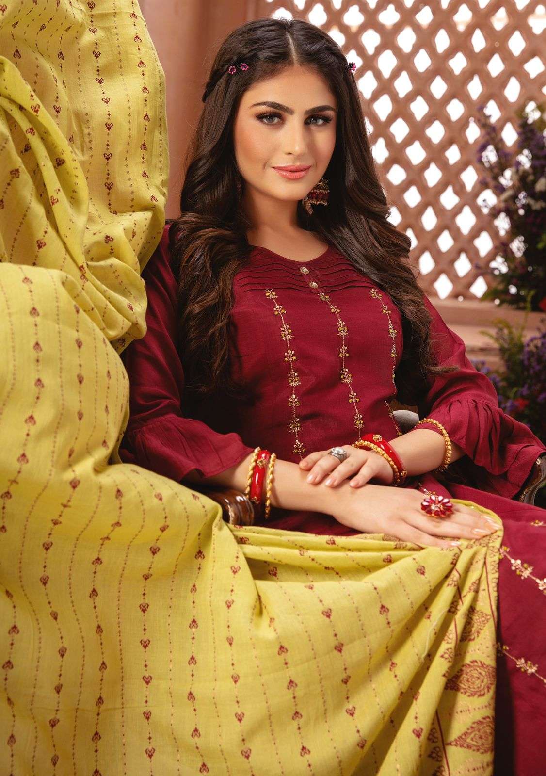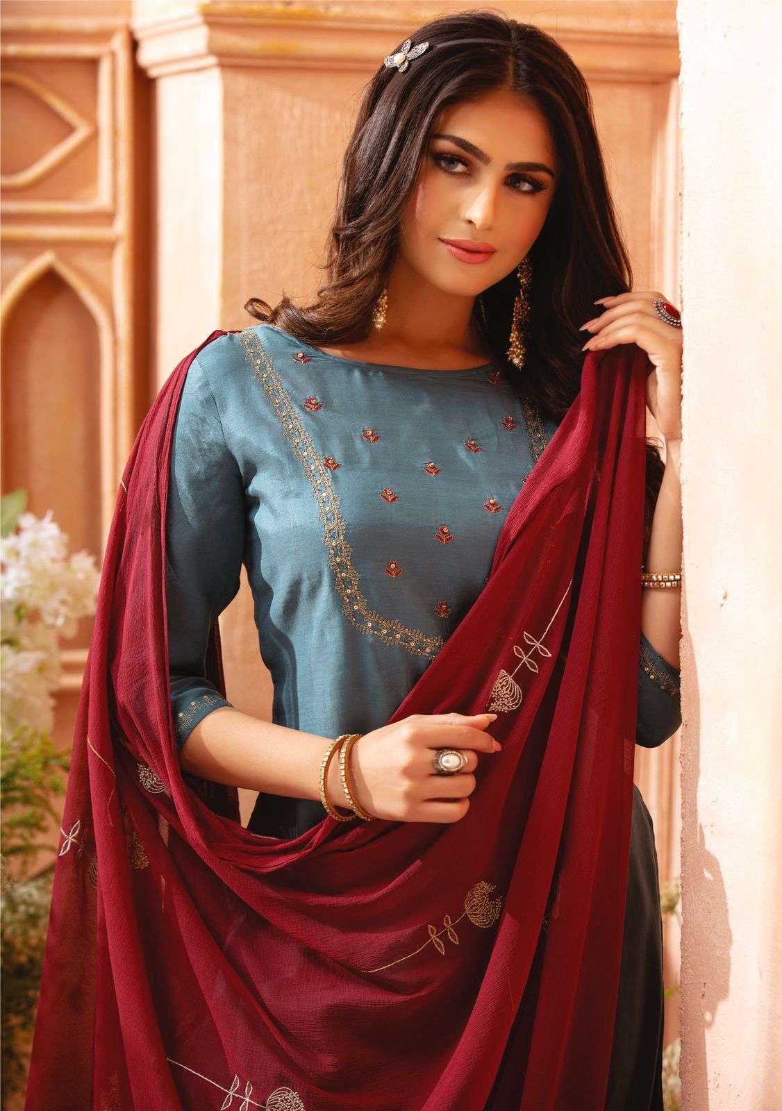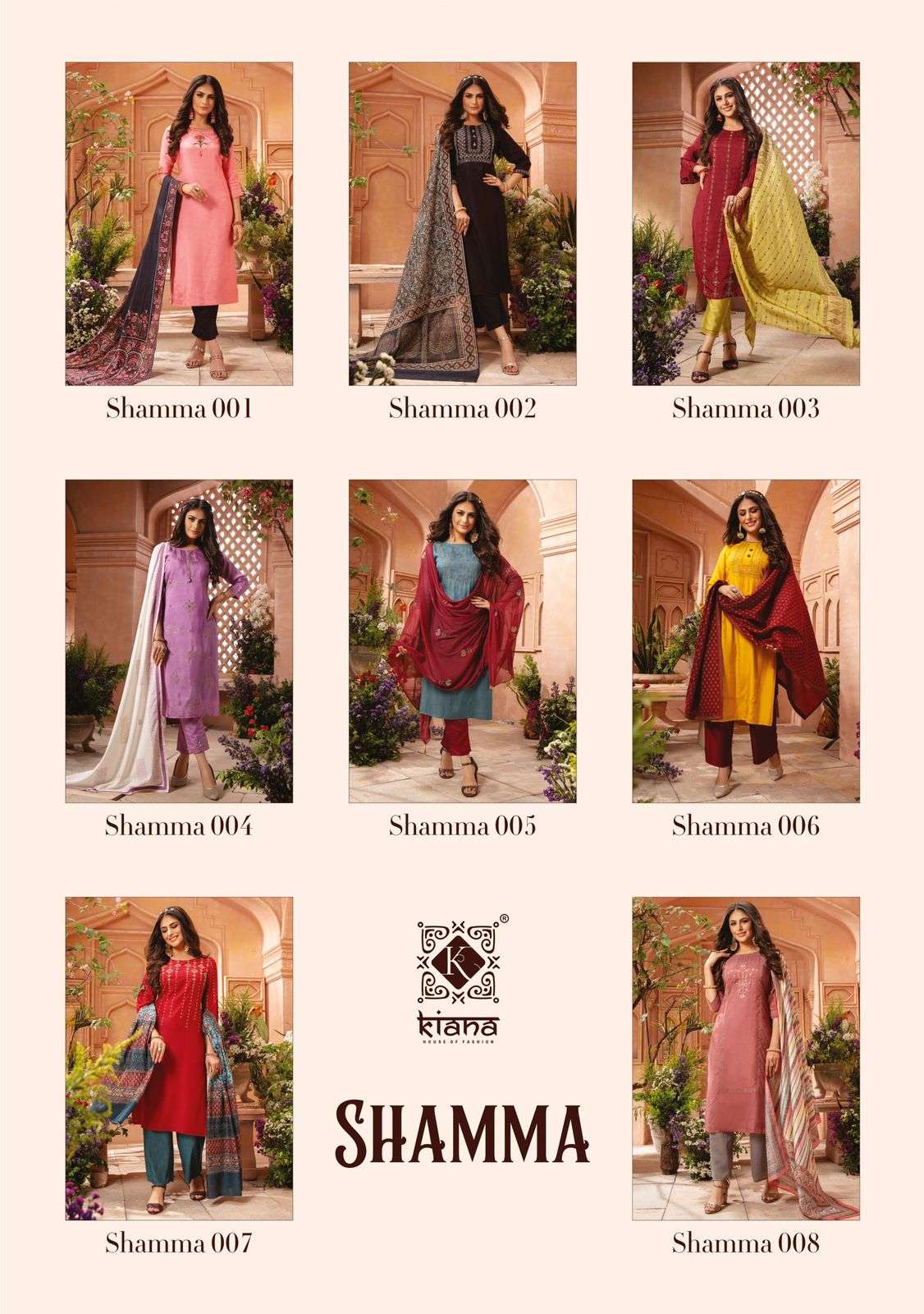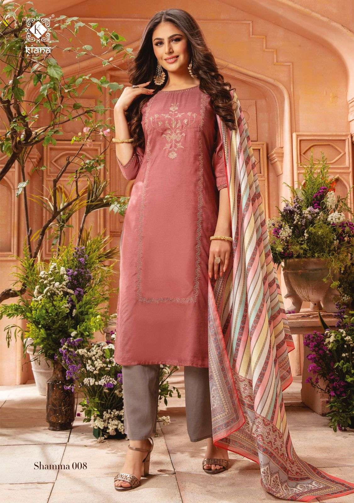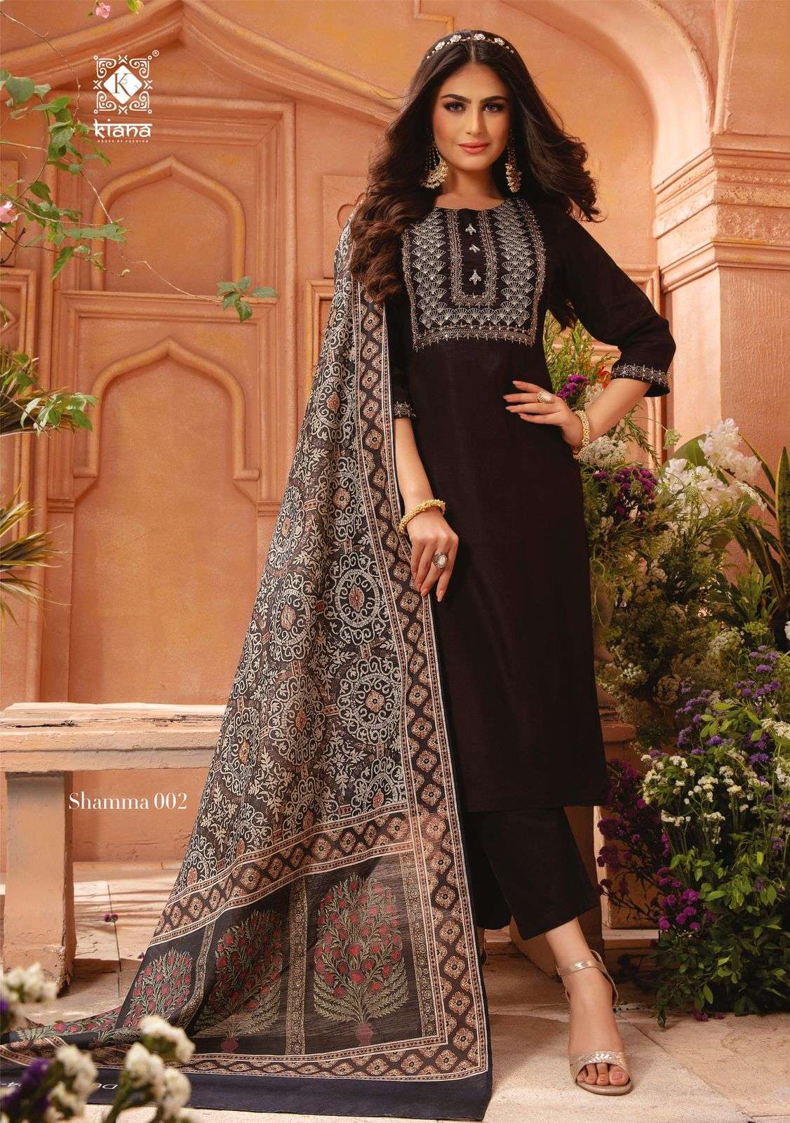 KIANA  House of Fashion Catalogue Name-  New series SHAMMA     Details TOP :- Pure heavy Maslin with hand work n moti n pul work wid heavy cotton mal Inner Bottom:-  Pure Heavy Jam satin silk Dupatta:-  silk dupatta with embroidery work and mal cotton dupatta with print and digital print Size:- M(19) L(20) XL(21) 2XL(22) 3XL(23) Designs :- 8 pcs   Rate - 1245/- per pcs Set to set. Delivery 3-4 days |