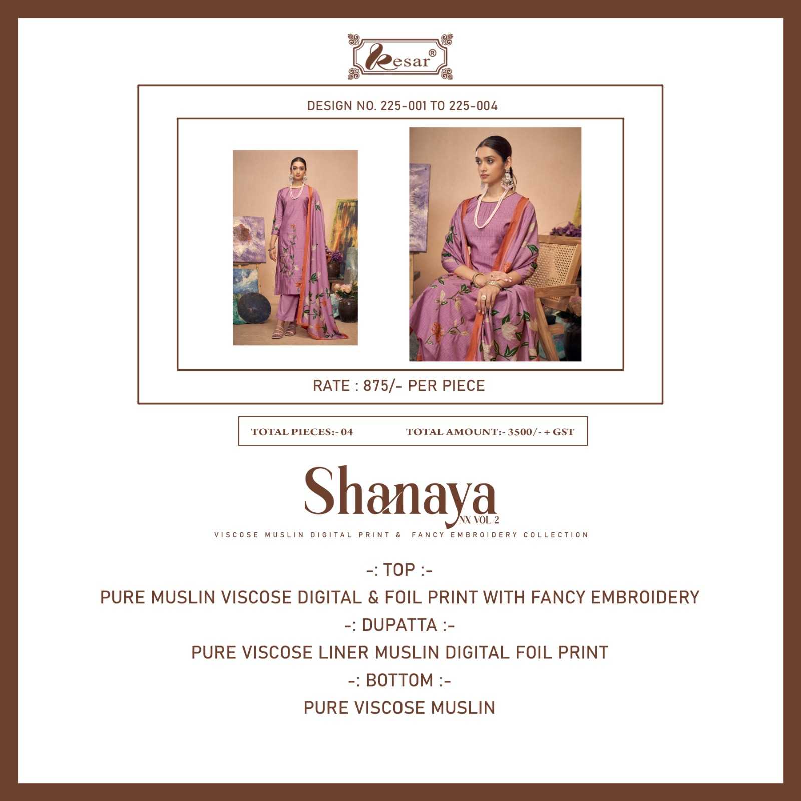 🙏 Hello Dear customer🙏 👌Shanaya-NX VOL-2👌 👌 Fabric Details 👌 *👖Bottom:- PURE VISCOSE MUSLIN *🧣Dupatta:- PURE VISCOSE LINER MUSLIN DIGITAL FOIL PRINT