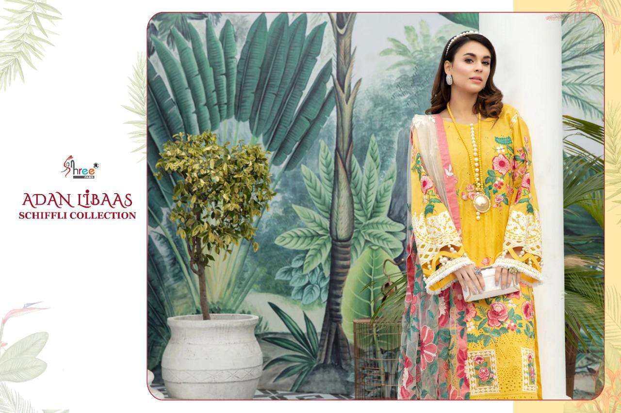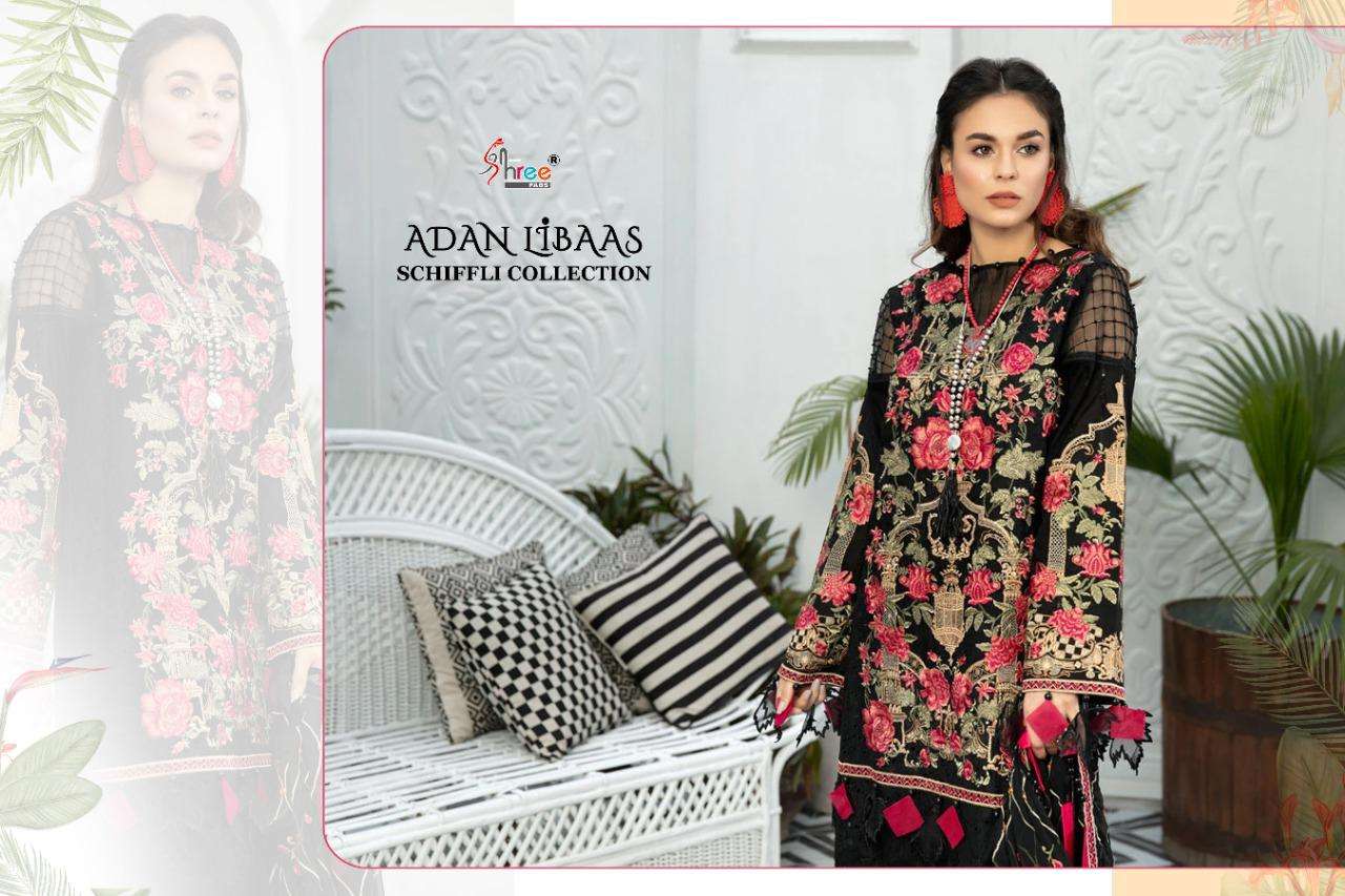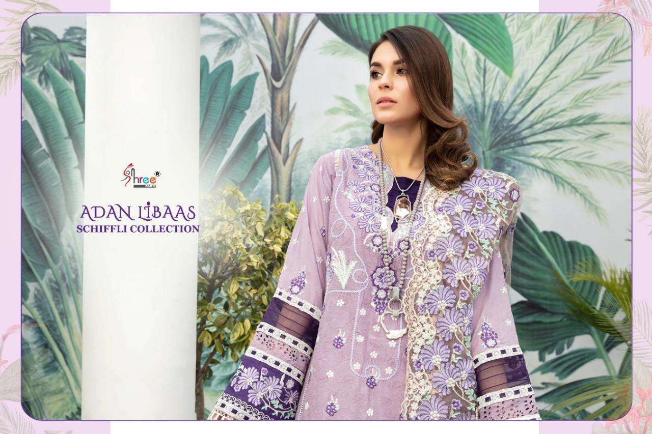 ADAN LIBAAS SCHIFFLI COLLECTION TOP PURE COTTON WITH HEAVY SELF EMBRODERY BOTTOM SEMILAWN DUPPTA BUTTERFLY EMBRODERD NET DES 5 RATE 1199 Shree fabs surat |