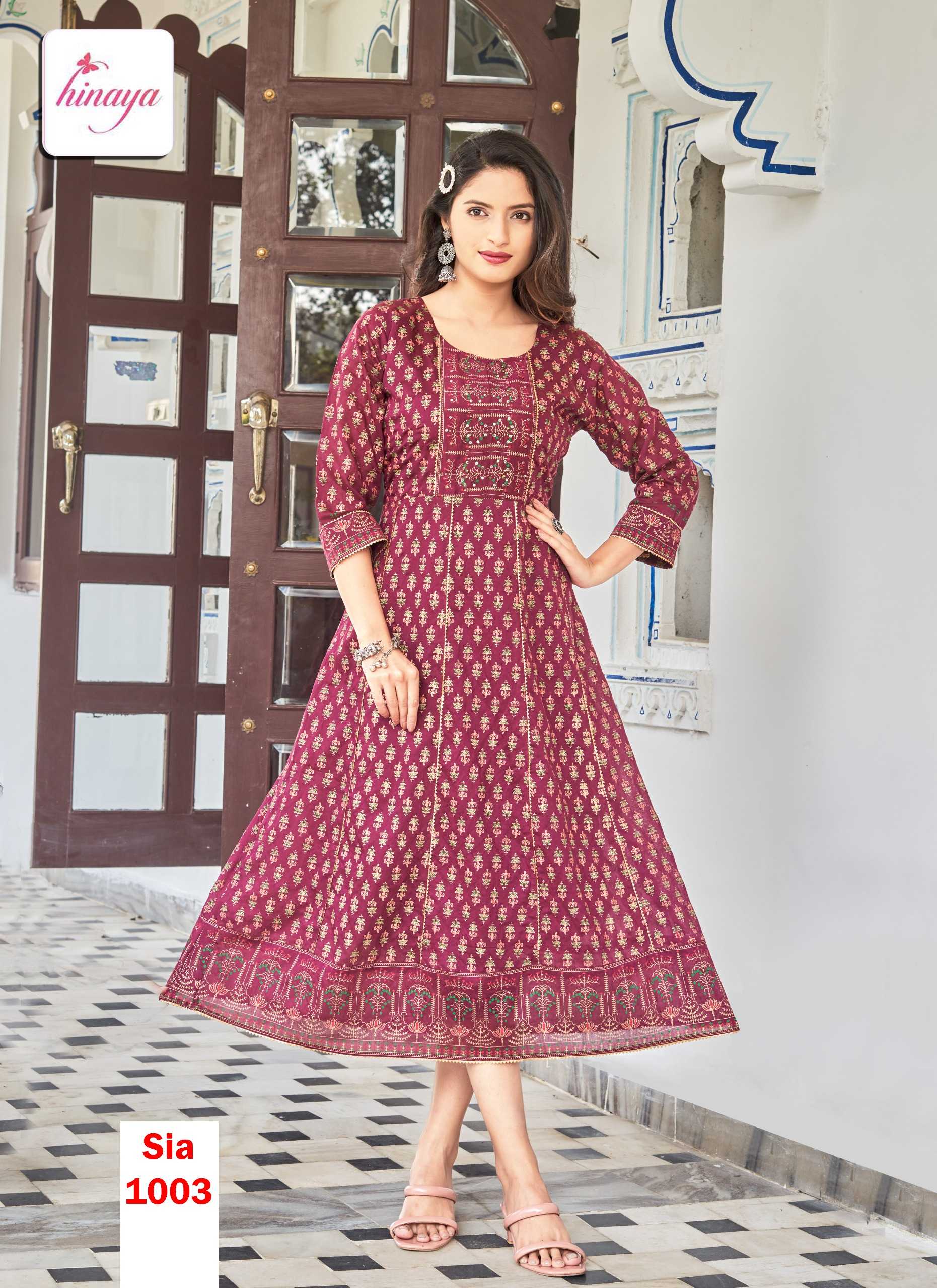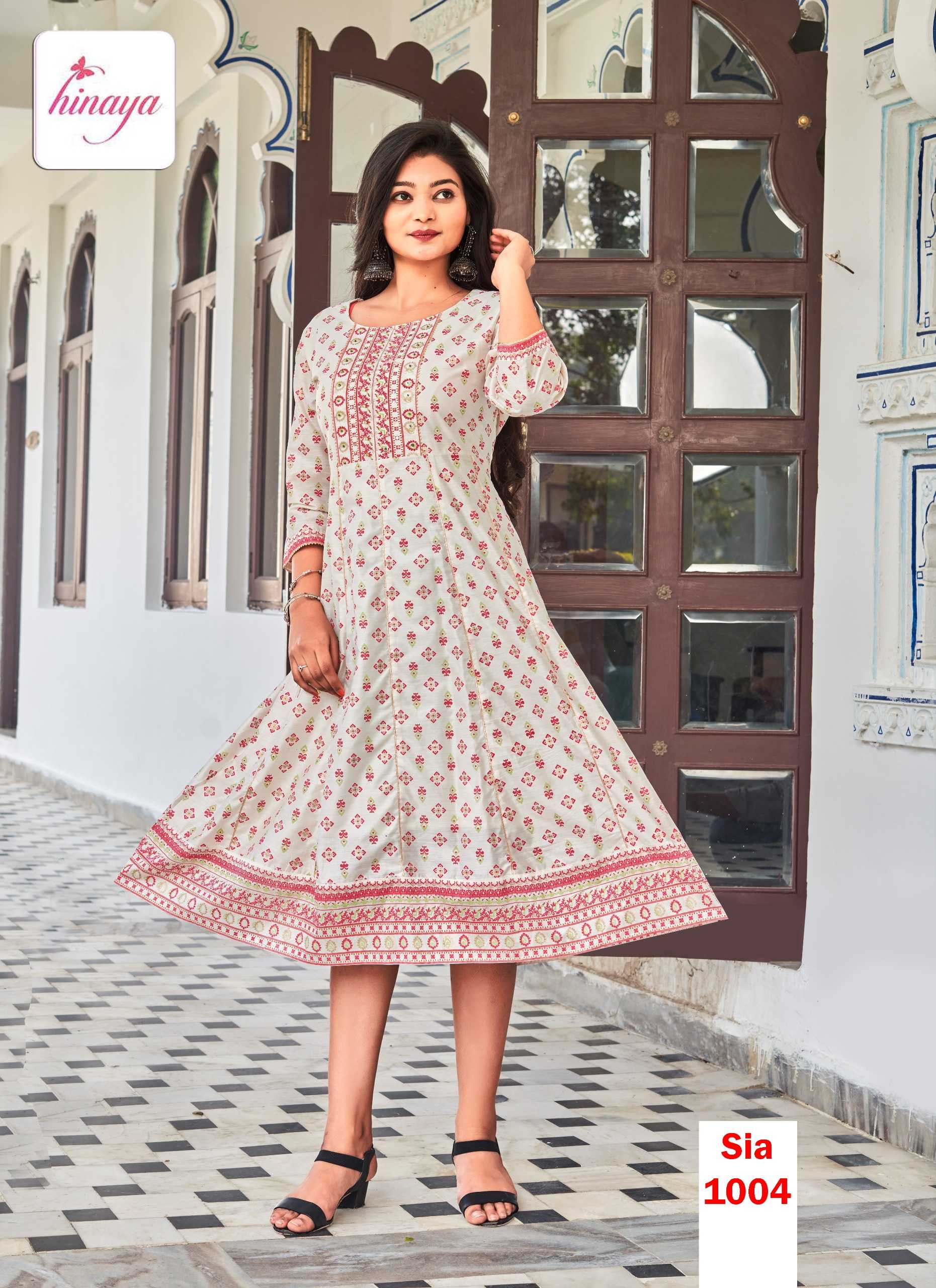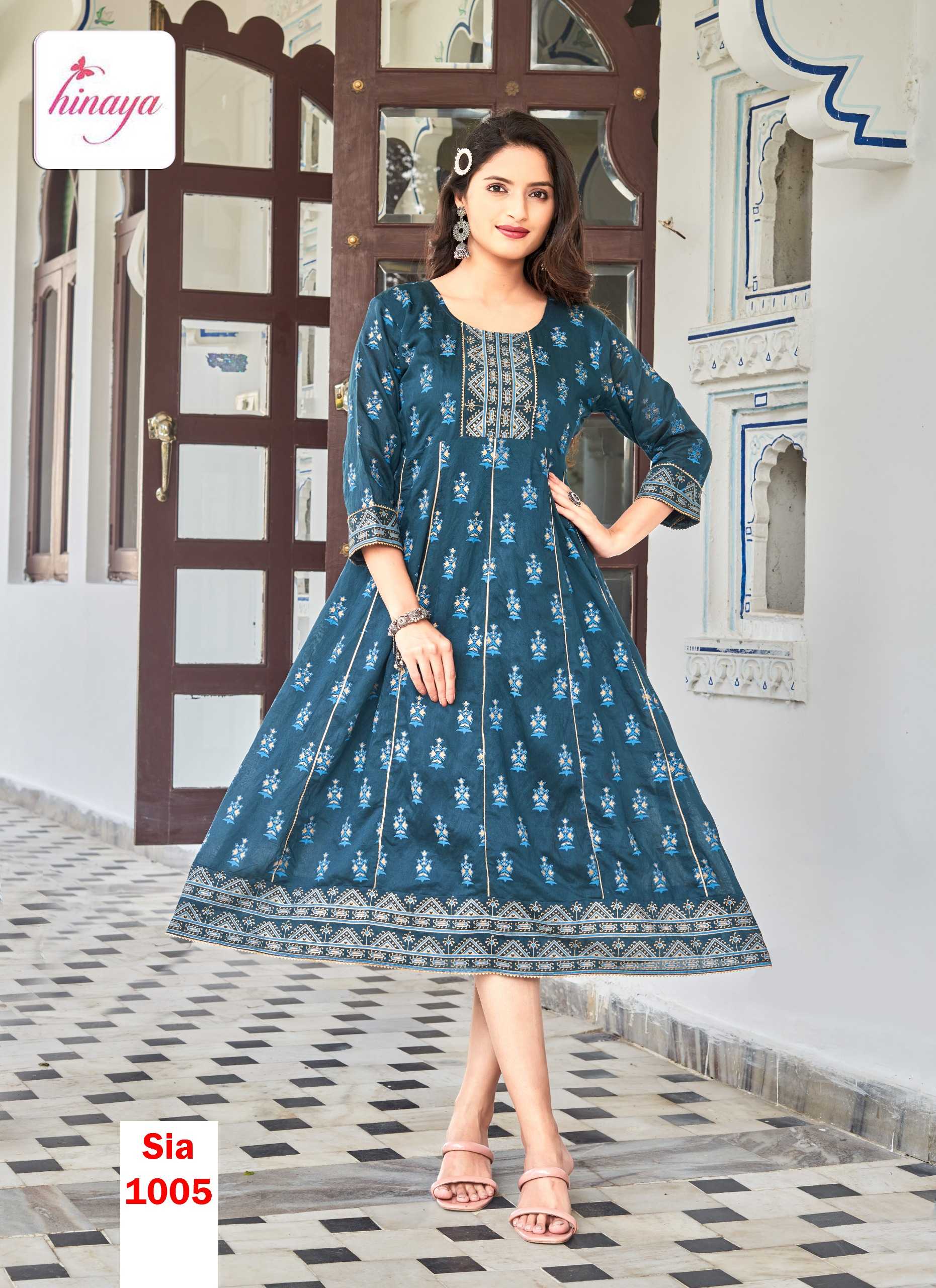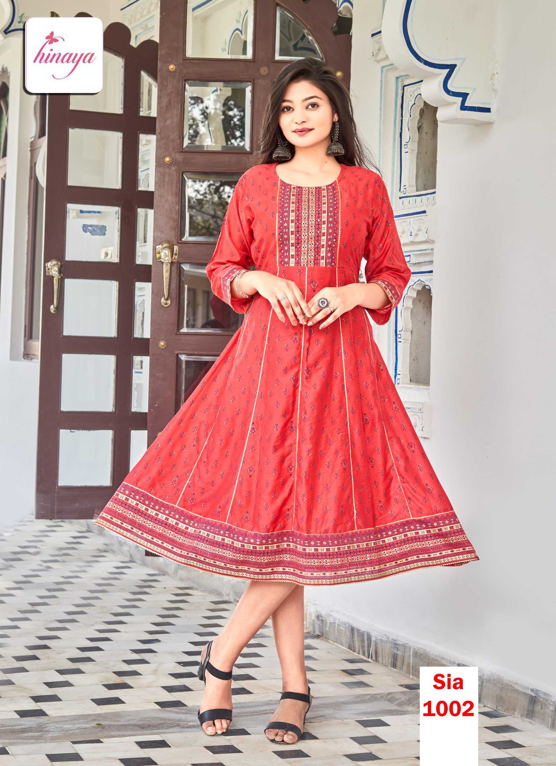 sia by hinaya trendy long chanderi silk full stitch flaired kurtis in kali pattern