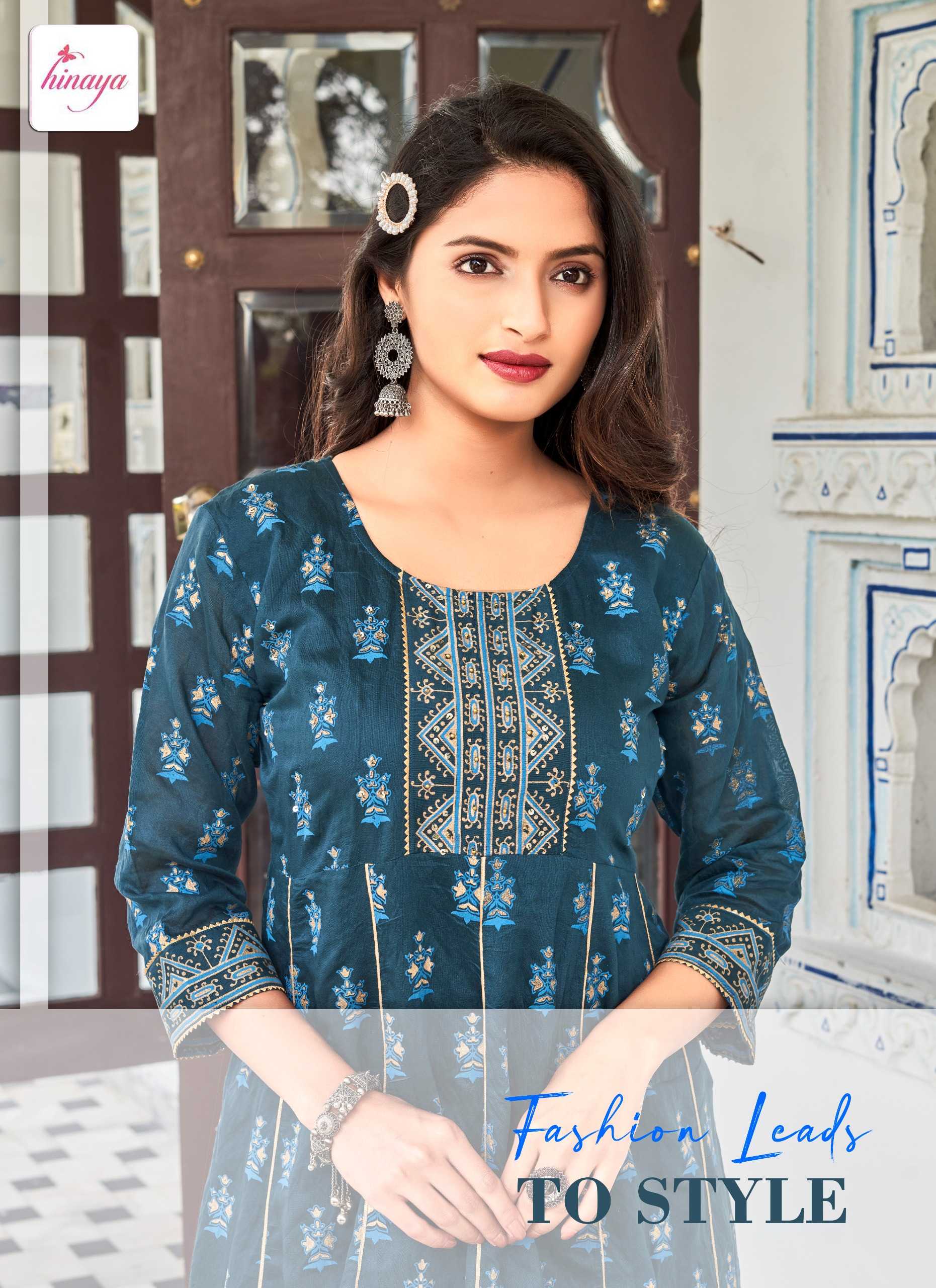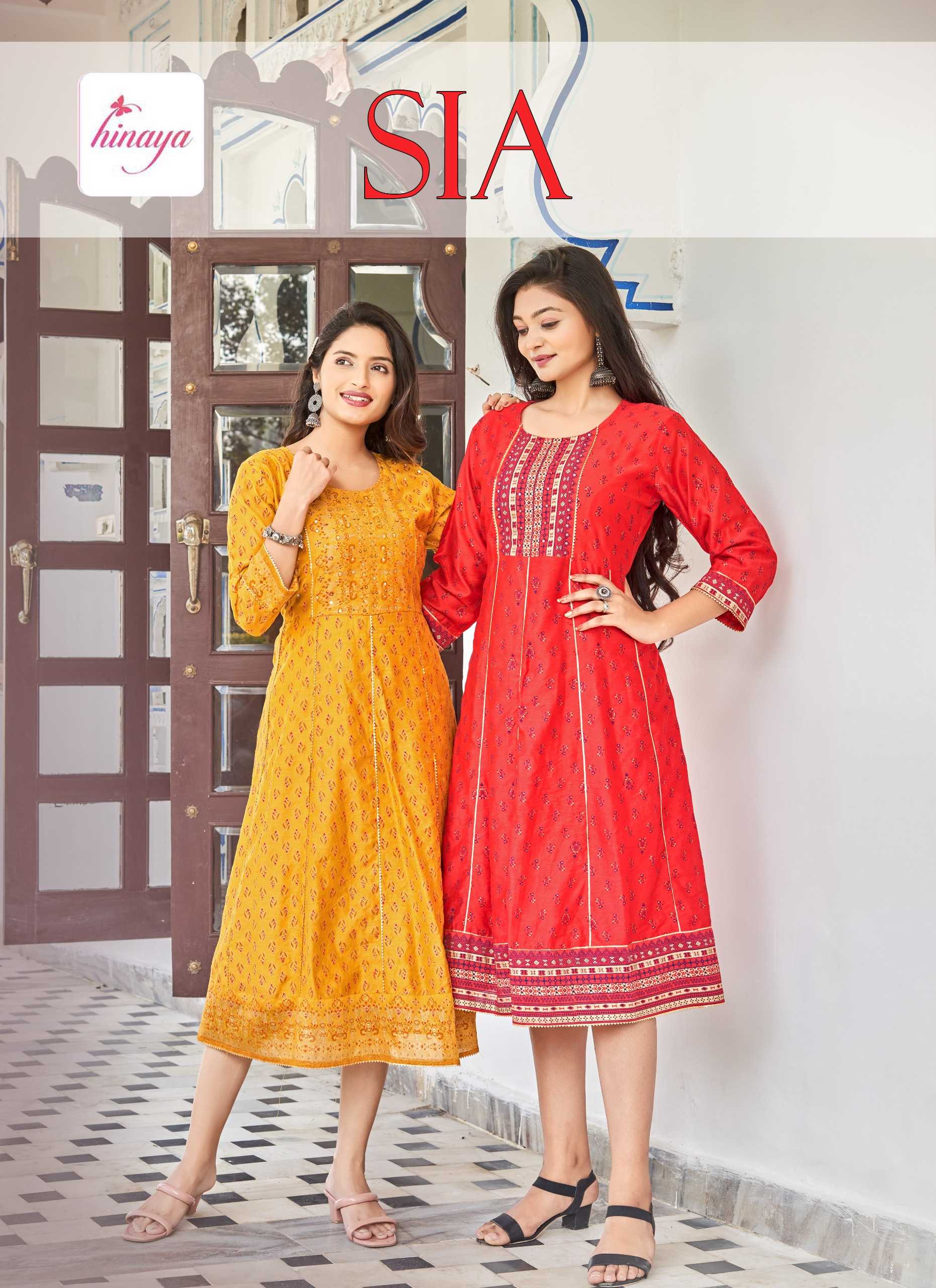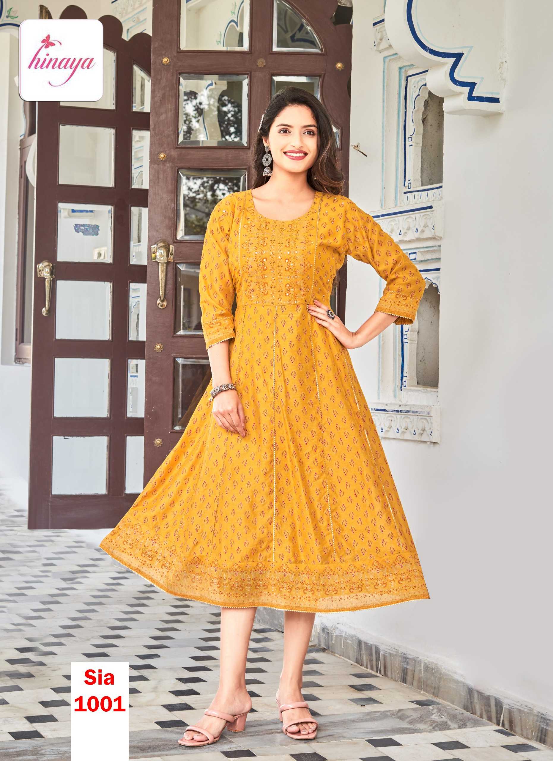 sia by hinaya trendy long chanderi silk full stitch flaired kurtis in kali pattern
