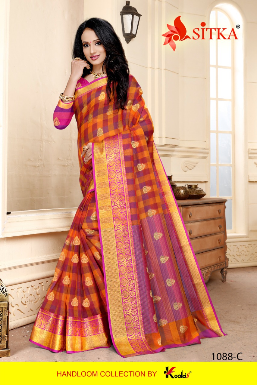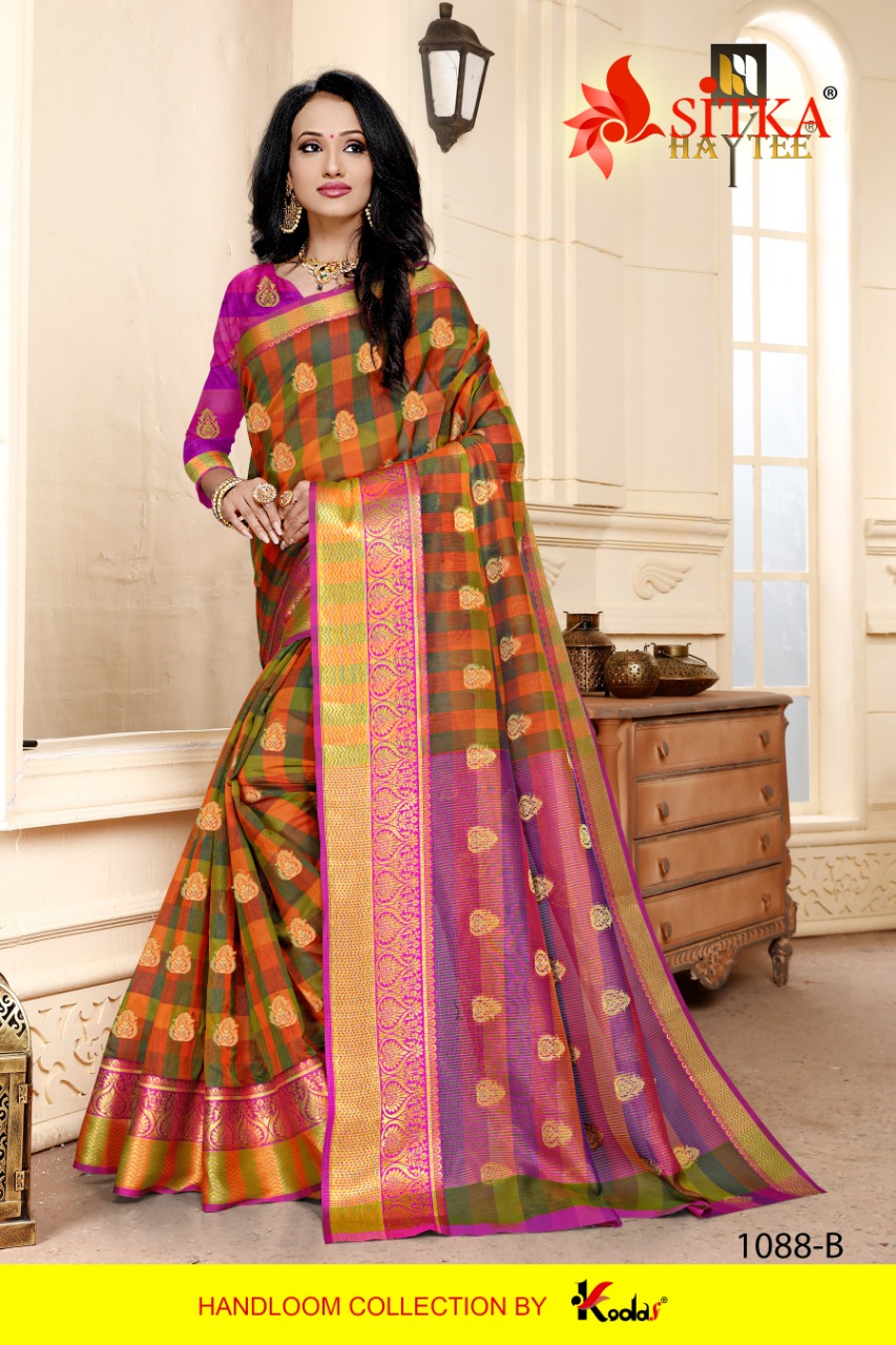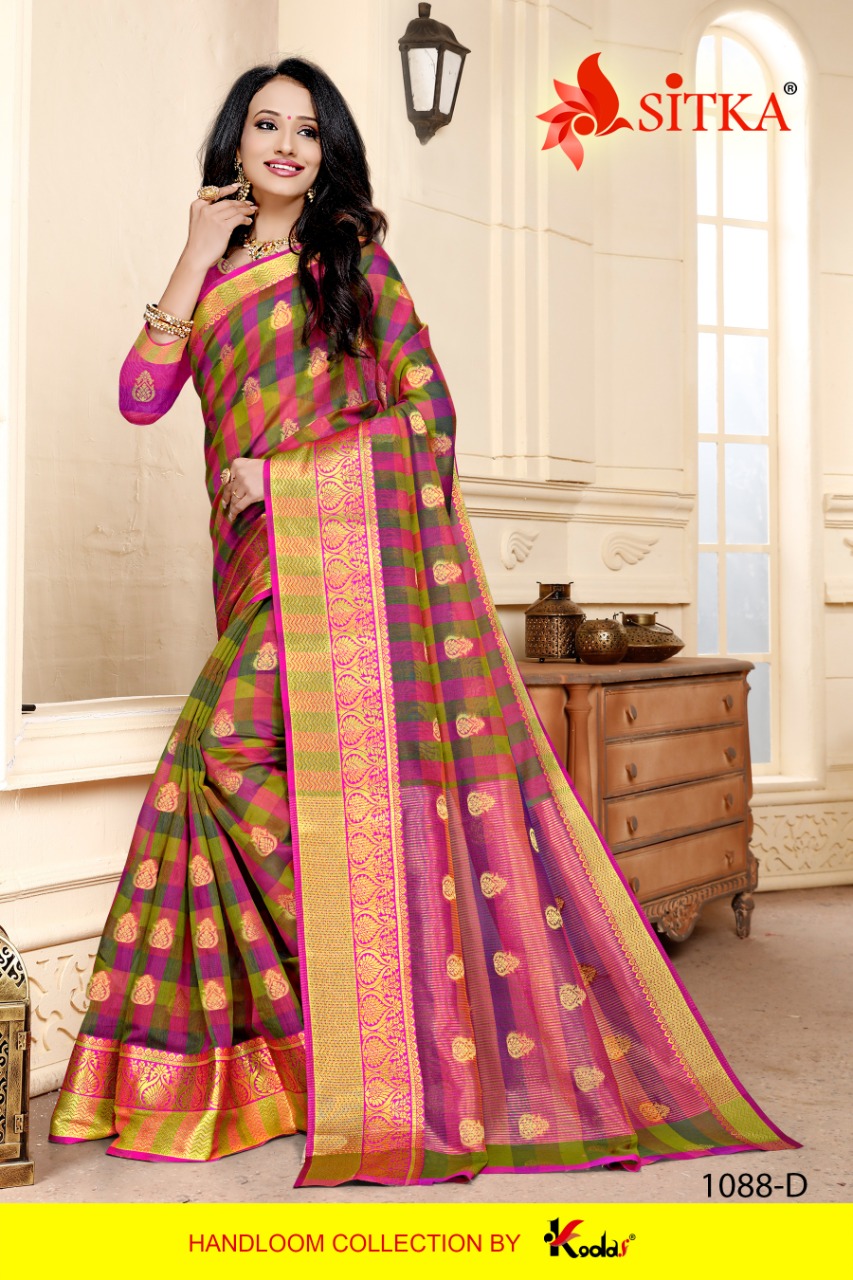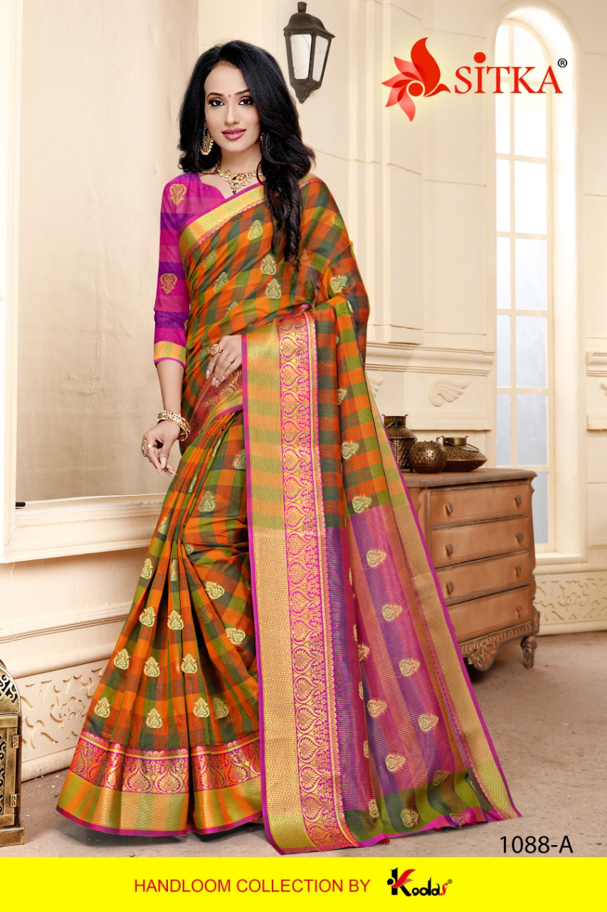SITKA Brand Launched New Saree catalog Catalog Name : AIR HOSTESS-1088 Fabric : HANDLOOM COTTON SILK CHECKS STYLE FANCY SAREE MOQ - 4 Box Rate : 580/- +5 % GST Without Box Rate : 560/- + 5% GST Length : 6.3 mtr Only full set |