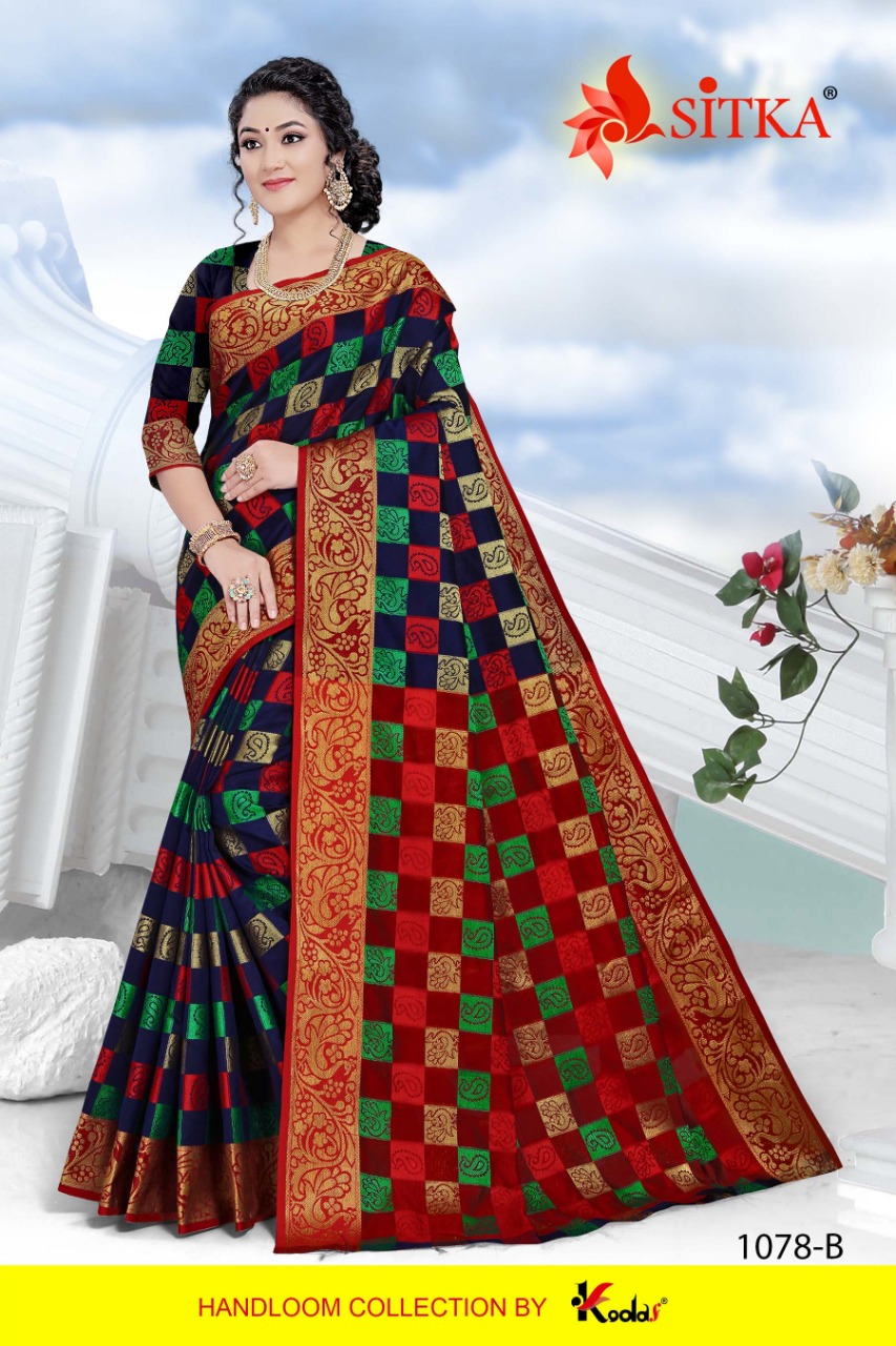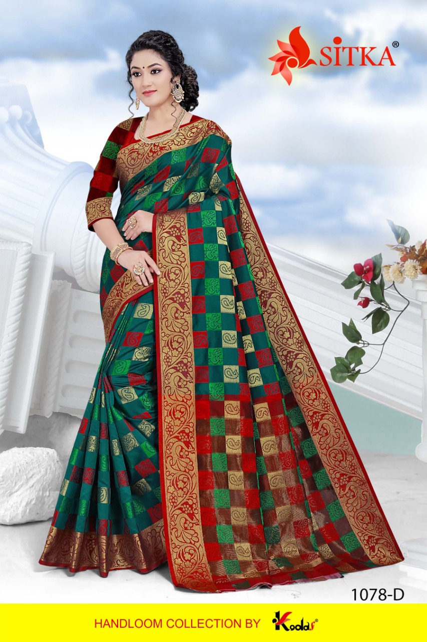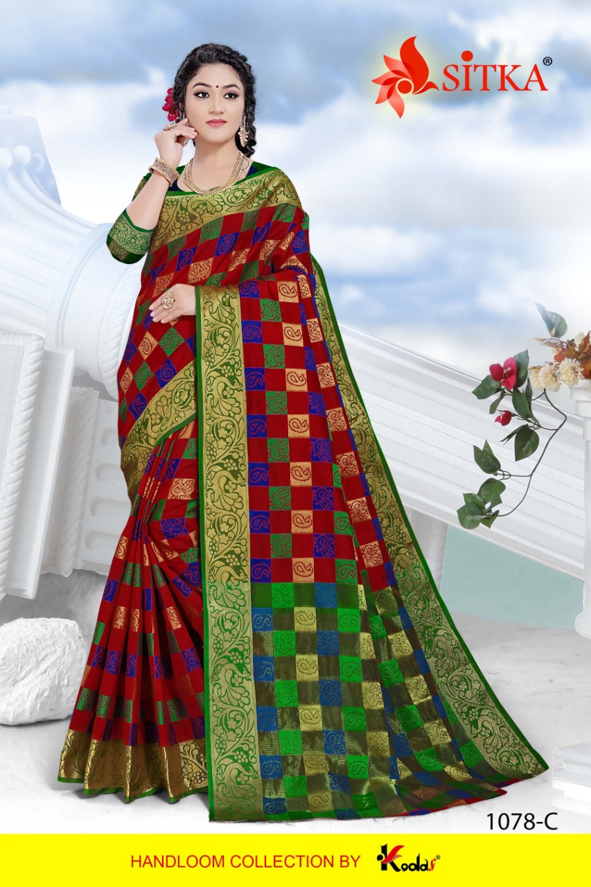 SITKA Brand Launched New Saree catalog Catalog Name : RANGOON-1078 Fabric : HANDLOOM COTTON SILK CHECKS STYLE SAREE MOQ - 5 Box Rate : 490/- +5 % GST Without Box Rate : 470/- + 5% GST Length : 6.3 mtr Only full set |