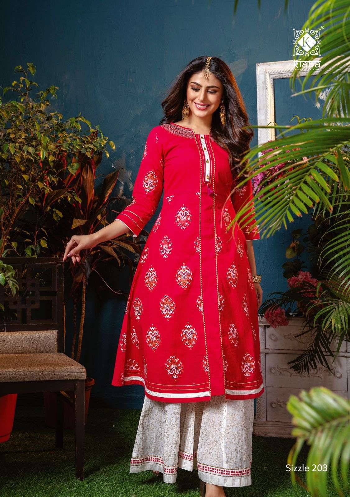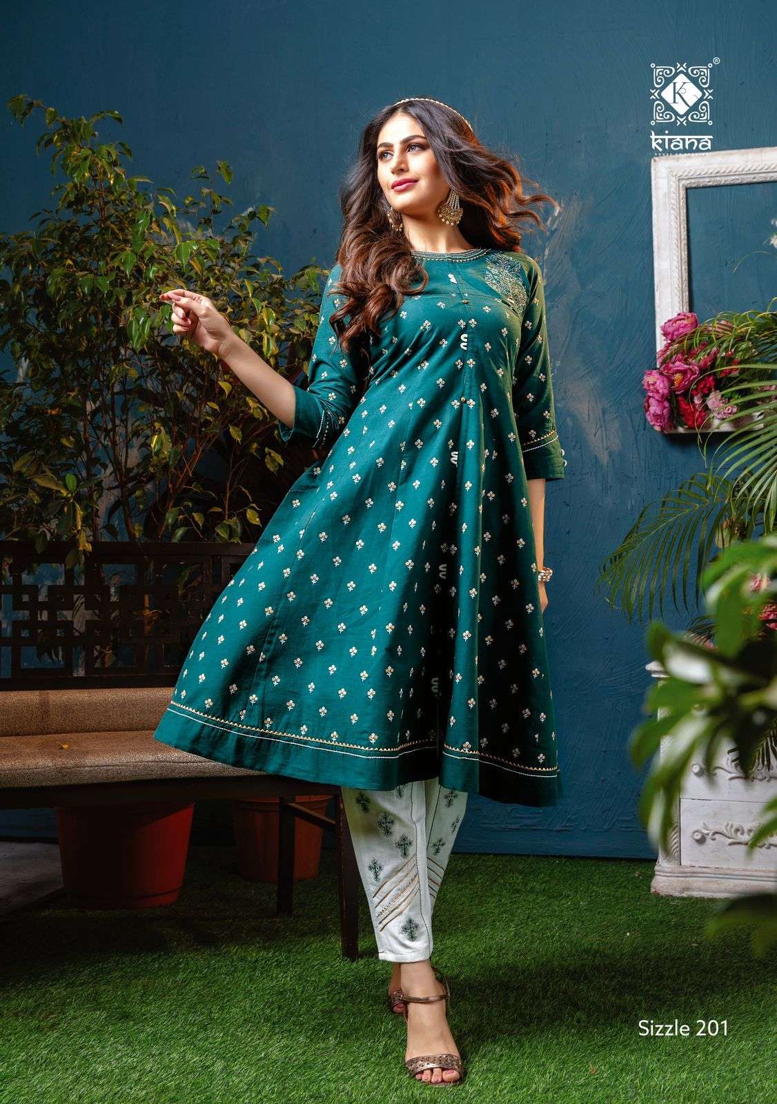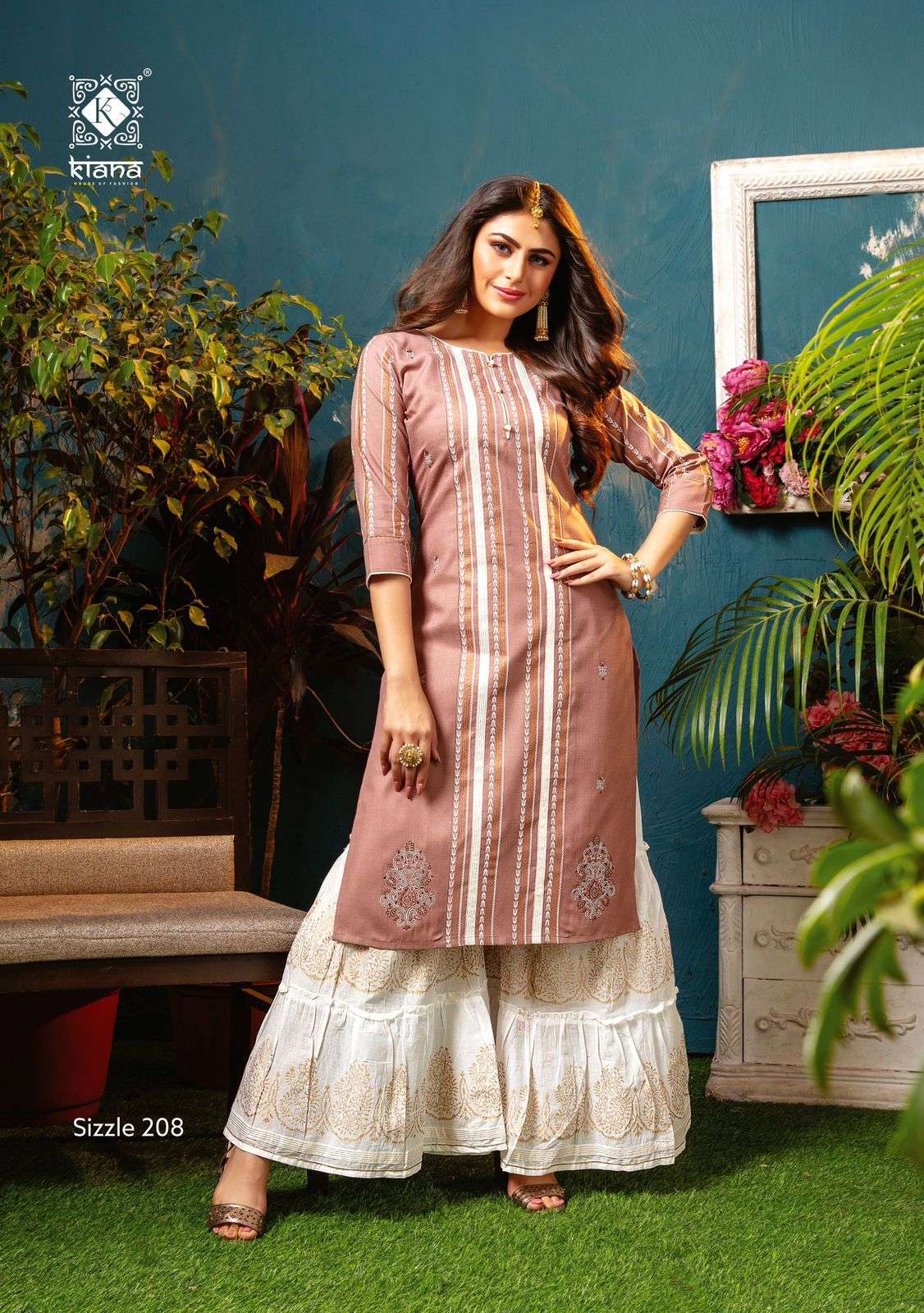 The Test of Premium Collection   Kiana House of fashion Catalogue Name-  New series SIZZLE VOL 2 Fabrics TOP:-Cotton gold print wid thread work Bottom:-Designer divider plazo, sharara ,pent with embroidery work Size :- M,  L,  XL, 2XL, 3XL,   Designs :- 8 pcs Rate- 900/- per pcs. Set to set. GST 5 Percent Extra. |