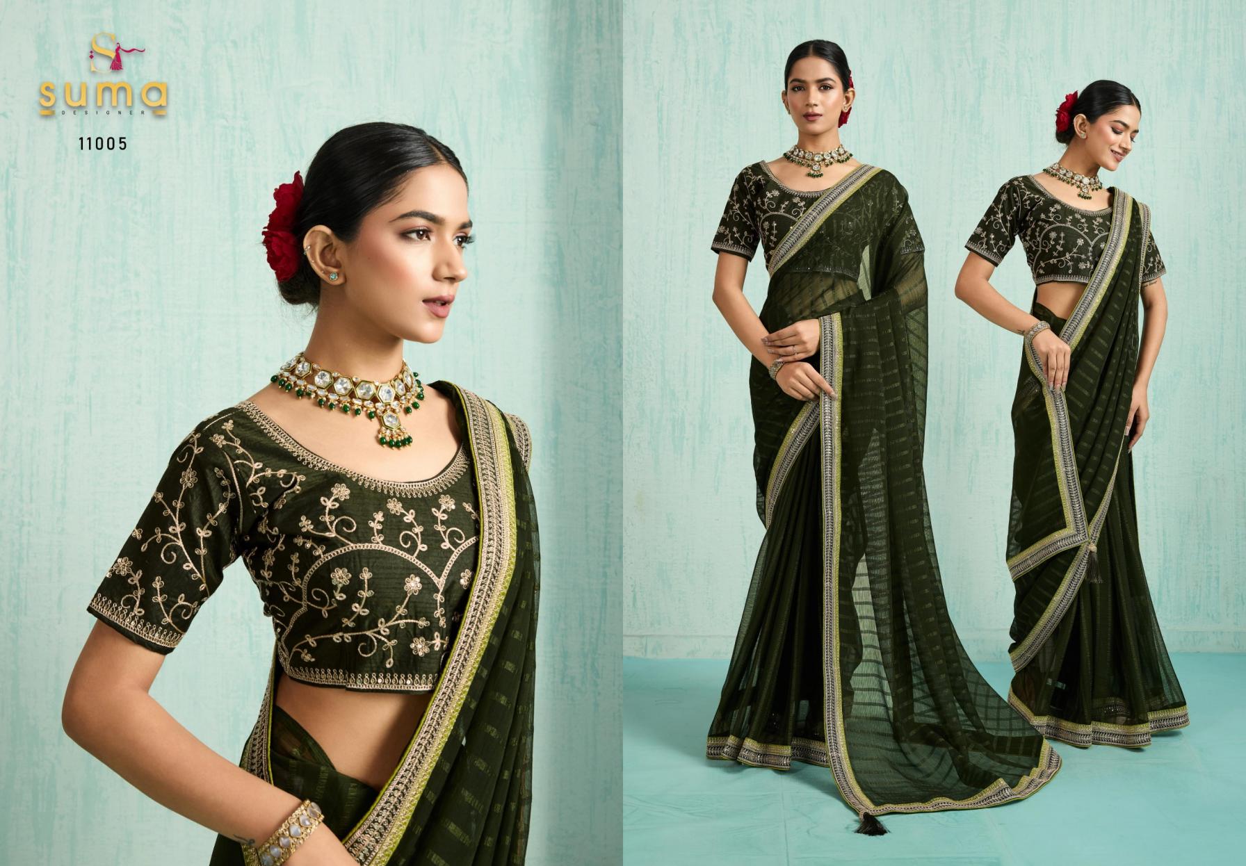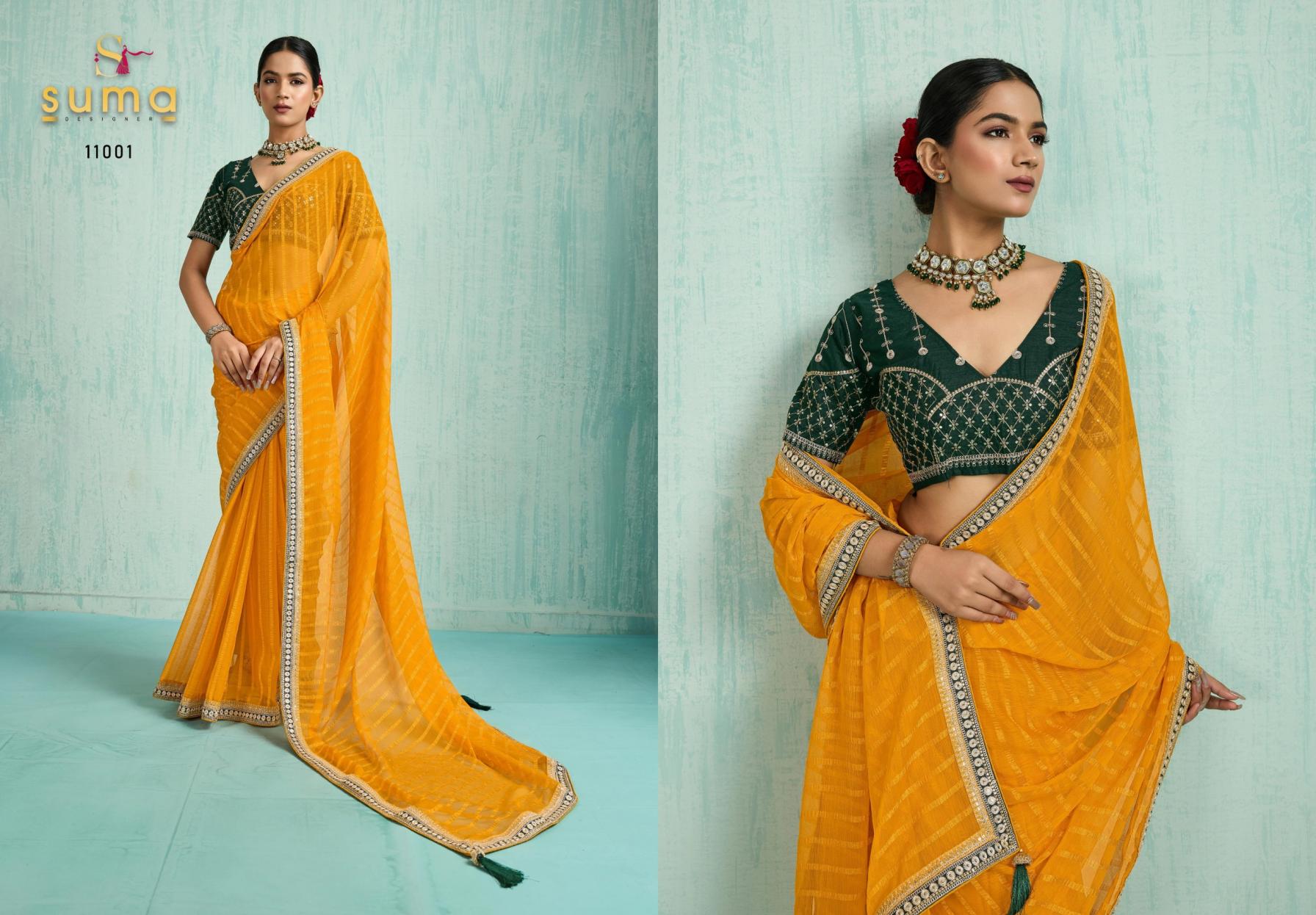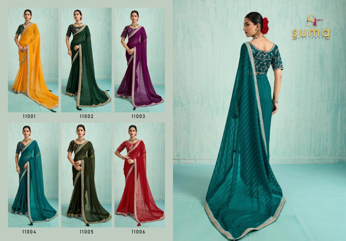 Brand : Suma Catalog Name : Adra Series : 11001 To 11006 Saree Fabric: Chiffon Saree with Zari Sequince border work Blouse Fabric : Banglori Silk With Embroidery Work Rate: 945/-+5% Gst Occasion: Festival Wear,Party wear |
