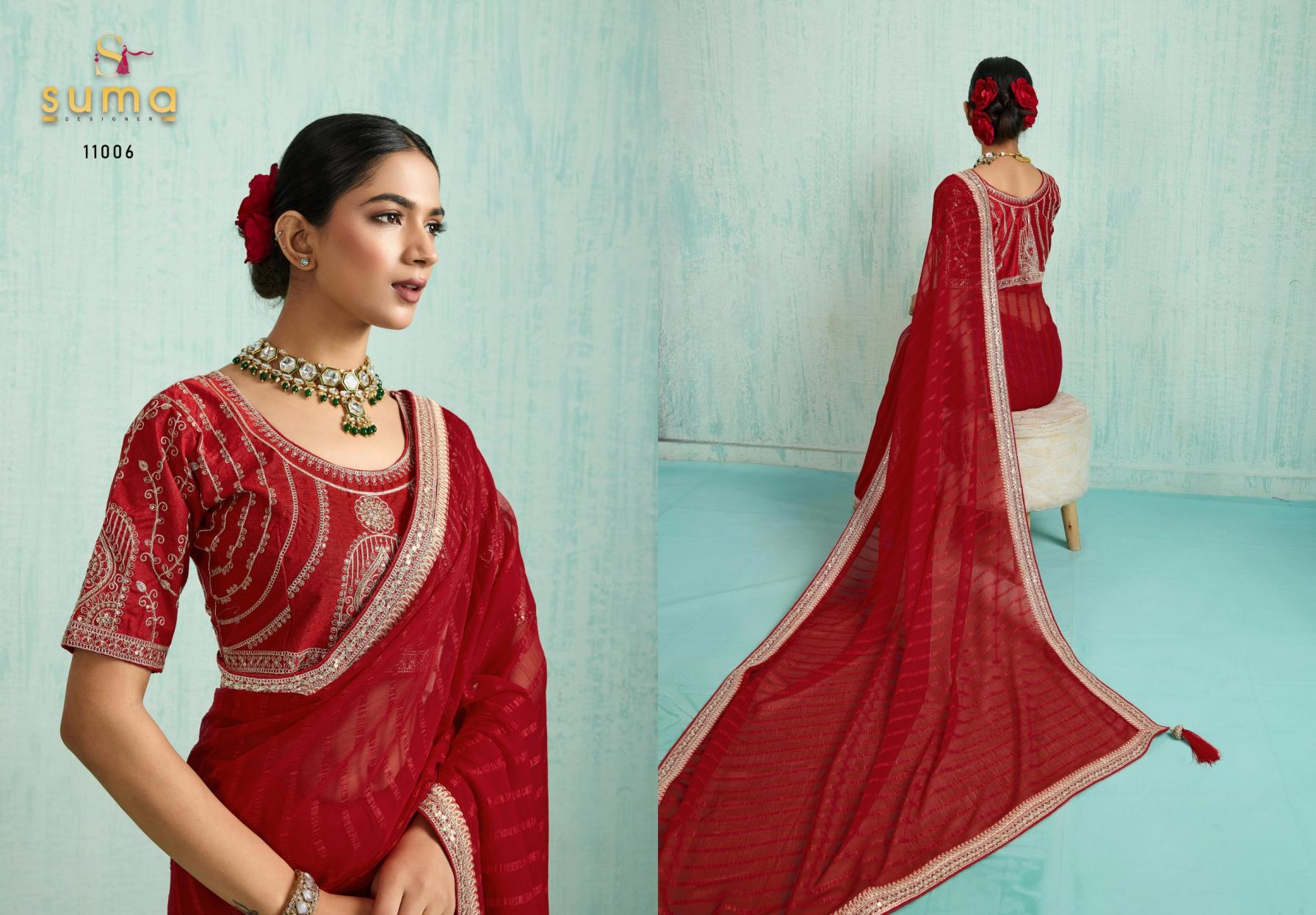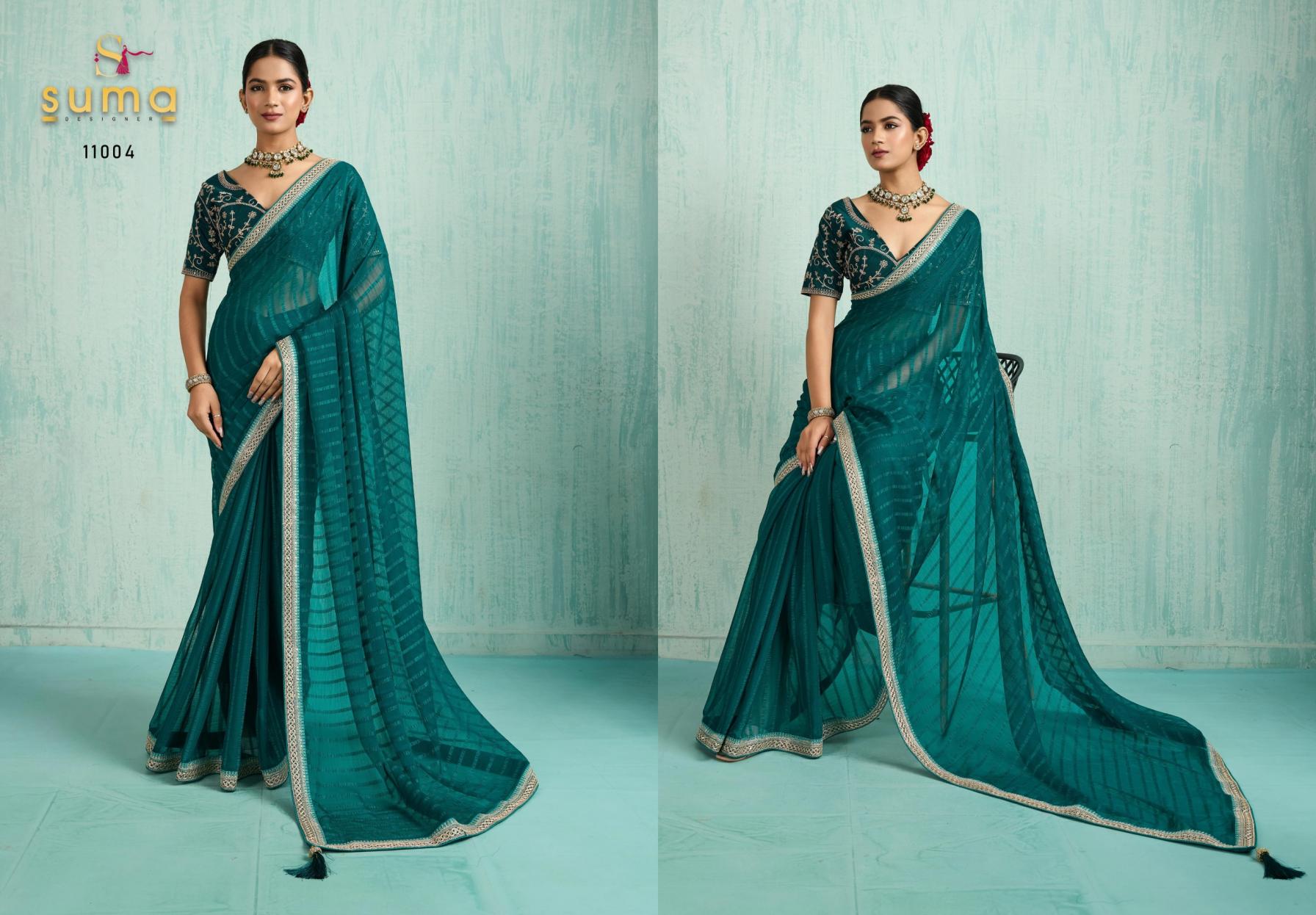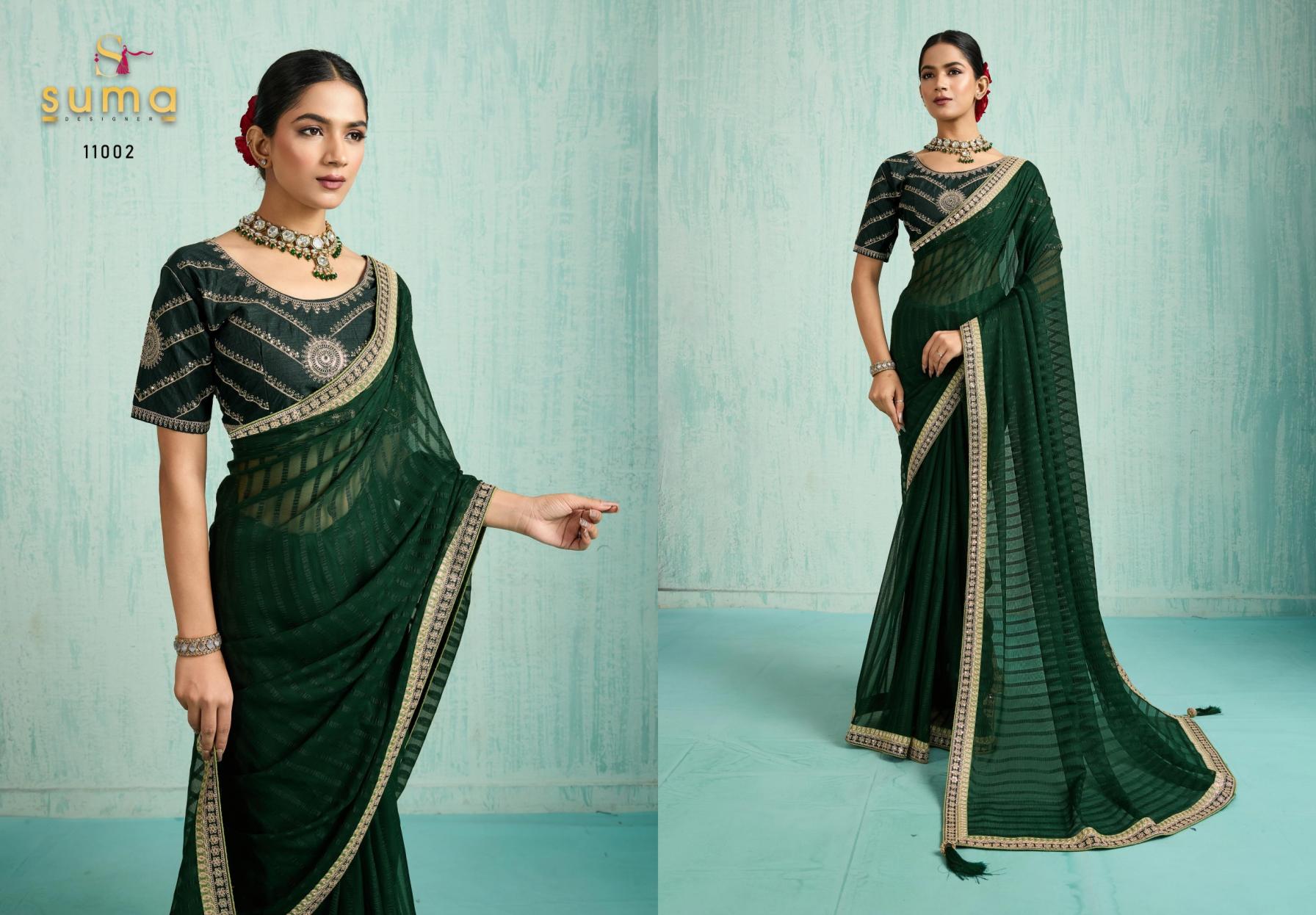 Brand : Suma Catalog Name : Adra Series : 11001 To 11006 Saree Fabric: Chiffon Saree with Zari Sequince border work Blouse Fabric : Banglori Silk With Embroidery Work Rate: 945/-+5% Gst Occasion: Festival Wear,Party wear |