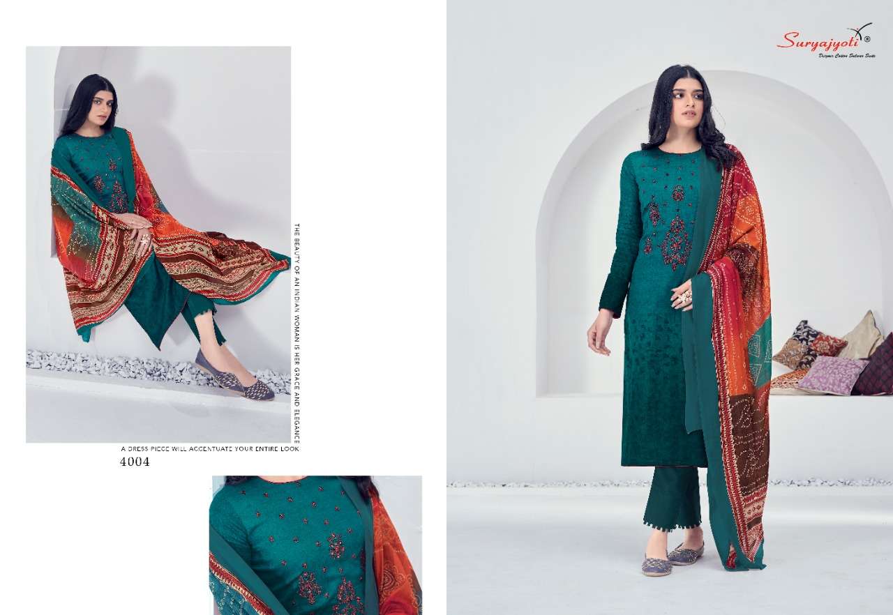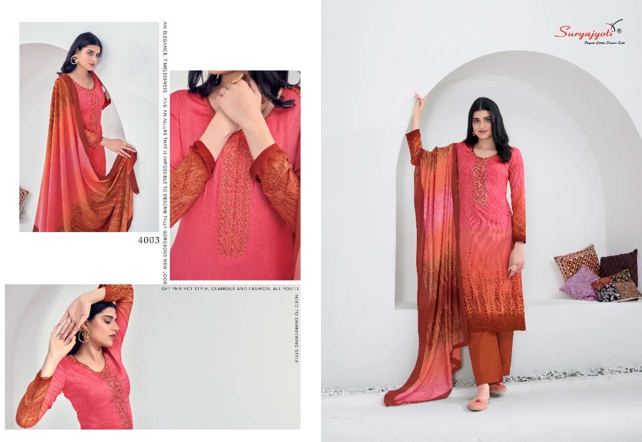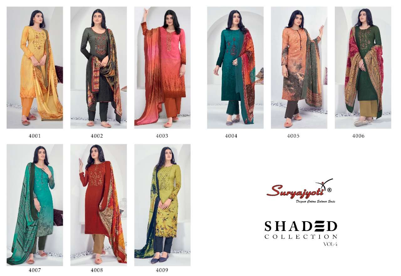 | Other Details | LAUNCHING OF SURYAJYOTI 'S  ‘new catalog Catalogue:- SHADED VOL-4 CLOTH :- SATIN COTTON WITH FINE WORK DUPATTA- MUSLIN COTTON BOTTOM- CAMBRIC COTTON CUT- 2.5-2.5-2.40 RATE- 665/- ONLY PACKING- EXCLUSIVE POUCH WITH EXCLUSIVE LEATHER BAG PACK  |