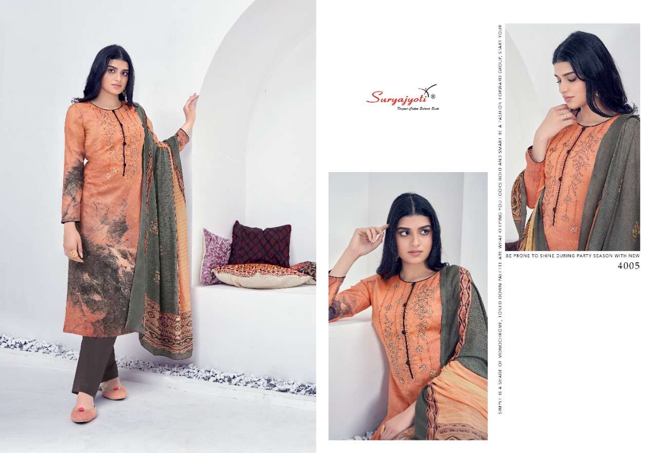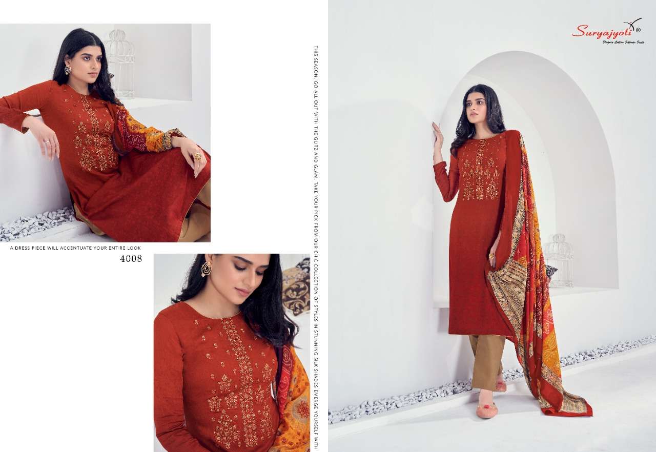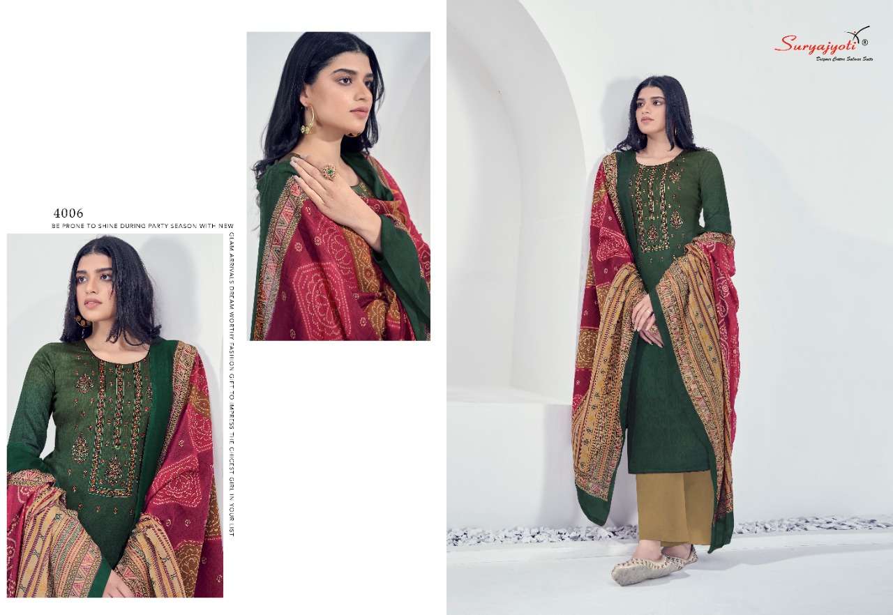| Other Details | LAUNCHING OF SURYAJYOTI 'S  ‘new catalog Catalogue:- SHADED VOL-4 CLOTH :- SATIN COTTON WITH FINE WORK DUPATTA- MUSLIN COTTON BOTTOM- CAMBRIC COTTON CUT- 2.5-2.5-2.40 RATE- 665/- ONLY PACKING- EXCLUSIVE POUCH WITH EXCLUSIVE LEATHER BAG PACK  |