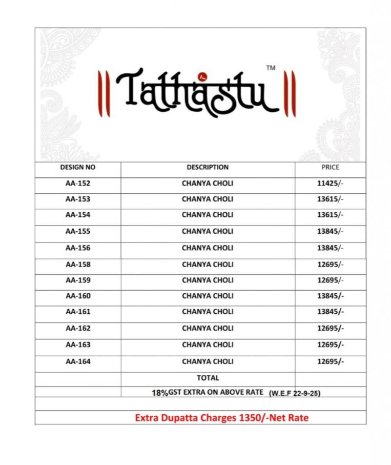 TATHASTU BRIDAL HIT LEHENGA COLLECTION BRAND : TATHASTU CATALOG : ANAARA BRIDAL WEAR(152 TO 164) RATE : ATTACHED +18% GST EXTRA LEHENGA FABRIC : HEAVY BRIDAL SILK WITH KHATLI EMBOIDERY & HEAVY WORK BLOUSE FABRIC : SILK WITH HEAVY WORK DUPPATA : NET WITH WORK TYPE : UNSTITCHED (152 D.NO READYMADE SIZE UP TO 40 INCHES) EXTRA DUPATTA CHARGE 1350/- NET BRIDAL WEAR LEHENGA CHOLI |