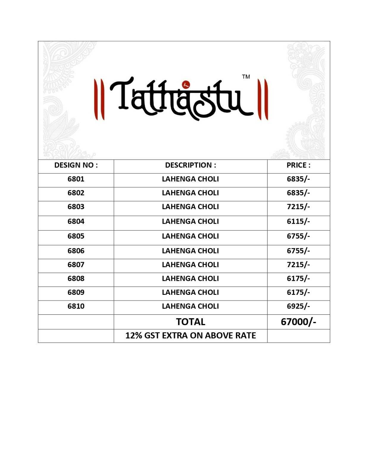 🇮🇳 SANJANA DESIGNWEAR PRIVATE LIMITED 🇮🇳 Tathastu Present New Designer Lehenga Collection Brand Name : Tathastu Catalog Name :Anaara (6800) Series : 6801 To 6810 Fabric Detail : Attached With List Price : Attached +12% Gst Extra Singles & Set Wise Available Occasion : Party Wear,Wedding Wear,Reception Wear |