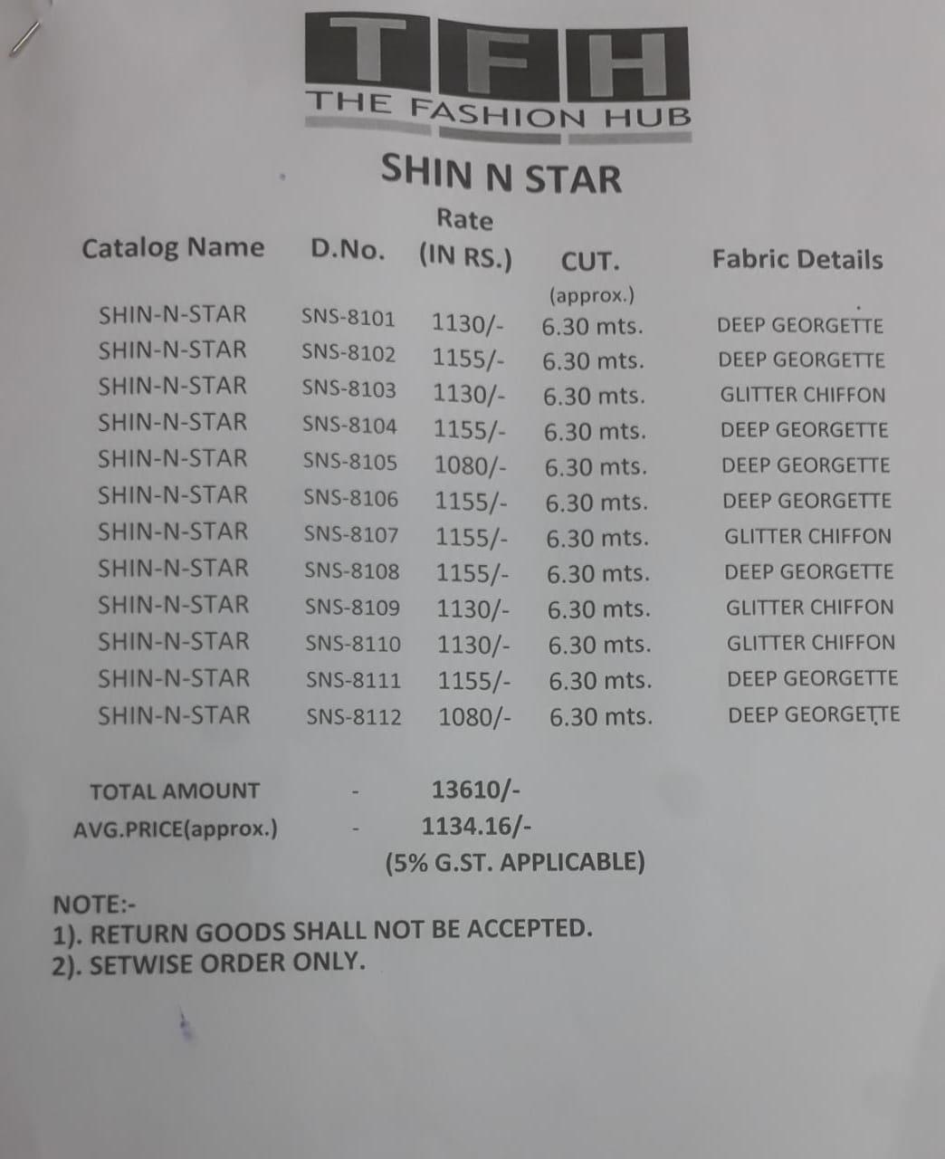 1. CATALOG- SHINE N STAR. 2. PCS. - 12. 3. PACKING- SETWISE ONLY. Set to set . Delivery 3-4 days |