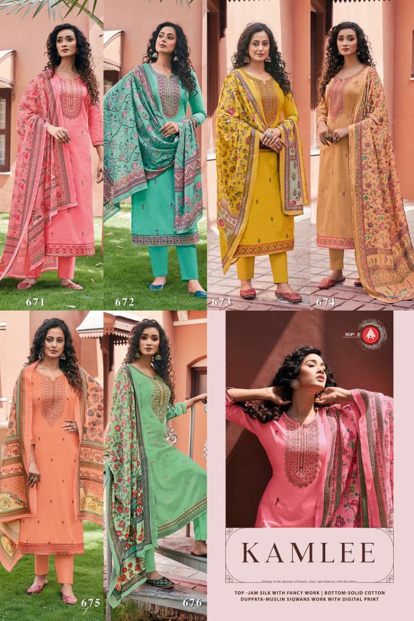 Triple AAA  has launched  Catalog Name:  KAMLEE Fabric Details Top:-  Jam Silk with Embroidery Work Bottom:- cotton solid Dupatta:- muslin digital print with 2mmsequins work Total Design:- 6  Rate ......899 per pcs . Set to set . GST 5 Percent Extra Dispatching 5 to 6 days later |