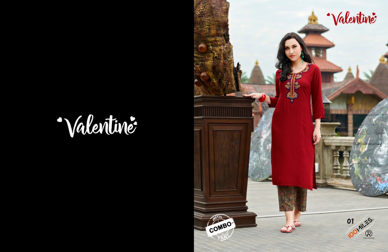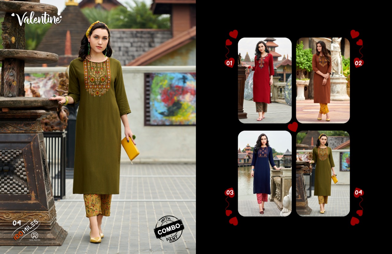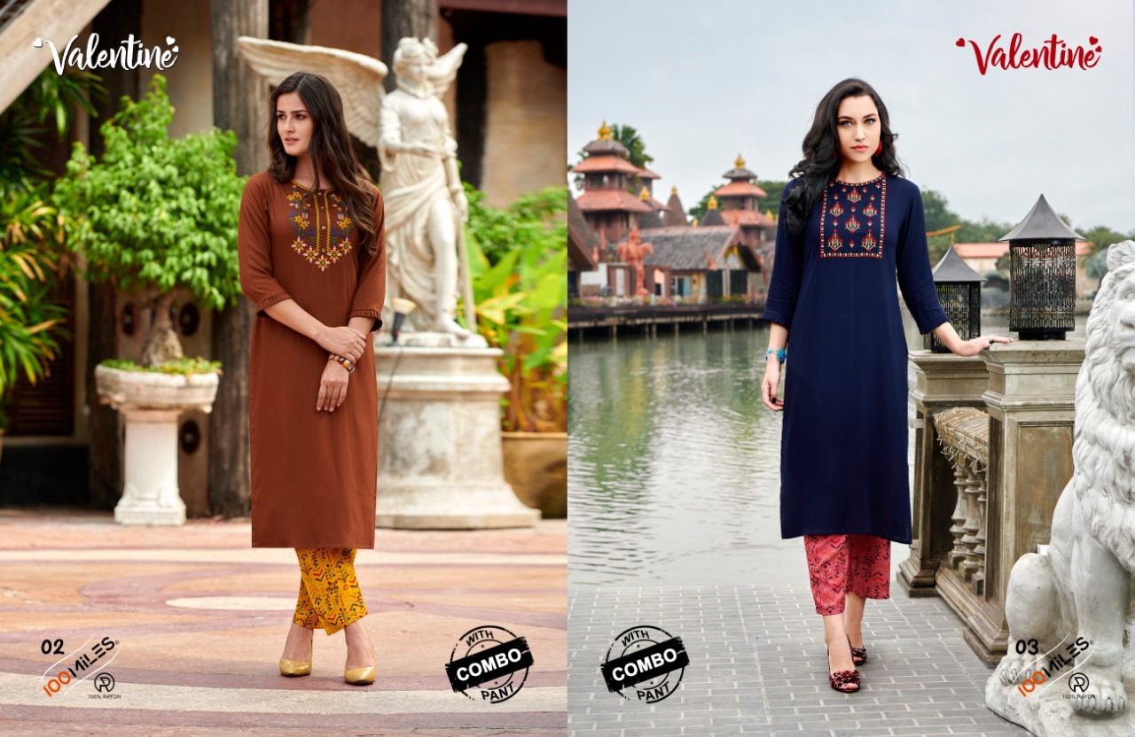 Catalog : VALENTINE with bottom combo BRAND : 100MILESî TYPE : Rayon embroidered kurtis with Rayon palazzo pants. SIZES : M to 2XL RATE : 655/-(with bottom) Pieces: 4 per Bag |