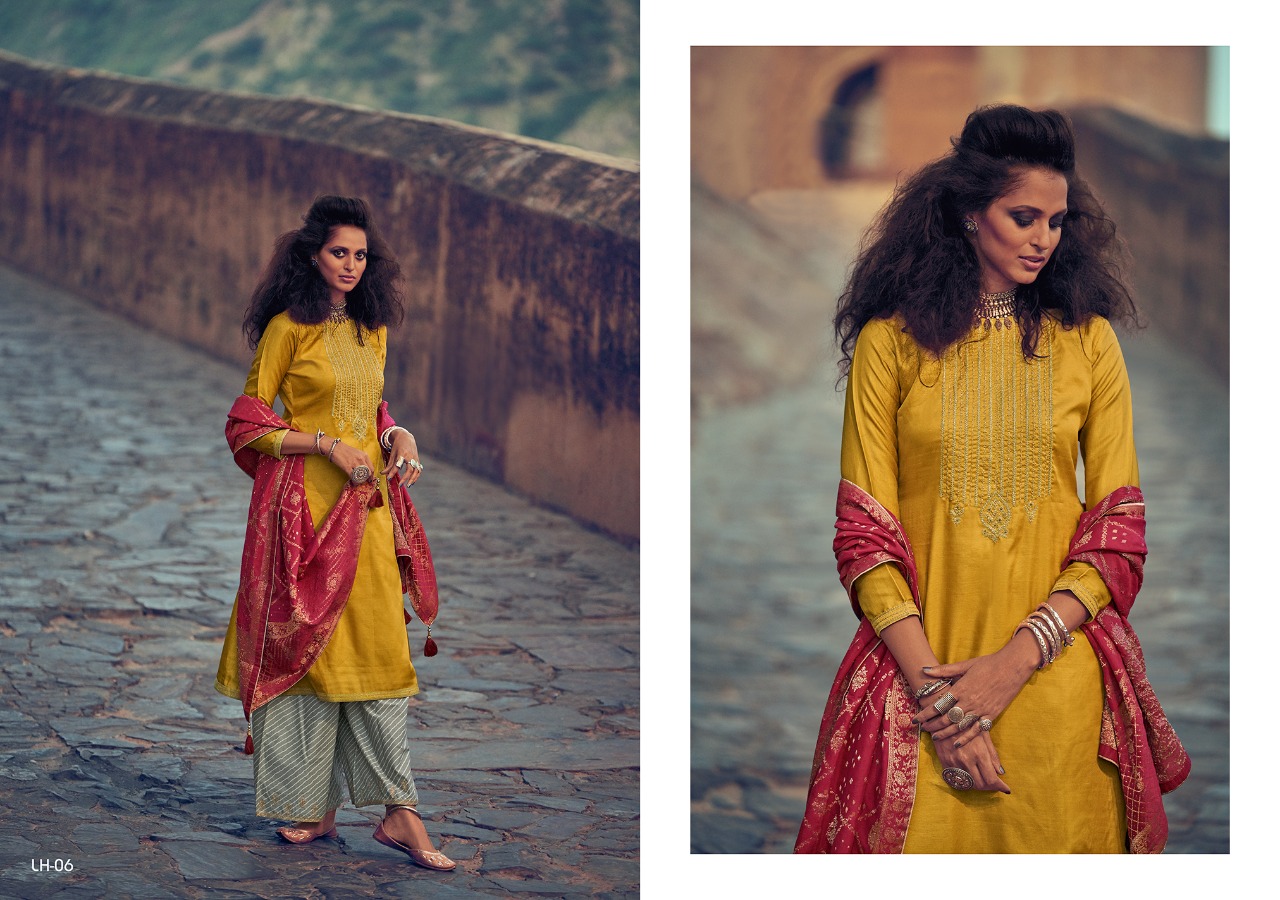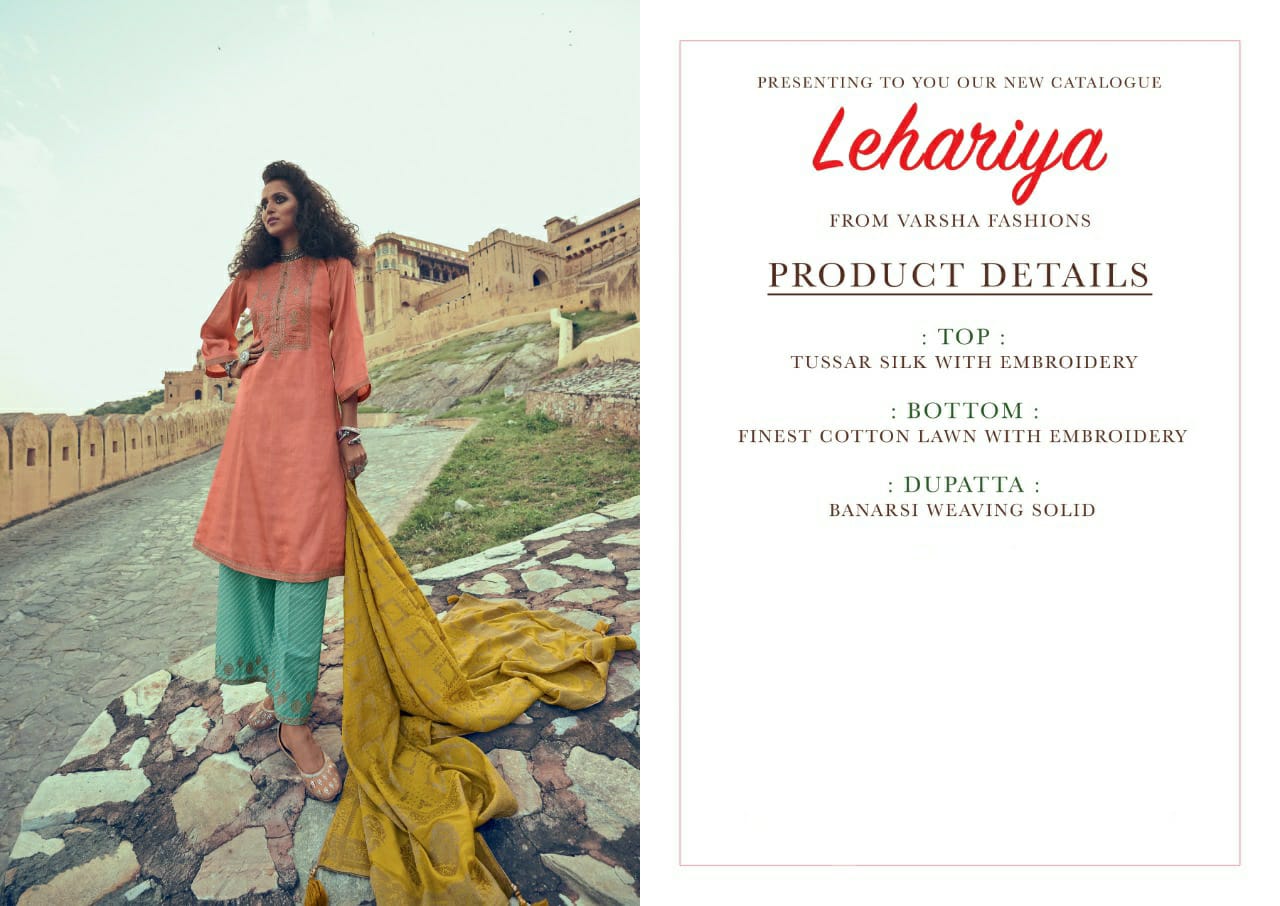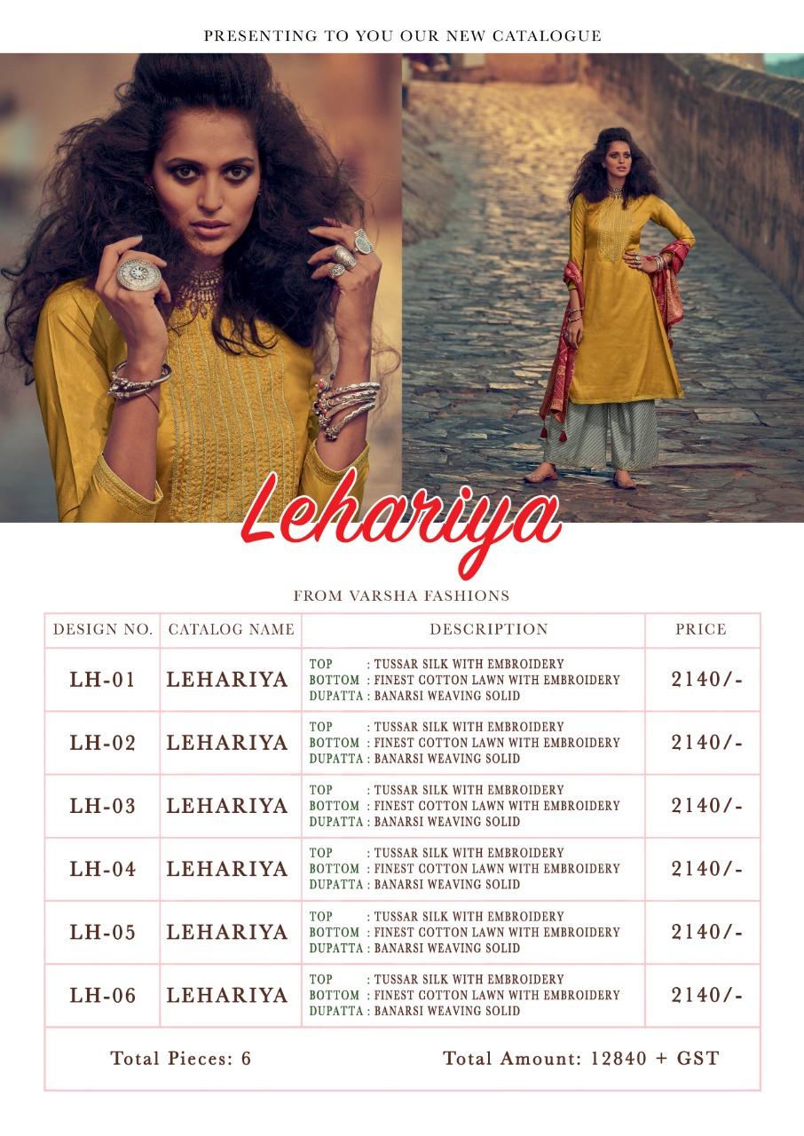 Presenting to you our new catalogue. LEHARIYA From - Varsha Top -Pure Tussar Silk With Designer Embroidery Bot - Finest Lawn With Embroidery Dup - Pure Banarasi Weaving Solid Rate:- 2140/- 1 Set:- 06 pcs. |