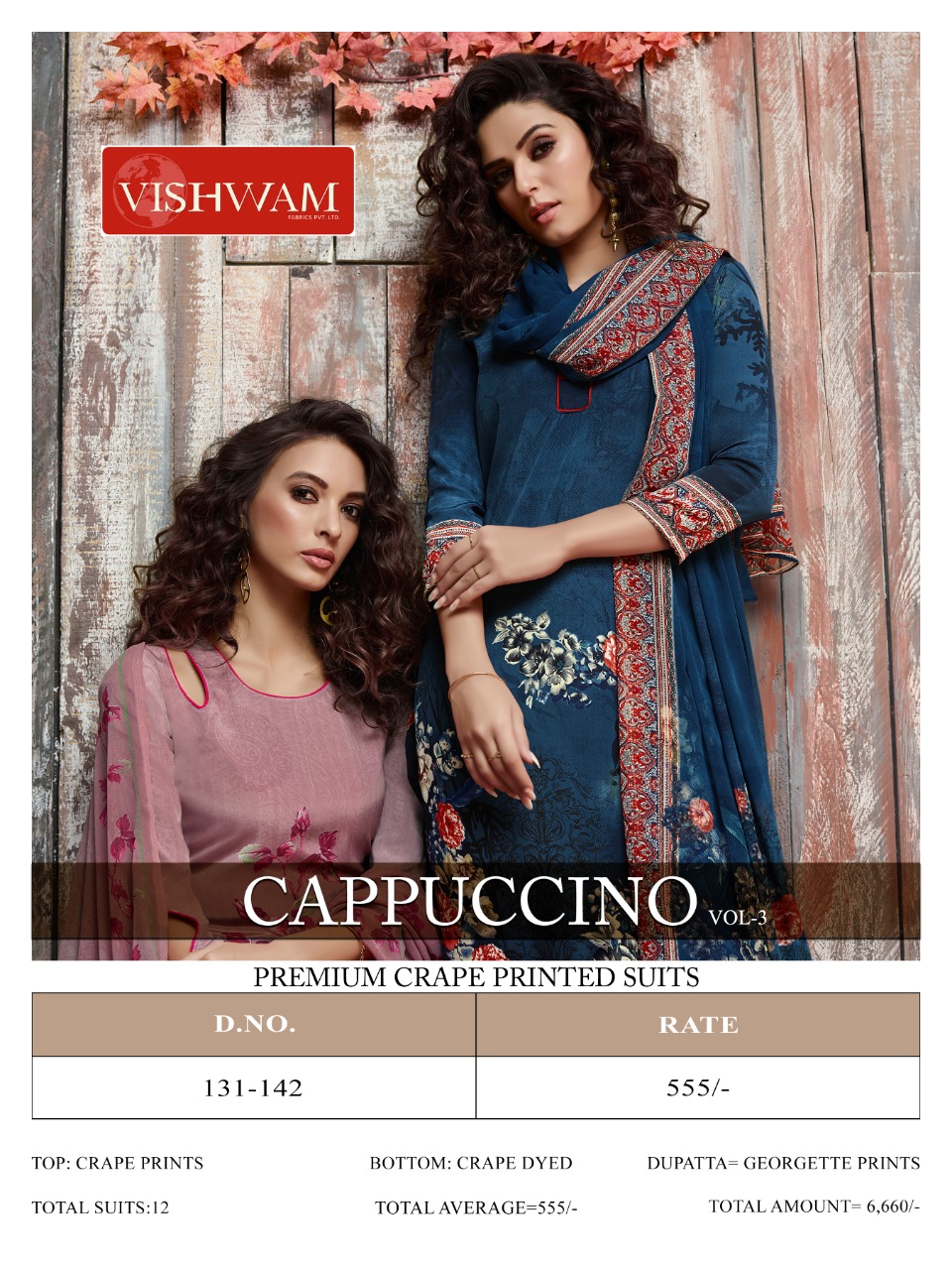 Brand - Vishwam. Catlog-CAPPUCCINO vol -3. Rate - 555 per Pcs Set To Set. GST 5 Percent Extra. Delivery soon |
