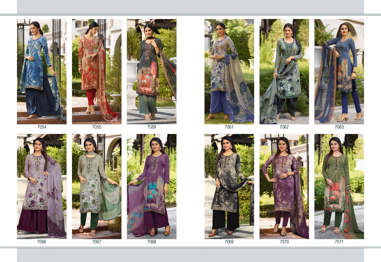 Vishwam fabrics ready to ship "Espresso Vol 4 hitlist with new colours" A set of 12 pieces. Top is soft feel premium Quality crepe fabrics with designer print and equisite embroidery embellised with fine hand sarwosky work. Bottom is premium crepe. Dupatta is georgette Rate 855 |