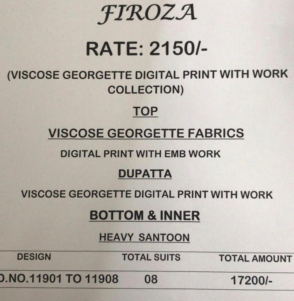 Brand - Vivek . Catlog name - FIROZA . Rate - 2150 per Pcs . Set to set. GST 5 Percent Extra. Delivery- Today |