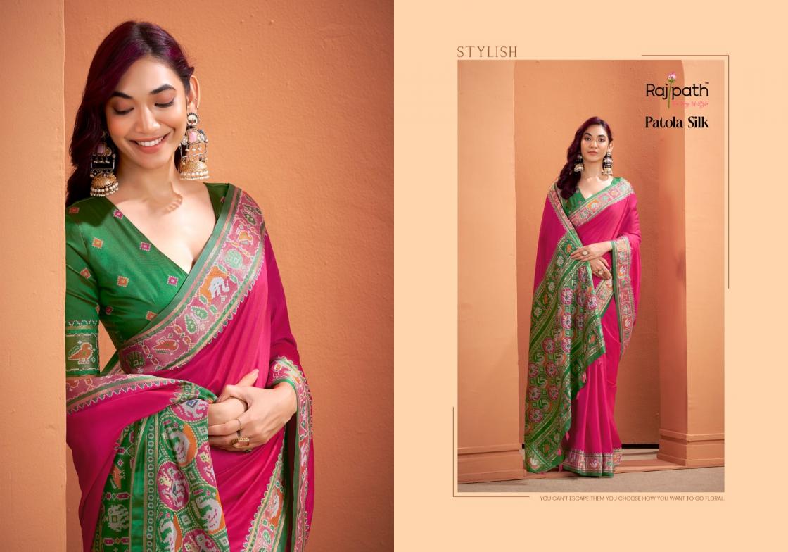 Elegance personified silk meets vibrant Patola Design, creating a stunning combination,Sophisticated charm Weaving On silk, perfect for making a statement. Brand - Rajpath Catalog Name -Vrundavan Silk