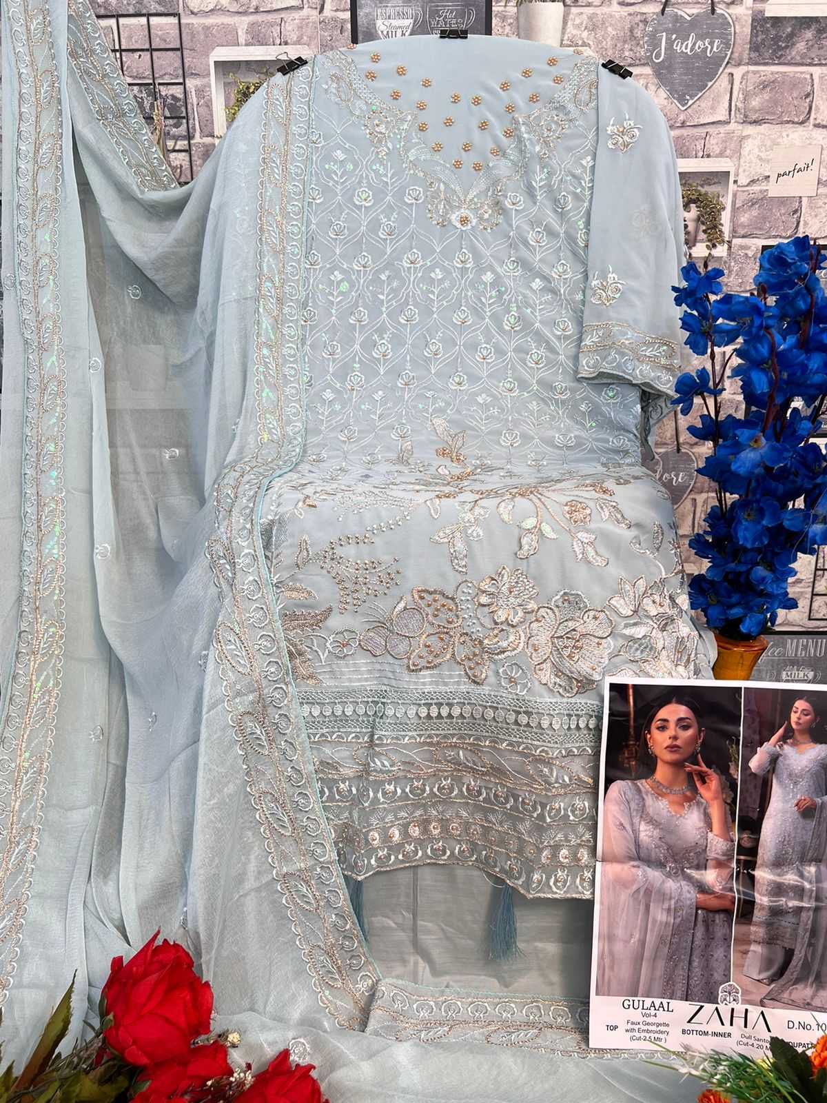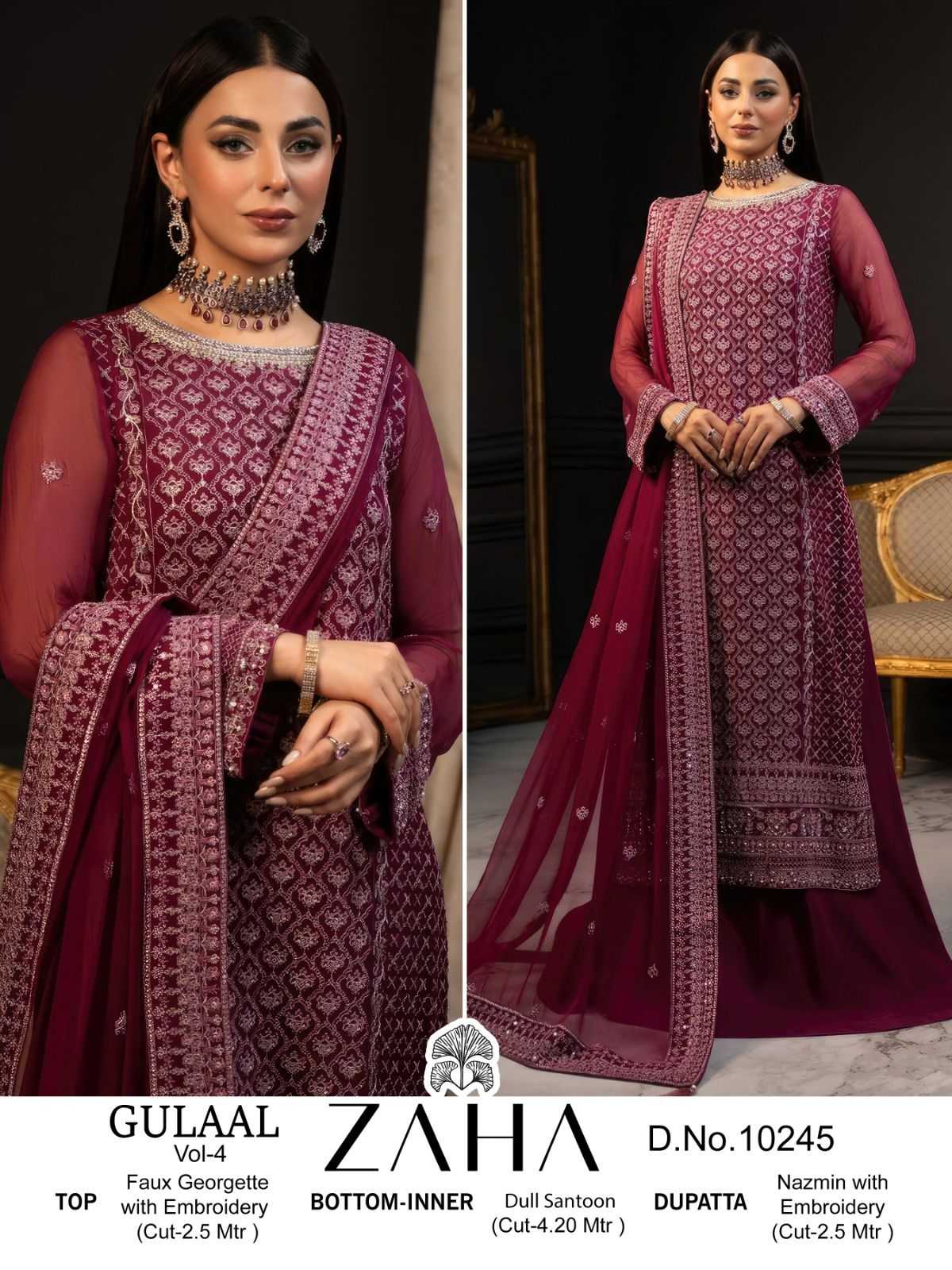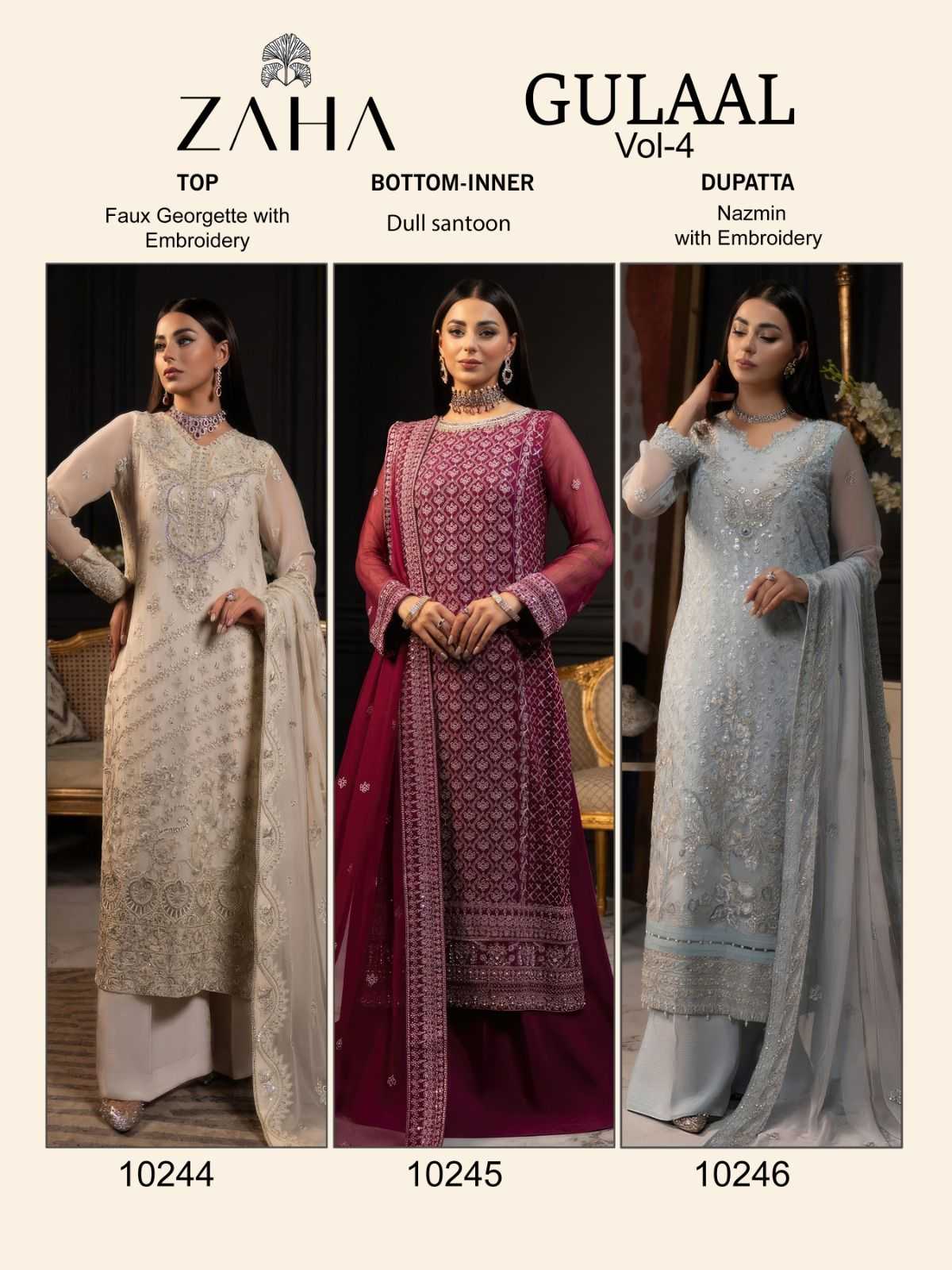 zaha gulaal vol 4 10244-10246 pakistani embroidery work dress material