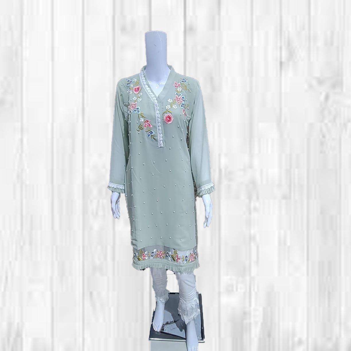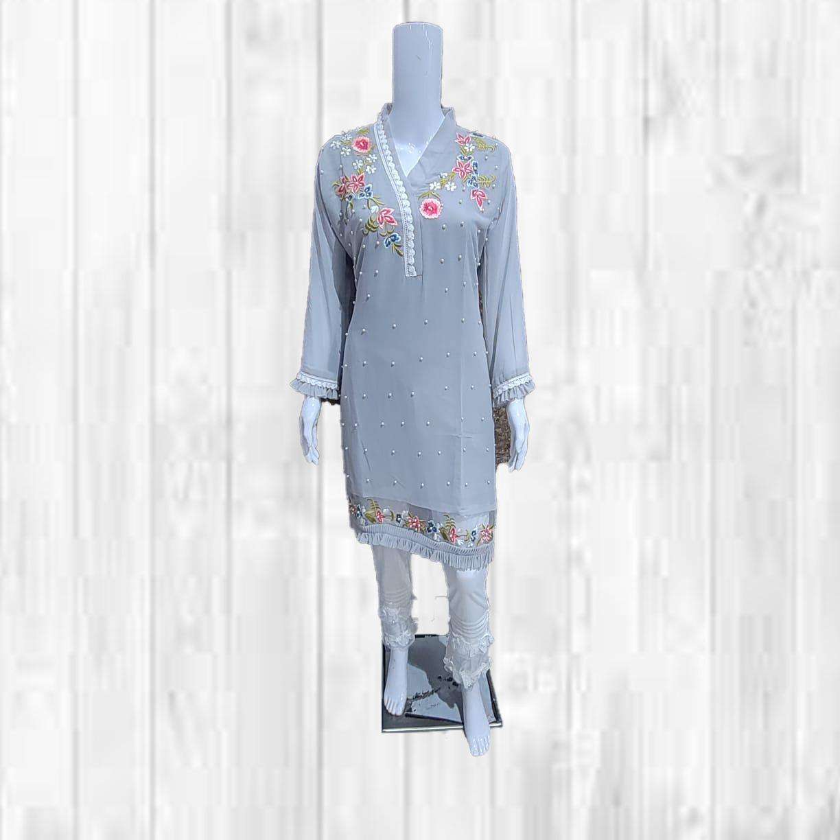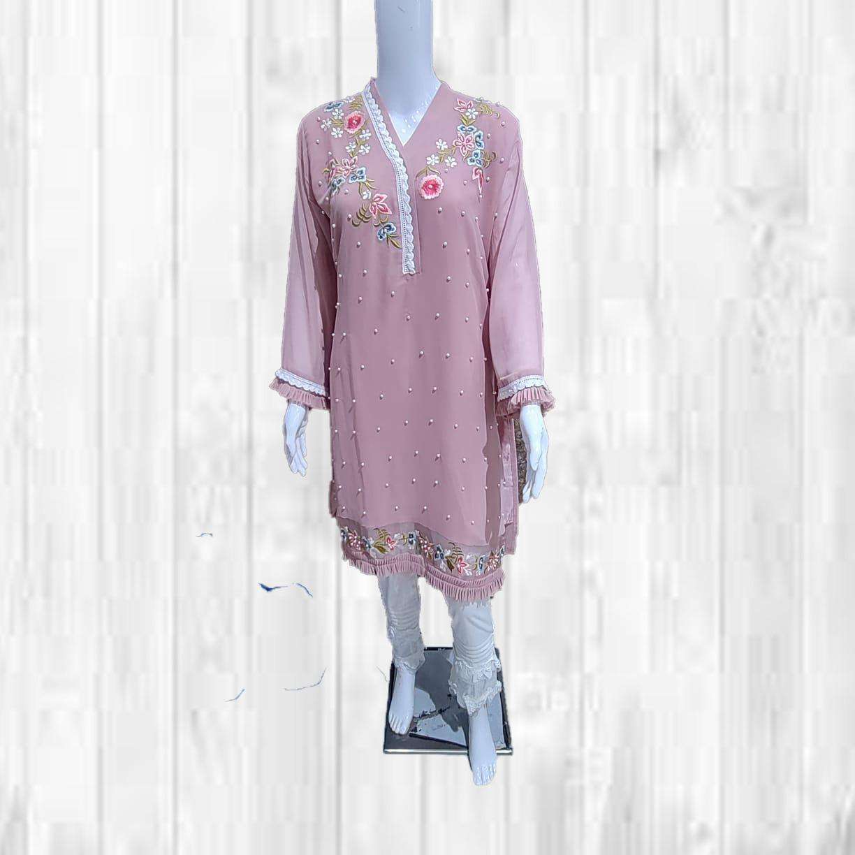 uniqe pearl Collection For Festival Seasion      (Z.S Vol :- 34)      ZARA Studio   THE FASHION ICON Description  Designer Stylish Tunic With Classic embroidery With Beautiful pearl n lace frill On Slives Nd Daman With Cigarette Pants Details Top:- Pure Georgette Inner  :- Santoon Bottom :- pure Strachable Cotton Colour :- 03  (1)ocian pink  (2)sky grey . (3)fern green     Size Chart  Top xl size chest (42) Bottom xl size (36-42) Rate :- 1100/-      Colour may slightly vary due to light effect Dispatching Ready |