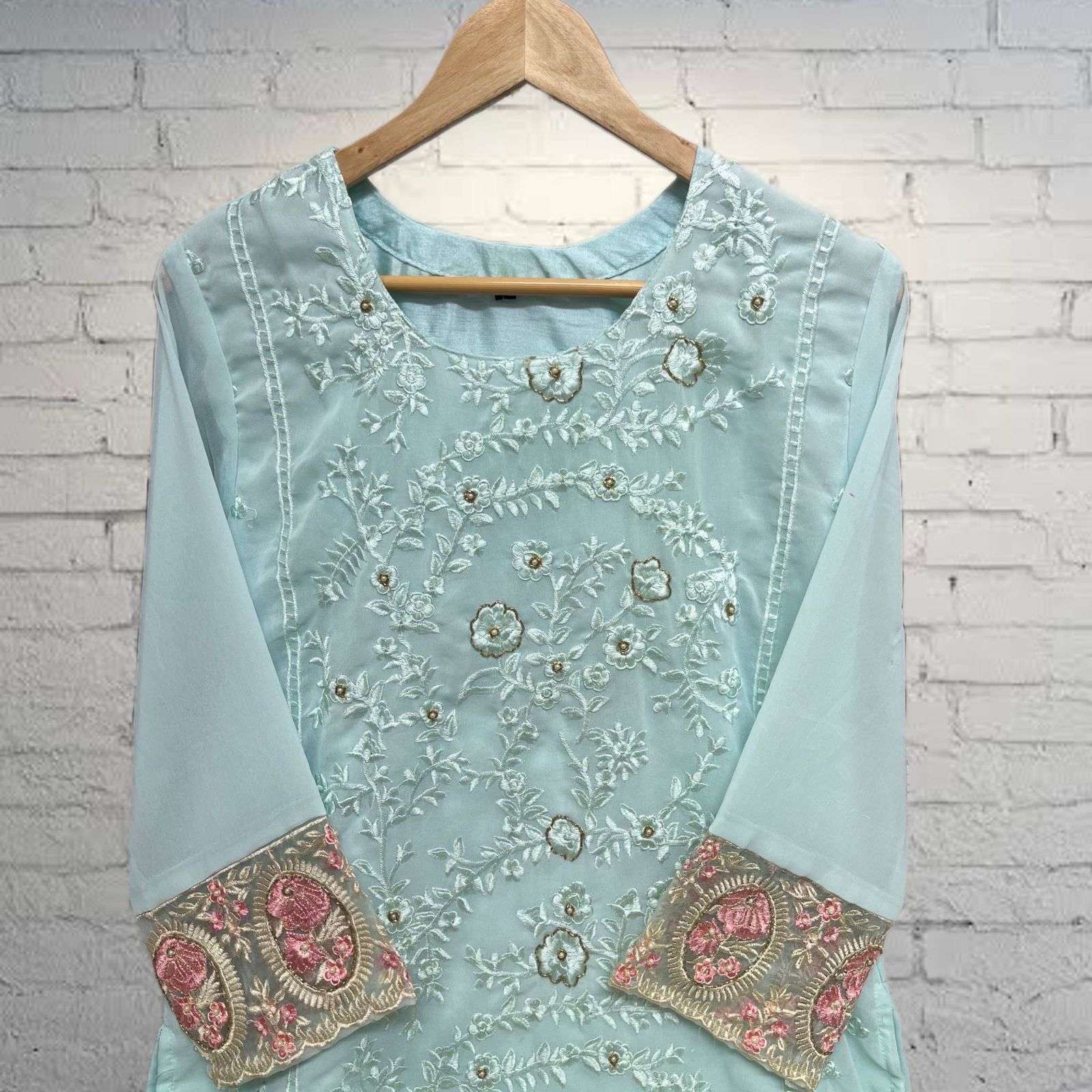 ZARQASH READYMADE Collection D.no :- 103 Top :- Fox georget embroidery wth HANDWORK santoon inner Bottom :- cotton STRETCHABLE pant with Side pocket & BOTTOM patch COMPLETELY READY TO WEAR Dupatt :- Nazneen Dupatta complete ready to wear Size Chart Top size chest :- Bottom LENGTH:- 38” Inches Rate :- 1280. With duppta |