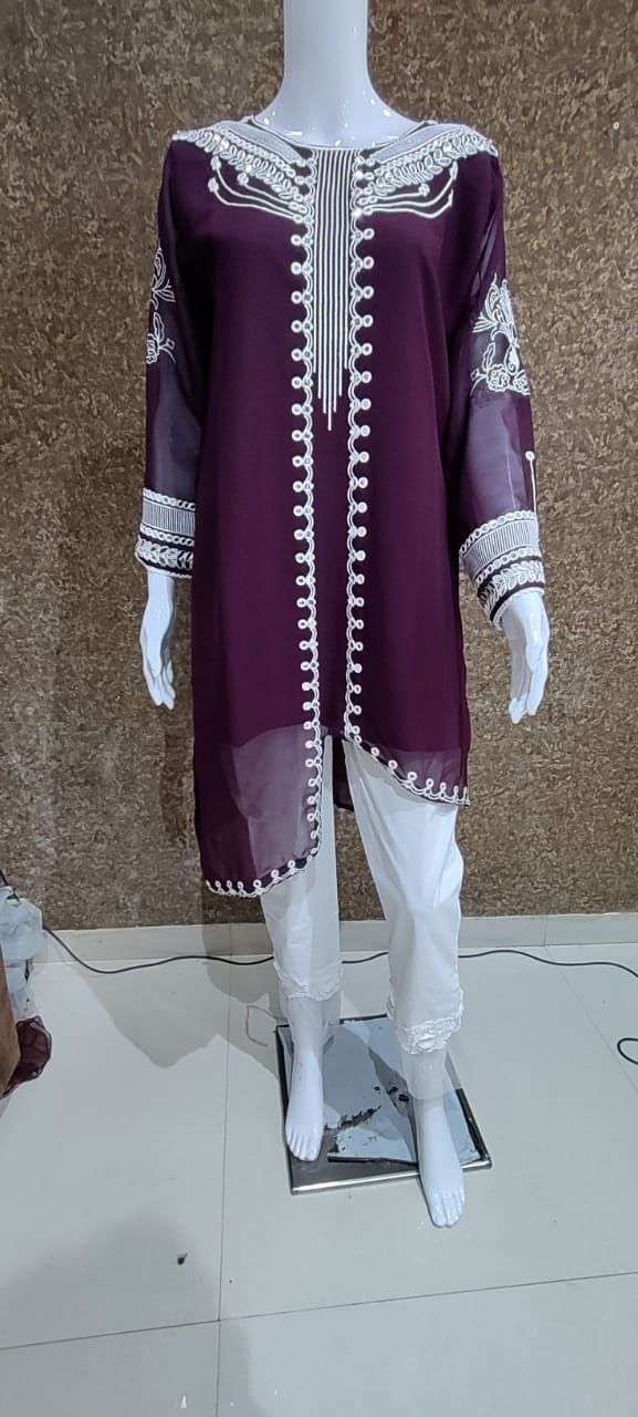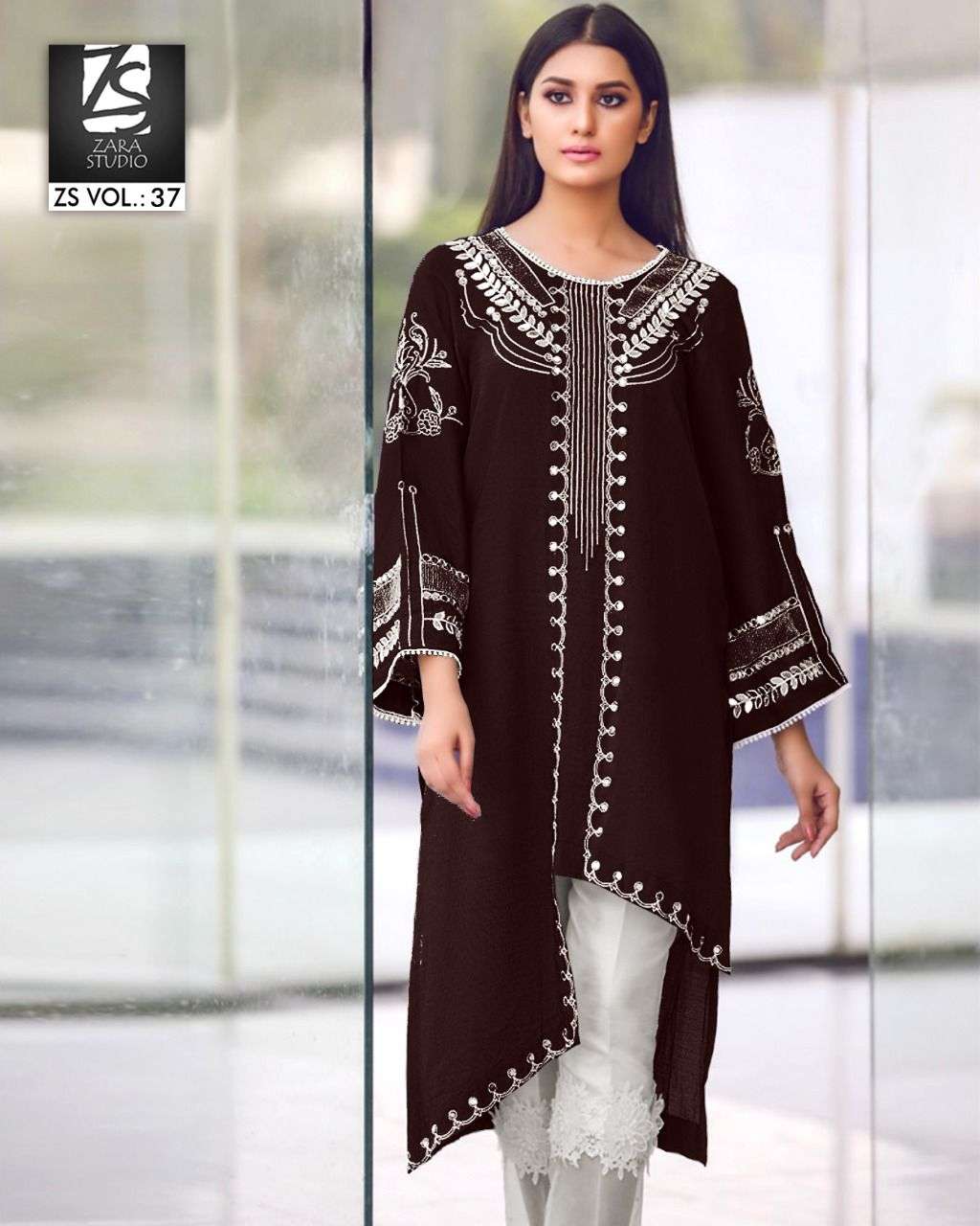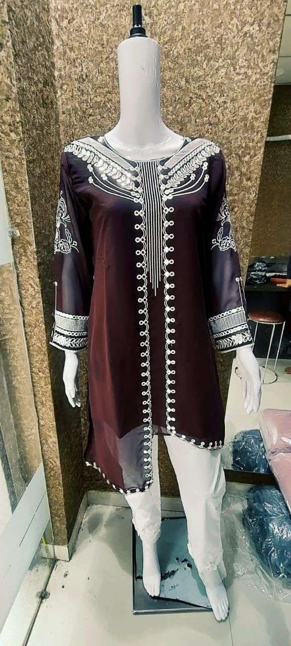 Classy Collection With two New Colour           VOL:-37 Look  yet Classy in our new Designer collection                 Present by        Zara studio  . The Fashion Icon Description Merging style with elegance  is the quintessential choice for intimate function affairs  This kurti is adorned with exquisite embroidery work and intricate embroidery motifs n mirror on the front n slives, paired with cigarette pants with lace Fabric Details Top:- Pure Georget Inner:- Pure Santoon Pant:- Pure Strachable Cotton Colours :- 02        (1) deep falsa        (2) deep brown                Size Chart Top XL size chest (42) Bottom Waist Xl Size (36-42)     Rate 1000/-each   Full Set Available Colour may slightly vary due to light effect |