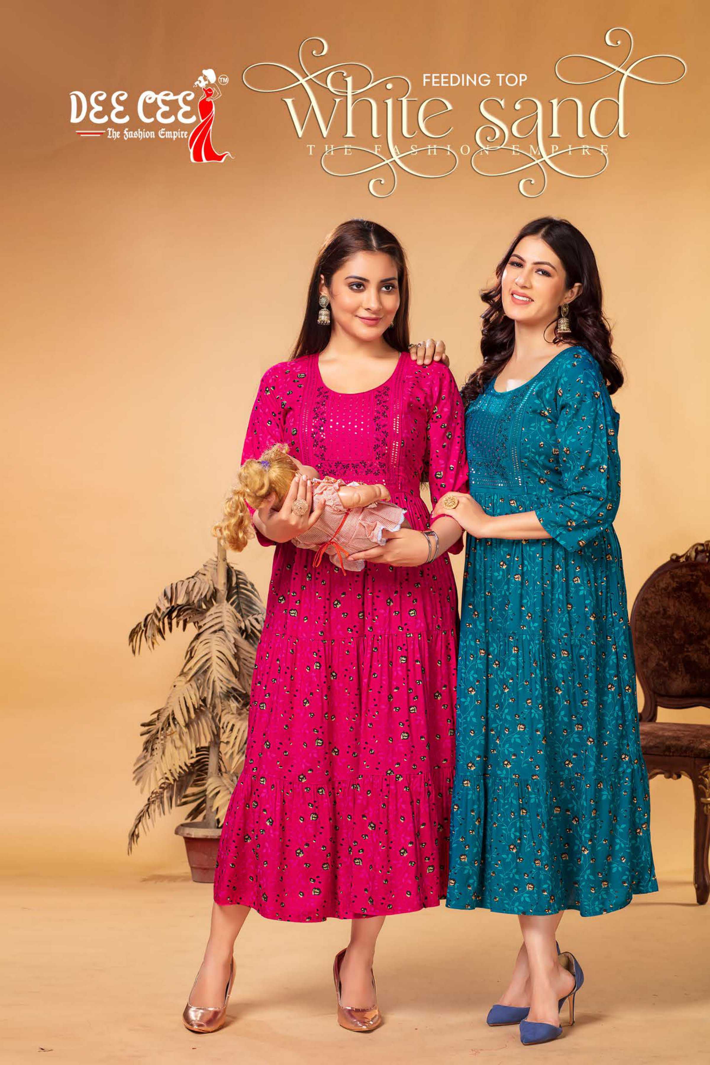dee cee white sand readymade floral print sequin work fancy feeding kurti kurti