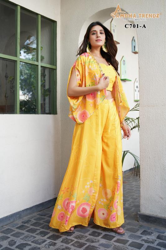amoha trendz c407 georgette with cowl and silk satin shrug wear for indo western