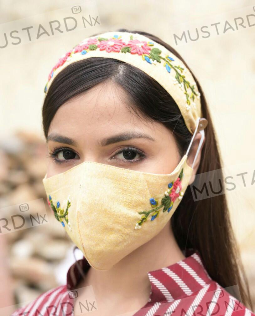 Mustard Present Fancy Embroidery Mask With Matching Hair Band For Girls