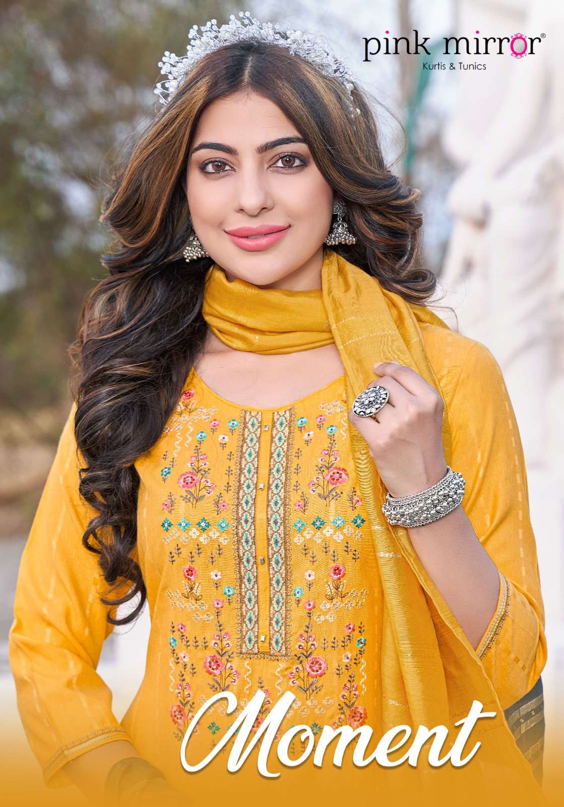 pink mirror present moment embroidered fancy kurti with pant and dupatta