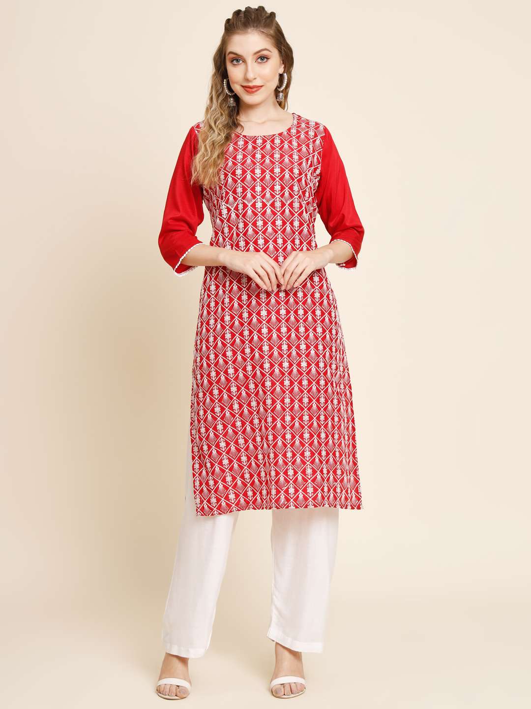 Ritu Soft chinnon Kurta with Embroidery Work Straight Shape Three Quarter Sleeves Round Neck