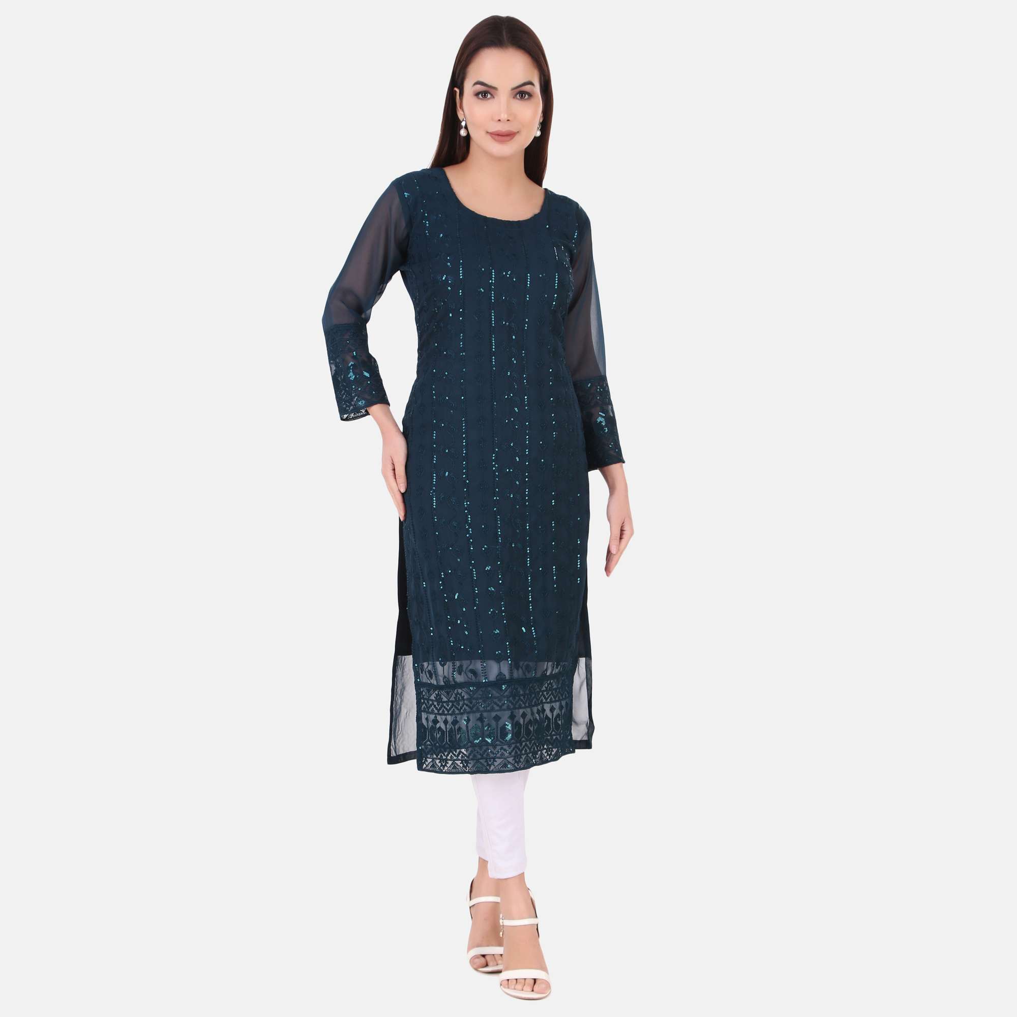 Black Chain Soft Georgette Kurta with Embroidery Work Straight Shape Three Quarter Sleeves Round Neck crepe inner