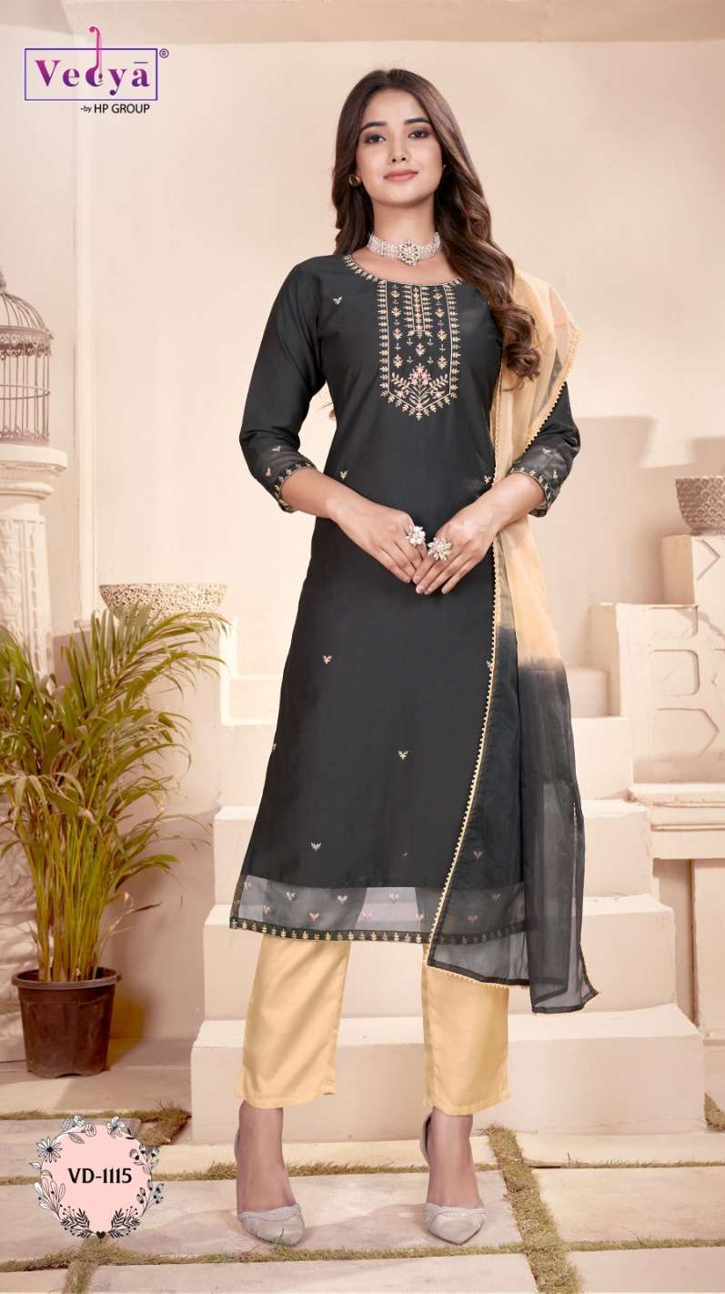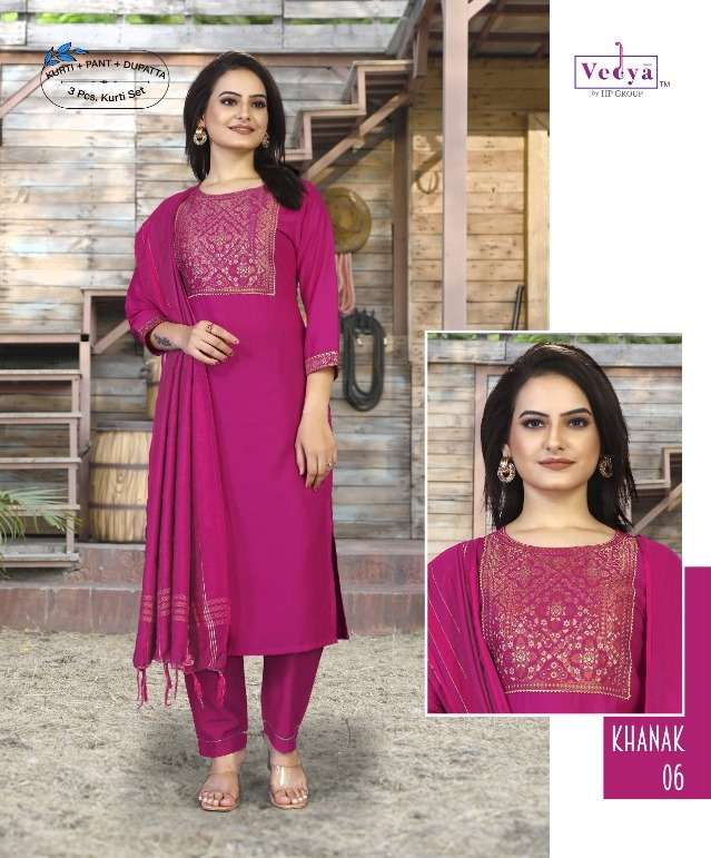 vedya present ishina fancy work kurti with pant and viscose dupatta catalog