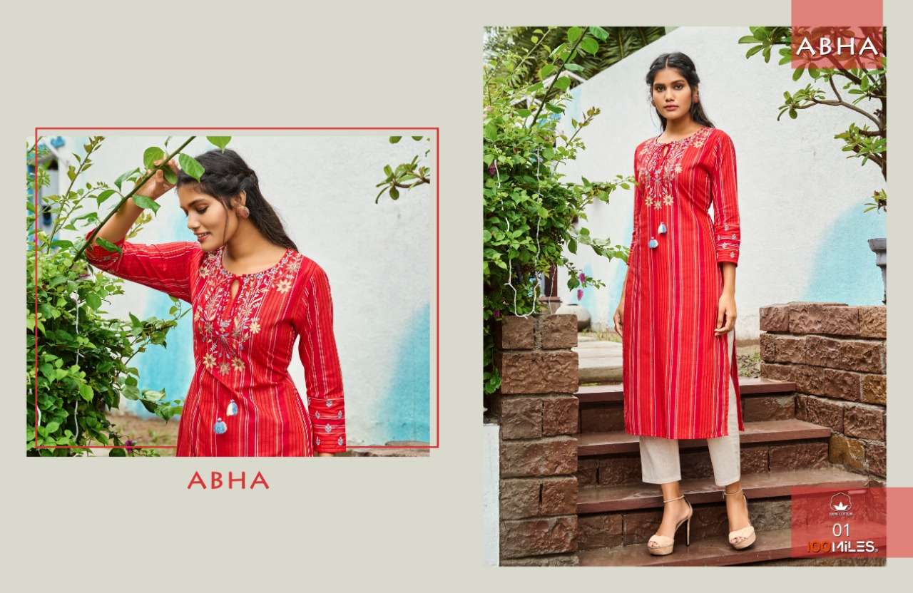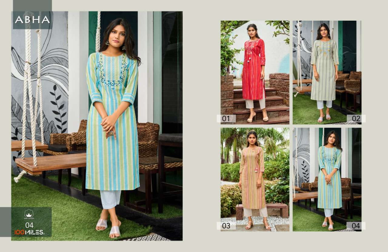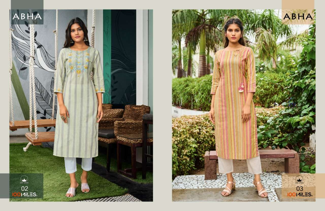 Catalog : ABHA Style : Pure Cotton striped fancy embroidered Kurtis. BRAND : 100MILES® SIZES : S to 3XL(Rs 10/- extra for size 3XL) RATE : 405/- Pieces: 4 per Bag |