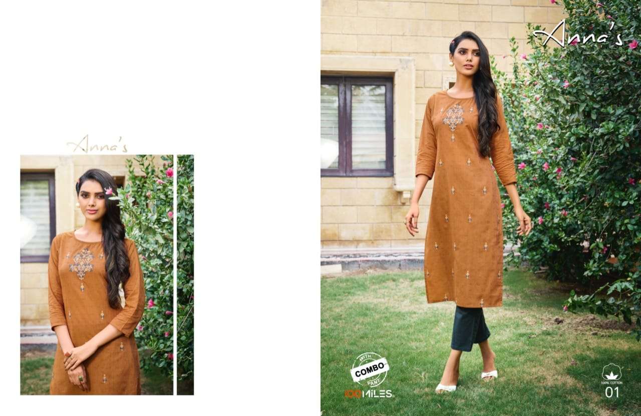 Catalog : ANNAâS Style : Kurti + Pant Combo set BRAND : 100MILES® TYPE :  Kurtis in pure cotton patterned fabric with embroidery and combo pants. SIZES : S to 3XL(Rs 10/- extra for size 3XL) RATE : 655/-(Kurti with pants) Pieces:  4 per Bag |
