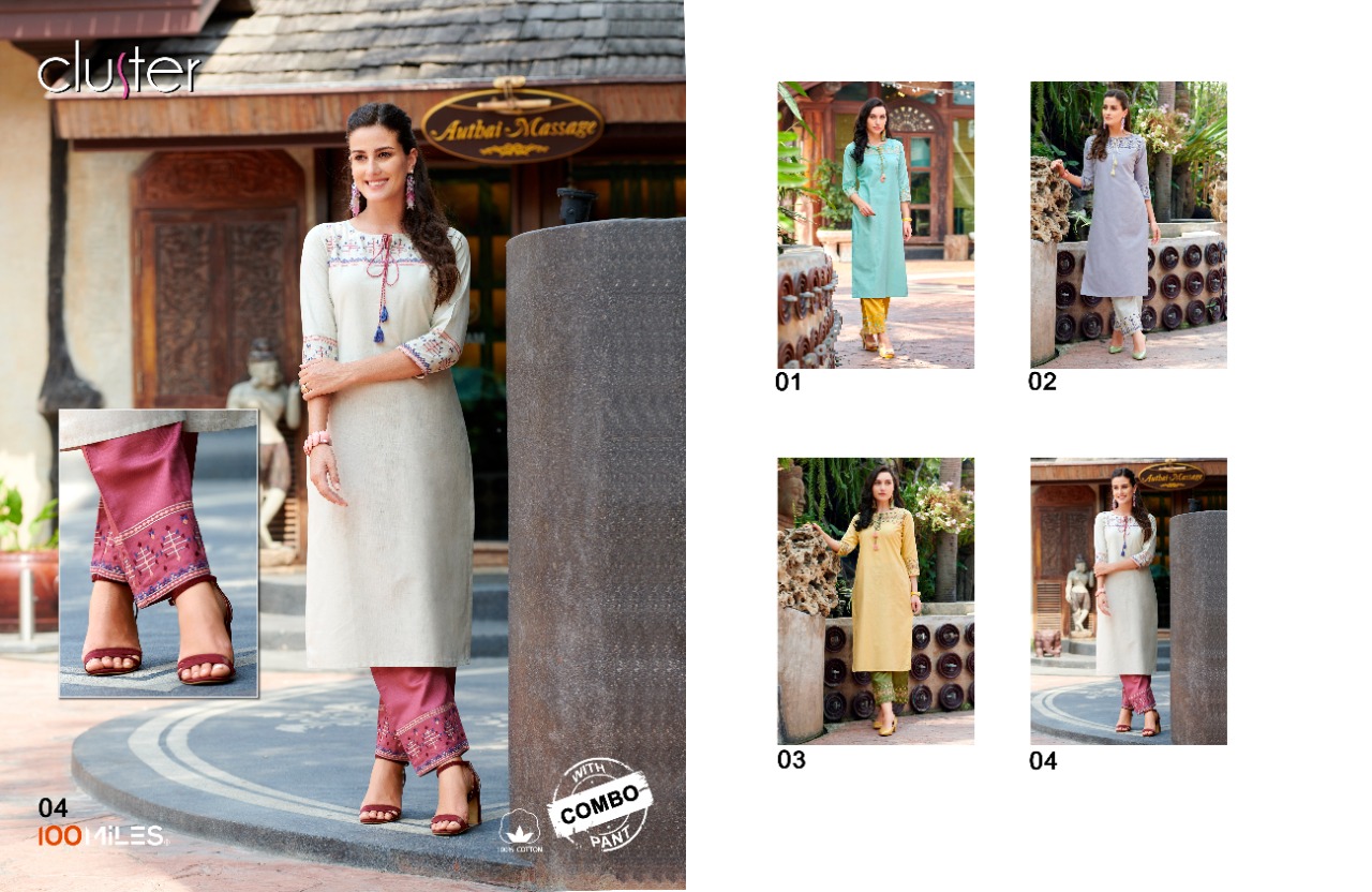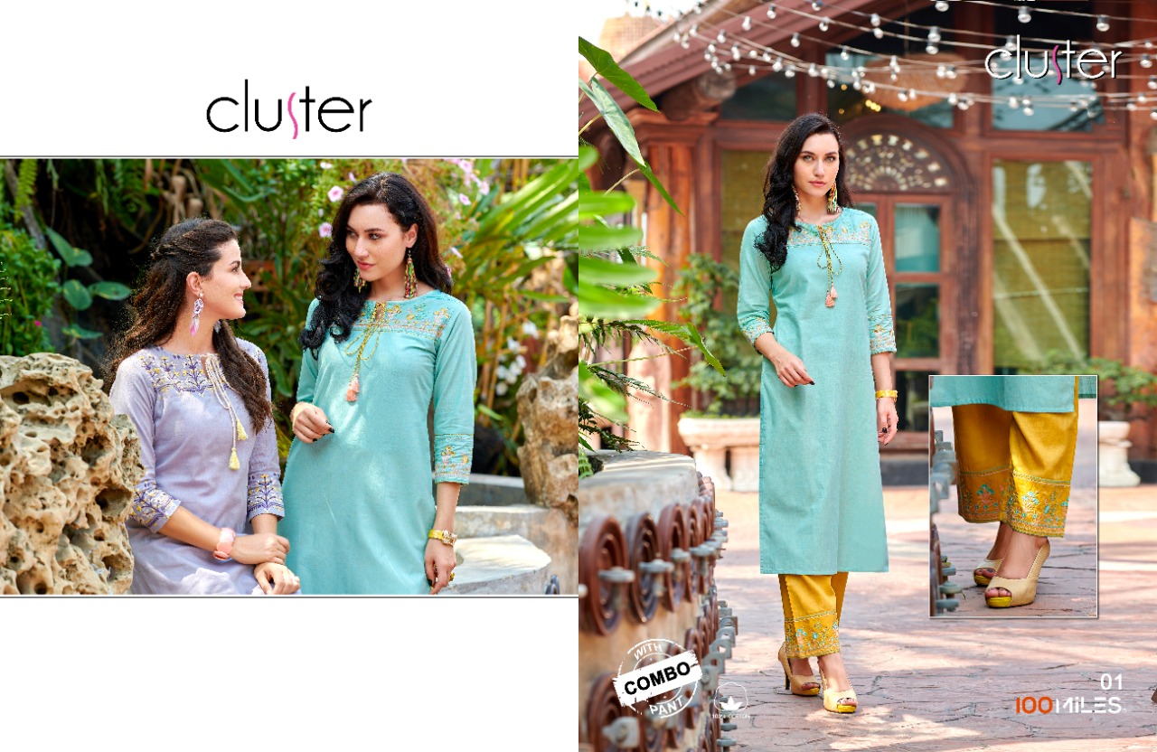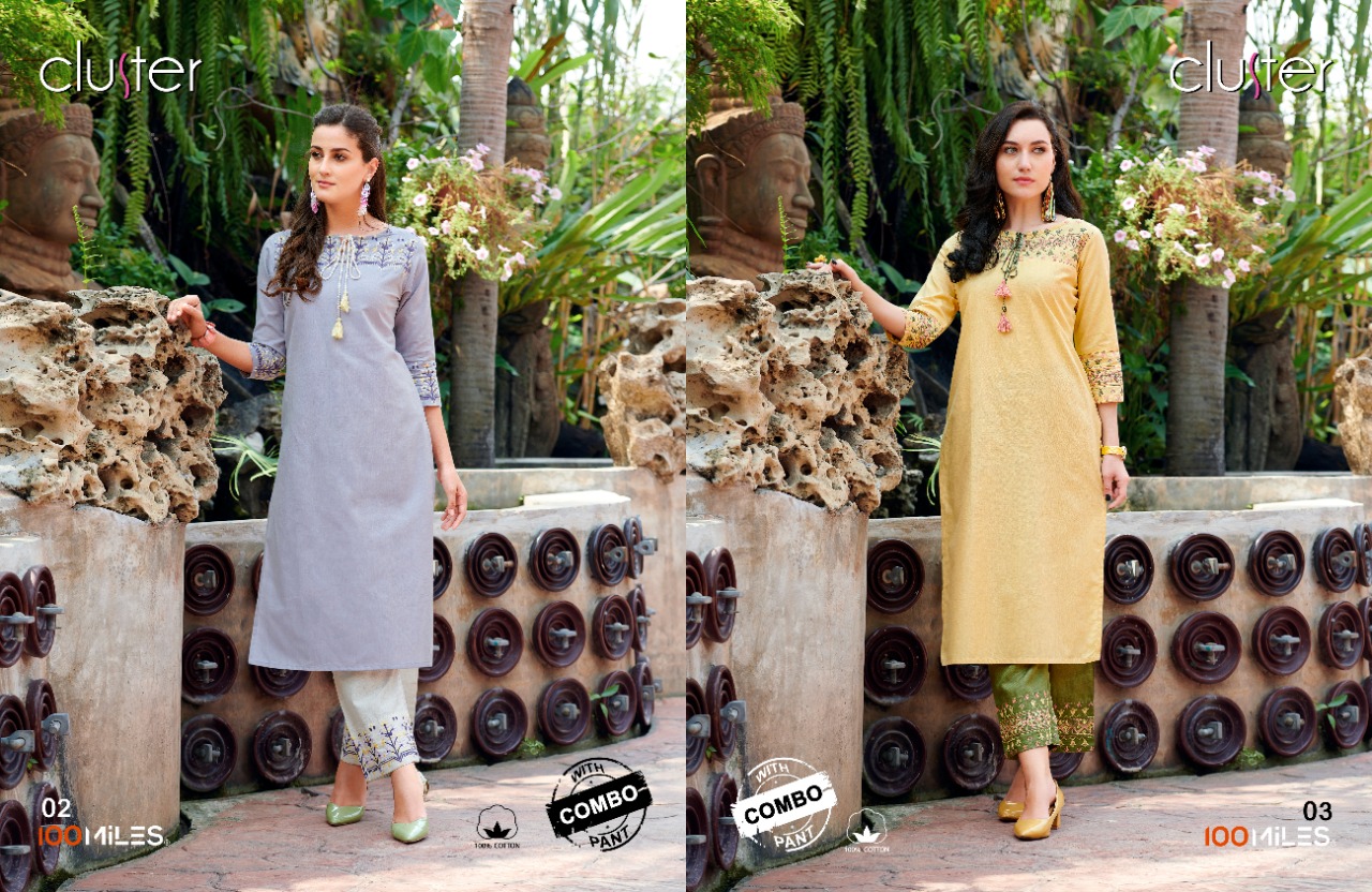 Catalog : CLUSTER with bottom combo BRAND : 100MILESî︠TYPE : Pure cotton embroidered kurtis with combo embroidered pants. SIZES : M to 2XL RATE : 705/-(with bottom) Pieces: 4 per Bag |