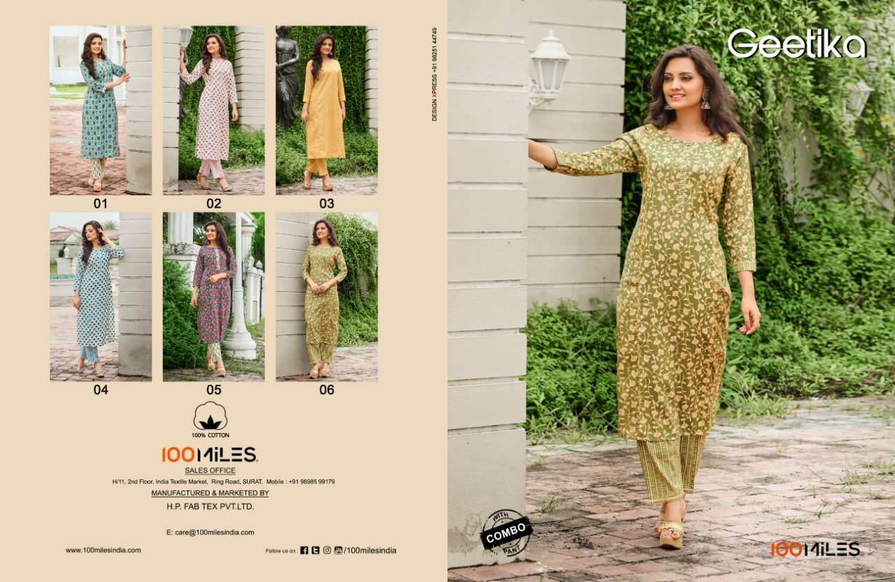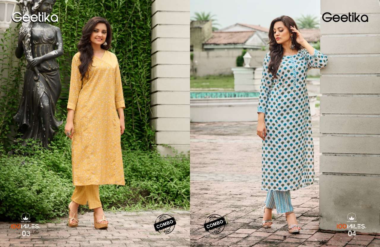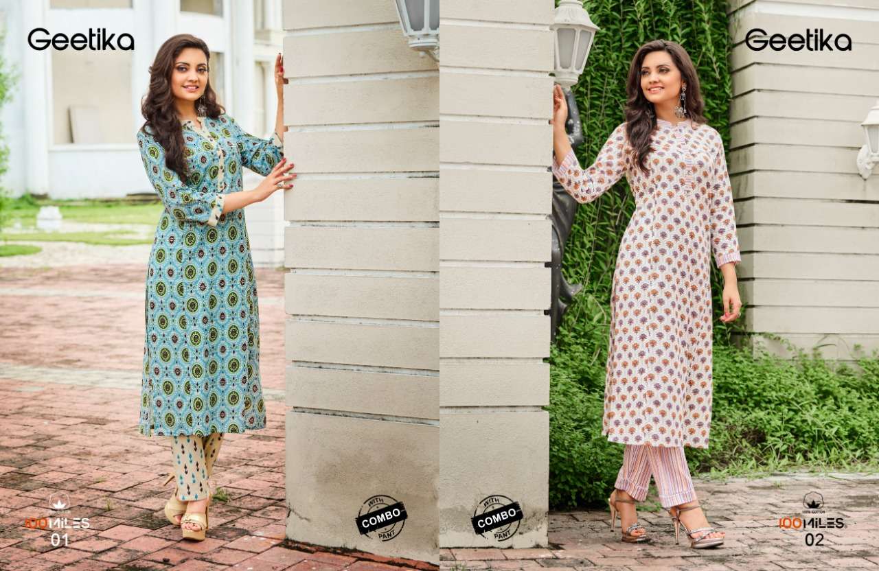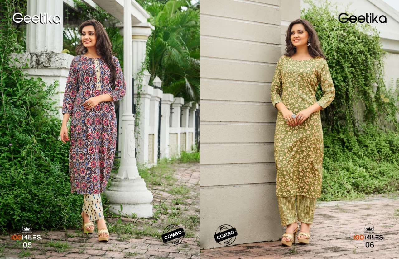 100 Miles Geetika Cotton Kurti With Pant Wholesaler