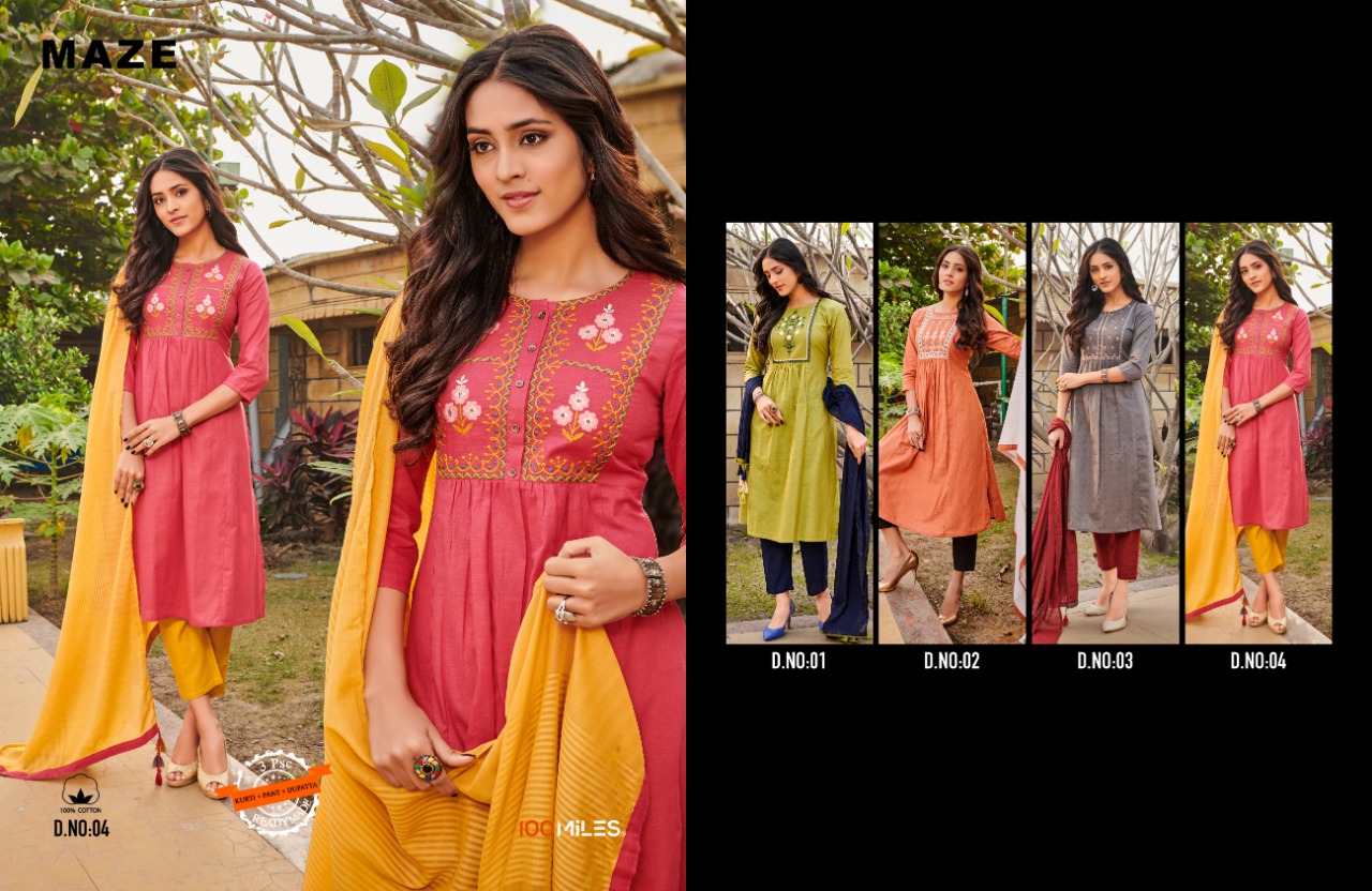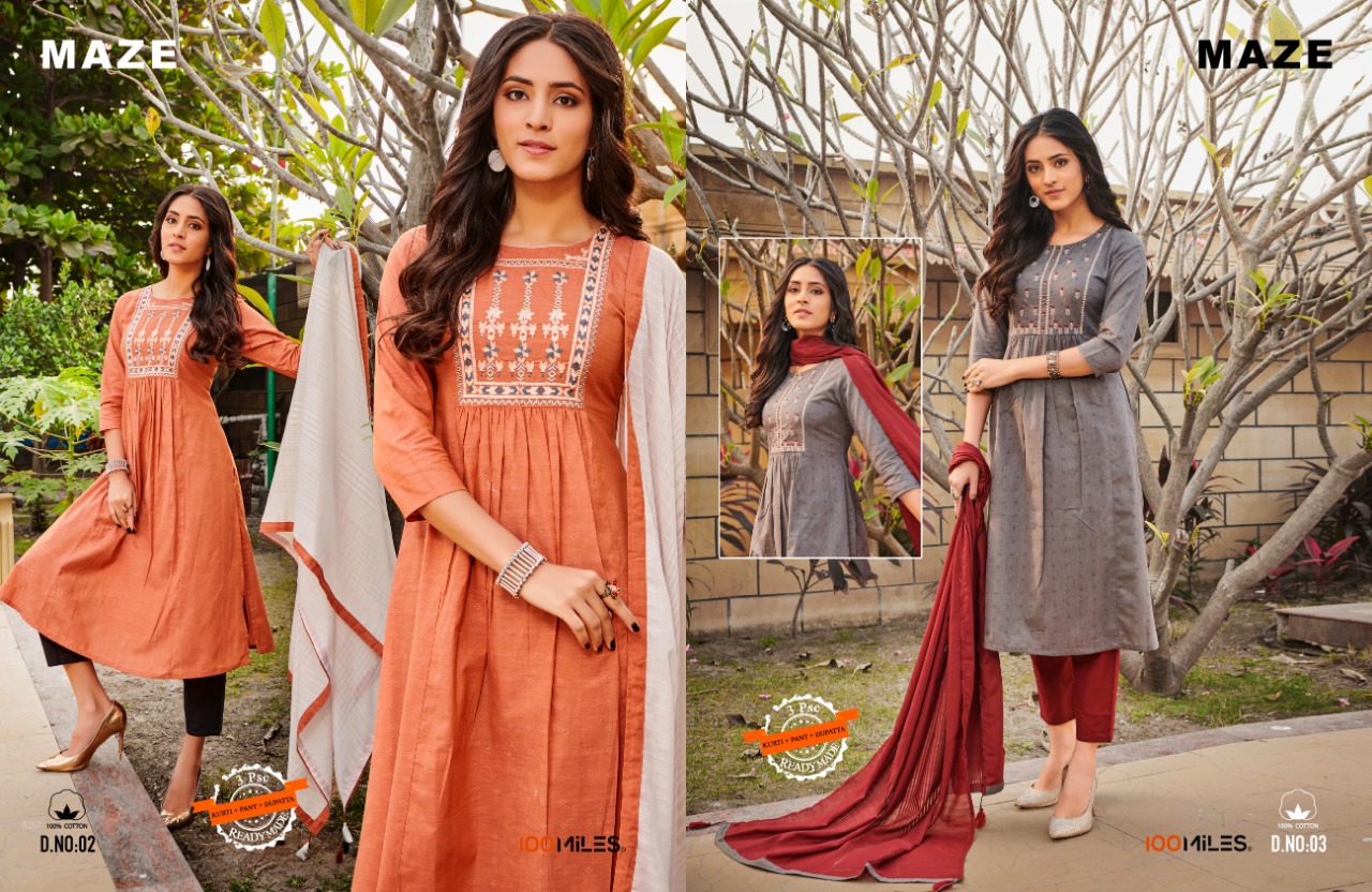 100 Miles Launch Maze Cotton Embroidered Readymade Kurti Pant With Dupatta Set