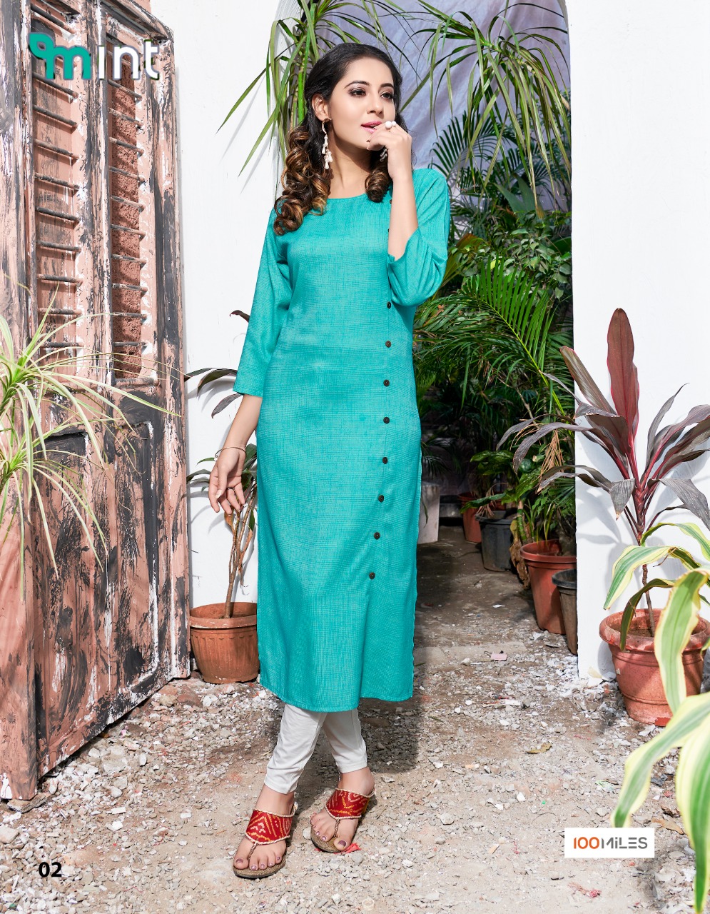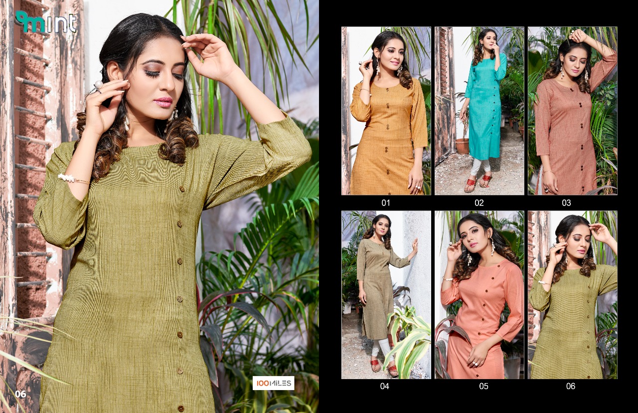 Catalog : MINT BRAND : 100MILESî TYPE : Rayon designer kurtis SIZES : S to 3XL Rs 10/- extra for size 3XL RATE : 355/- Pieces: 6 psc per Bag |
