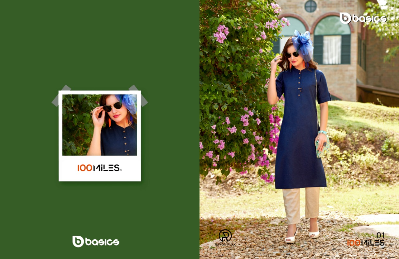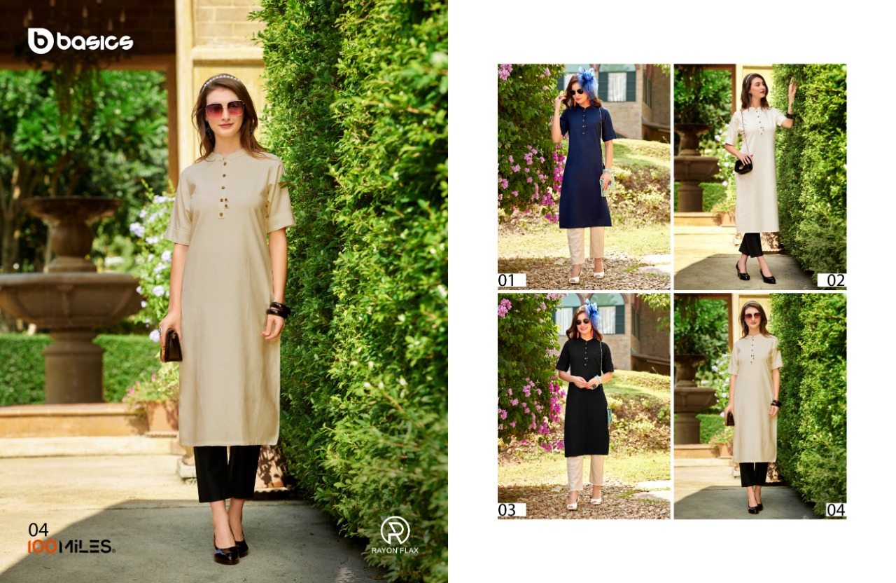 Catalog : BASICS BRAND : 100MILESâ¢︠TYPE : Rayon flax fancy kurti. SIZES : S to 3XL(Rs 10/- extra for size 3XL) RATE : 355/- Pieces: 4 psc per Bag Set to set. GST 5 Percent Extra |