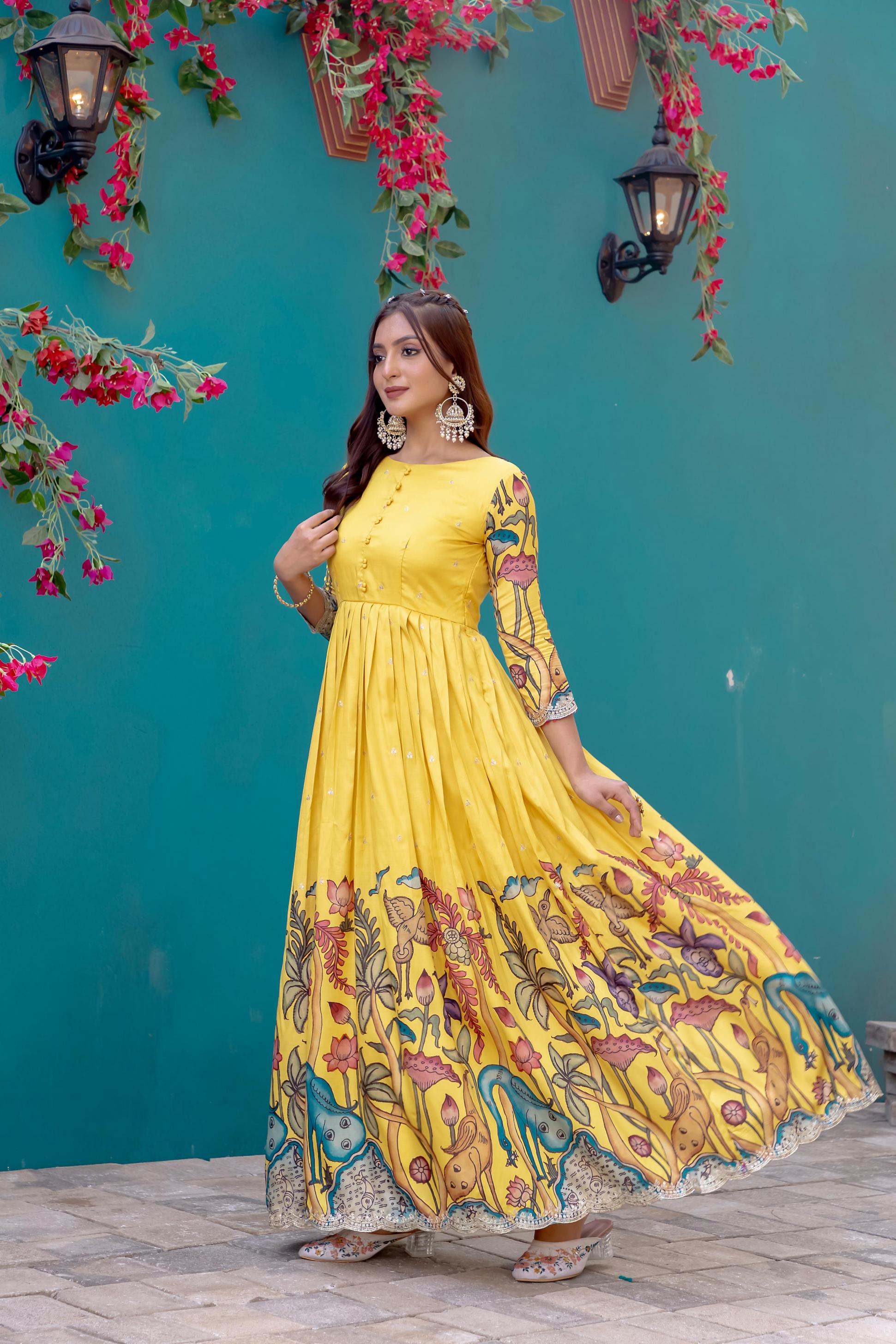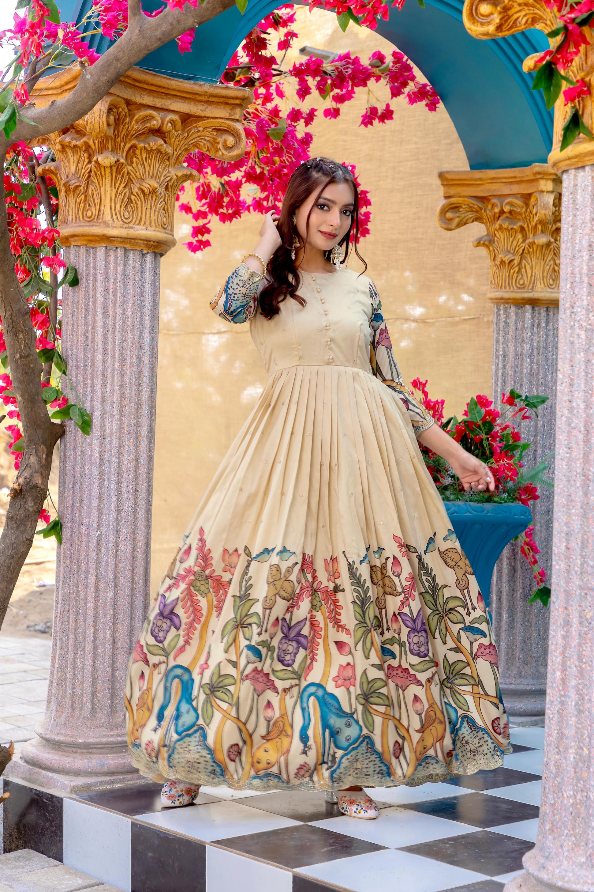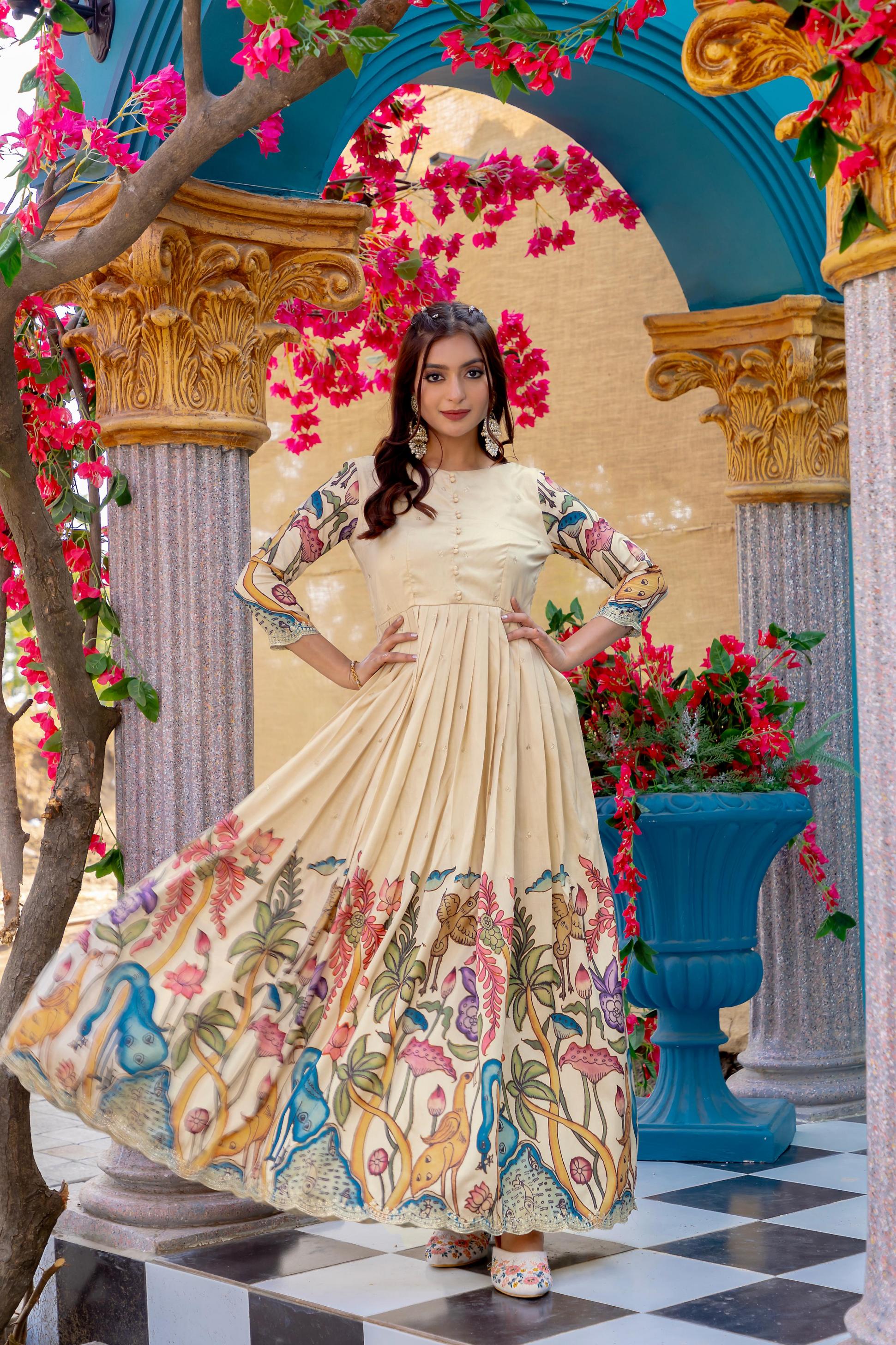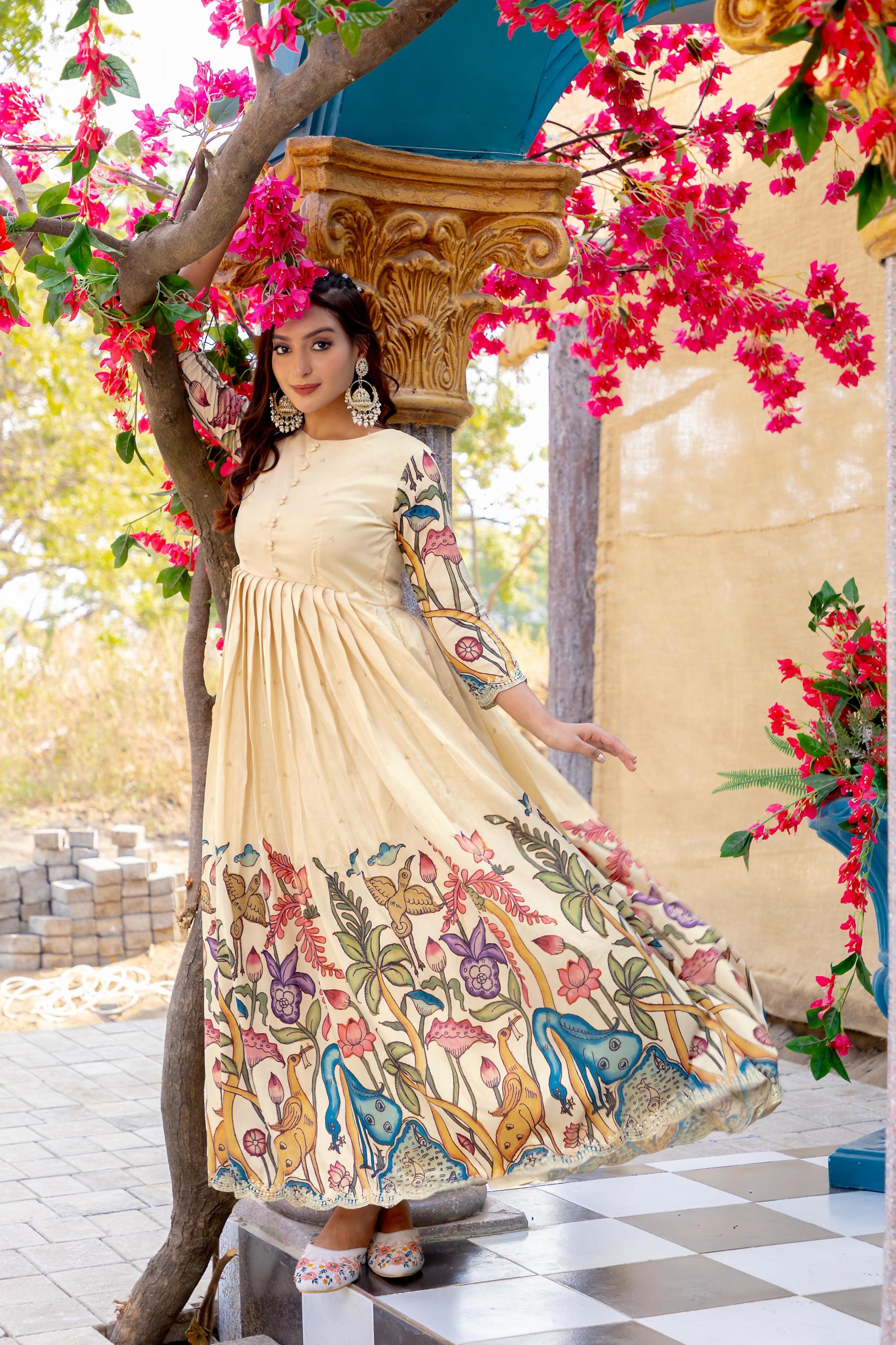 🌺New catalog🌺 Design No : 200002 This printed gown with 3/4th sleeves and scallop embroidery details is a must-have addition to your wardrobe for any occasion. Its elegant design and flattering silhouette make it perfect for both casual and festive events. Gown fabric :- silk blend Price:- 1699/- Note :- Size customization is available as per requirements. |