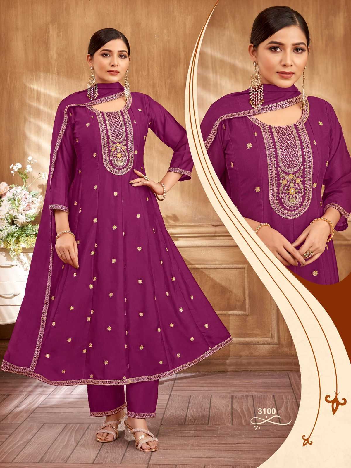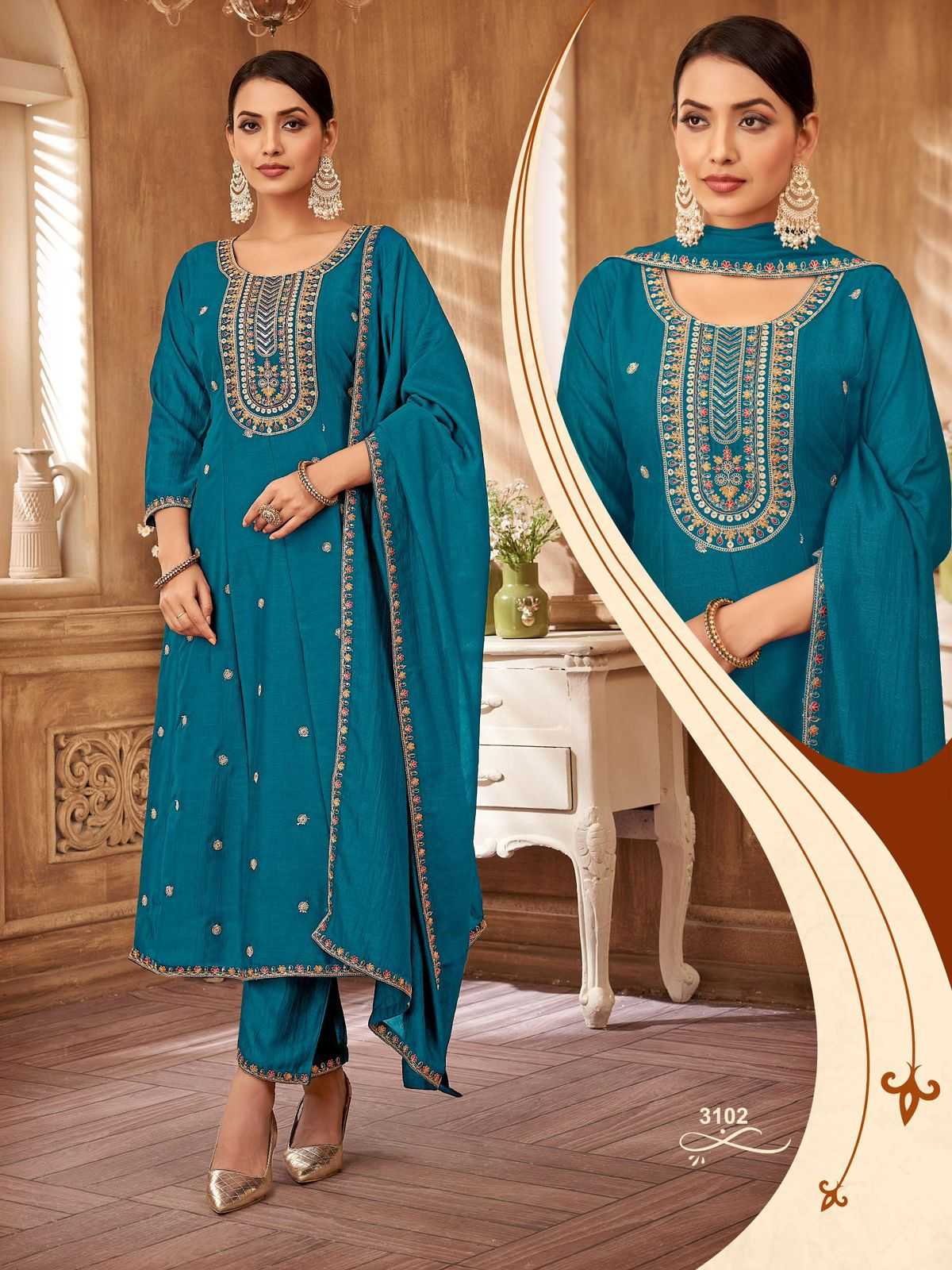 3099 to 3102 by ladies flavour vichitra with embroidery work full stitch 3pcs dress