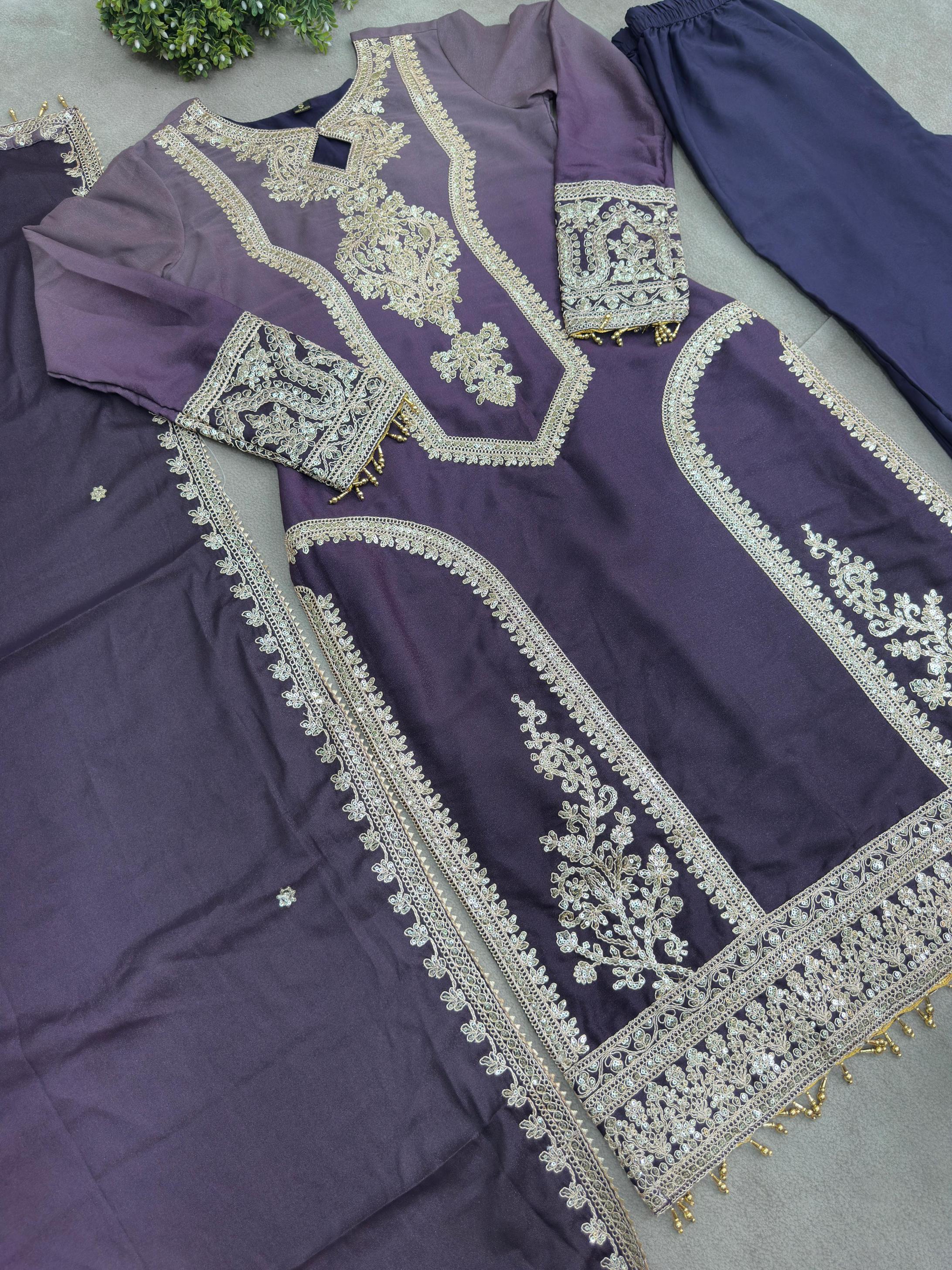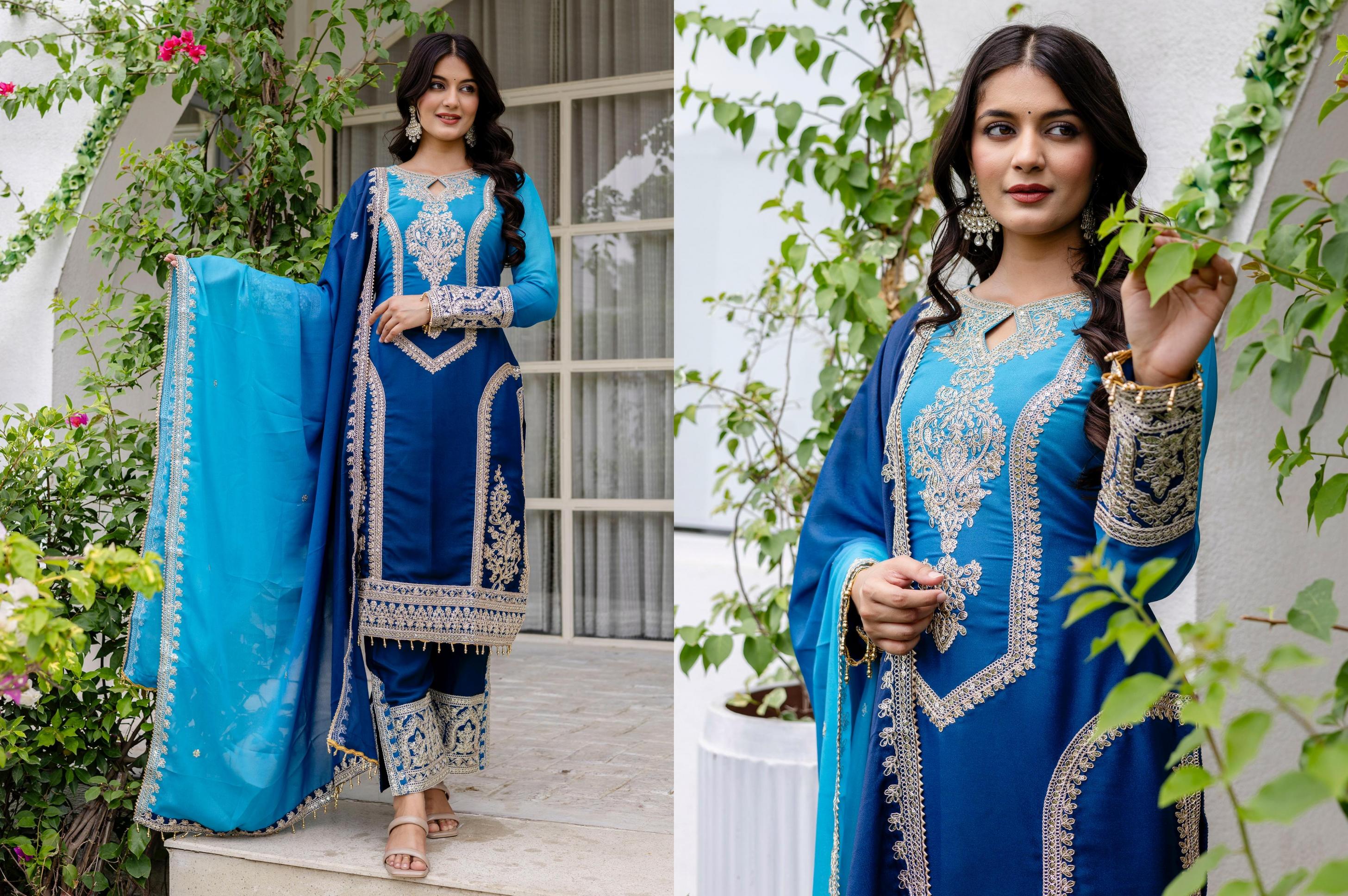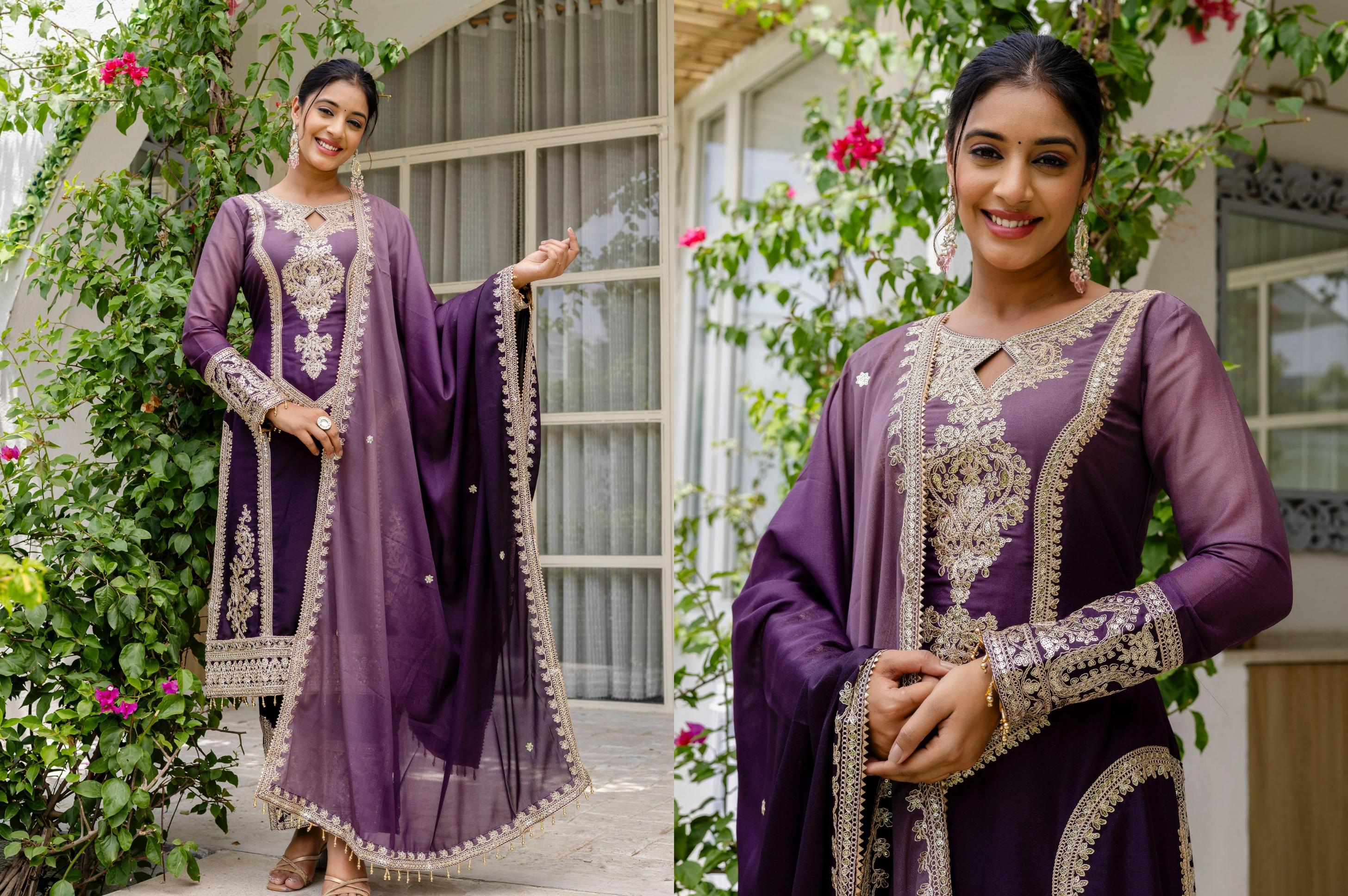 REAL MODEL SHOOT DESIGN “Radiating grace in royal blue,purple,majenta,pista green,colour This intricately embroidered ethnic ensemble, paired with a sheer dupatta and golden accents, is the perfect blend of tradition and sophistication.” DN: 5114 👗TOP 👖BOTTOM Fabric :- CRAP 👗Dupata Fabric : STAR GEORGEET PEDDING Weight :- 1KG Price:- 1095₹ ❤️PREMIUM AND SHOWROOM COLLECTION |