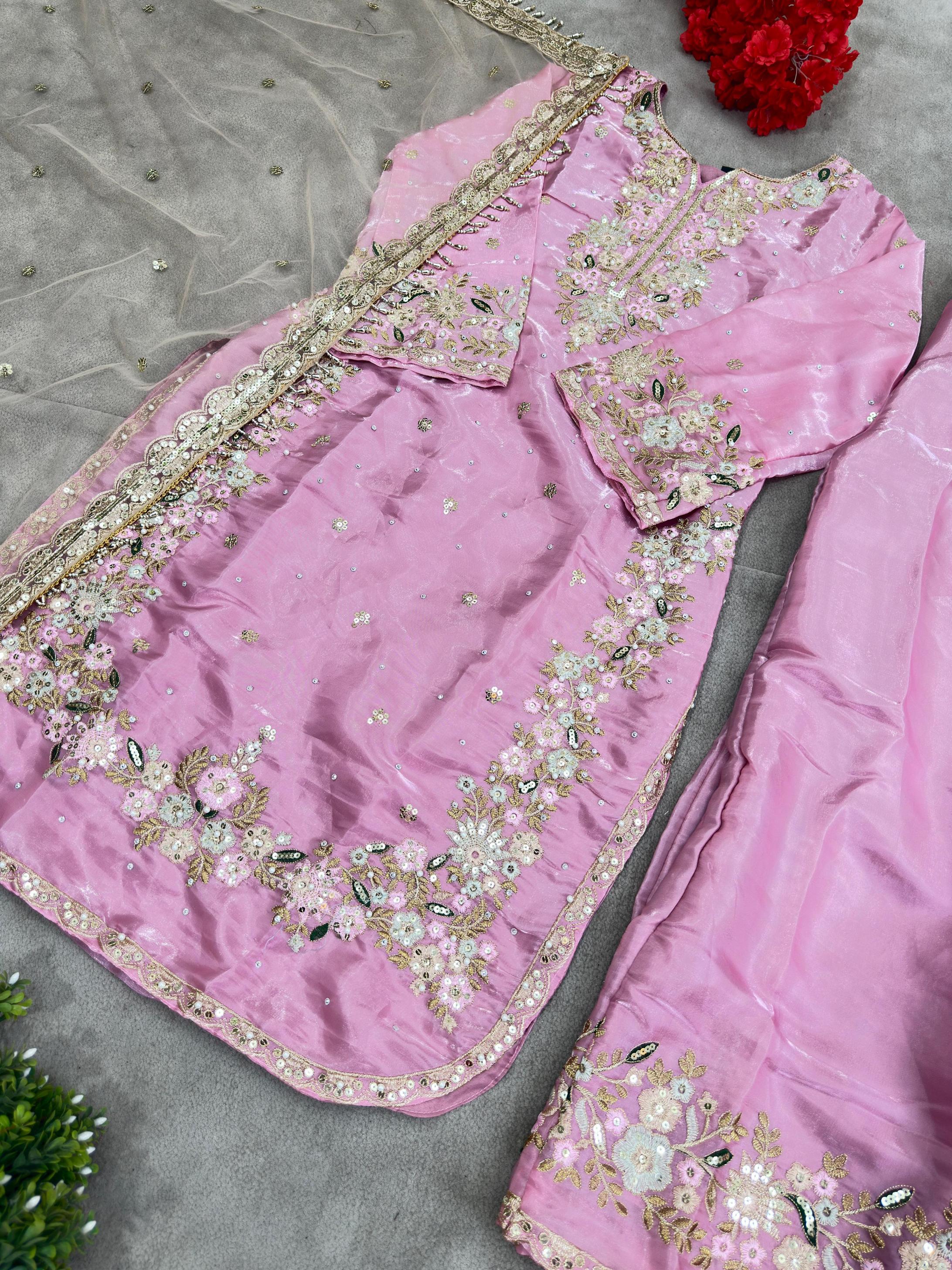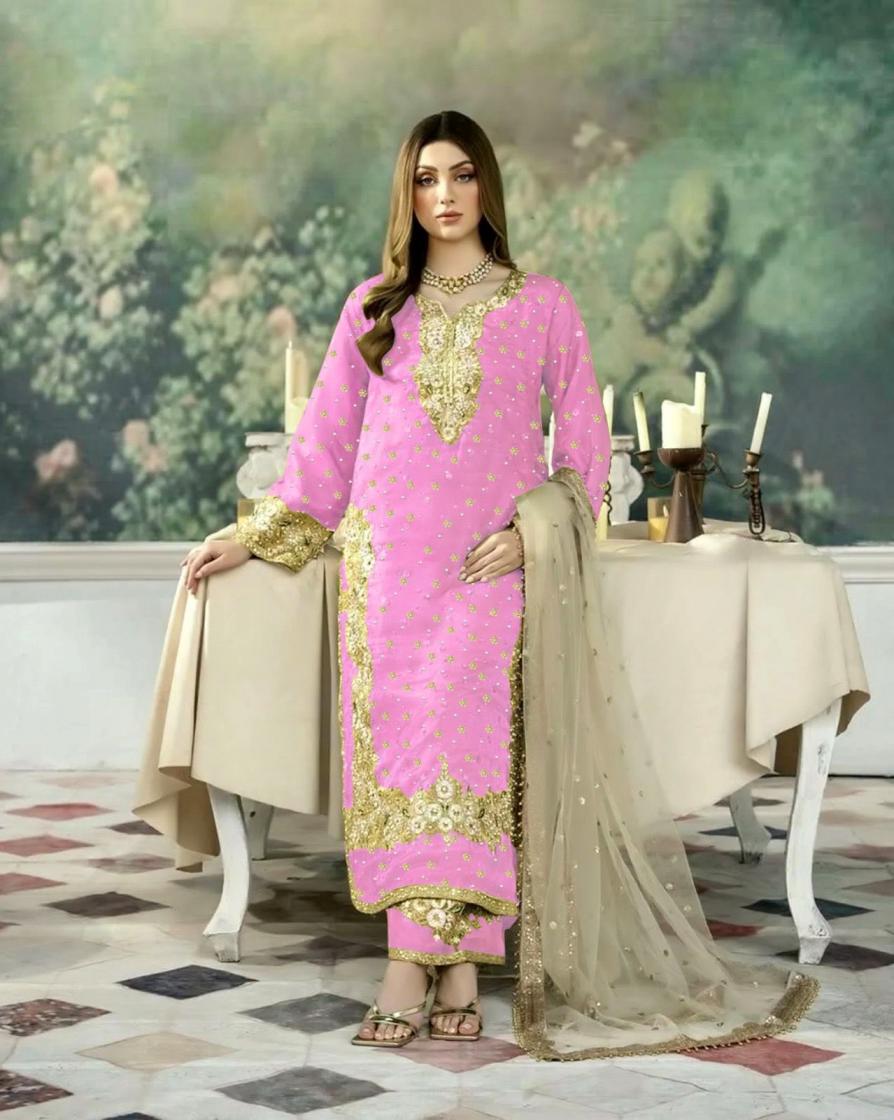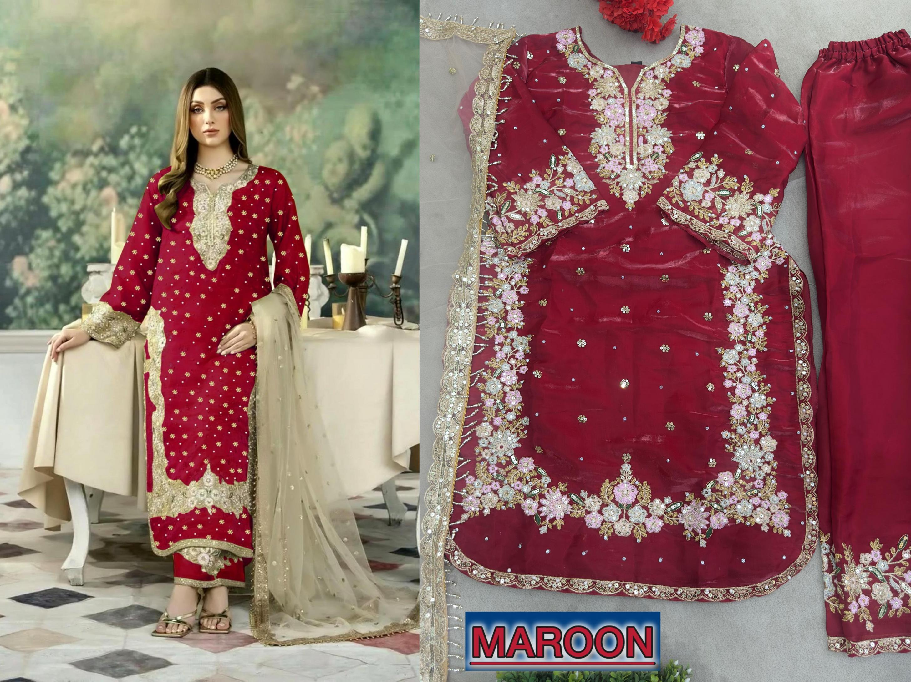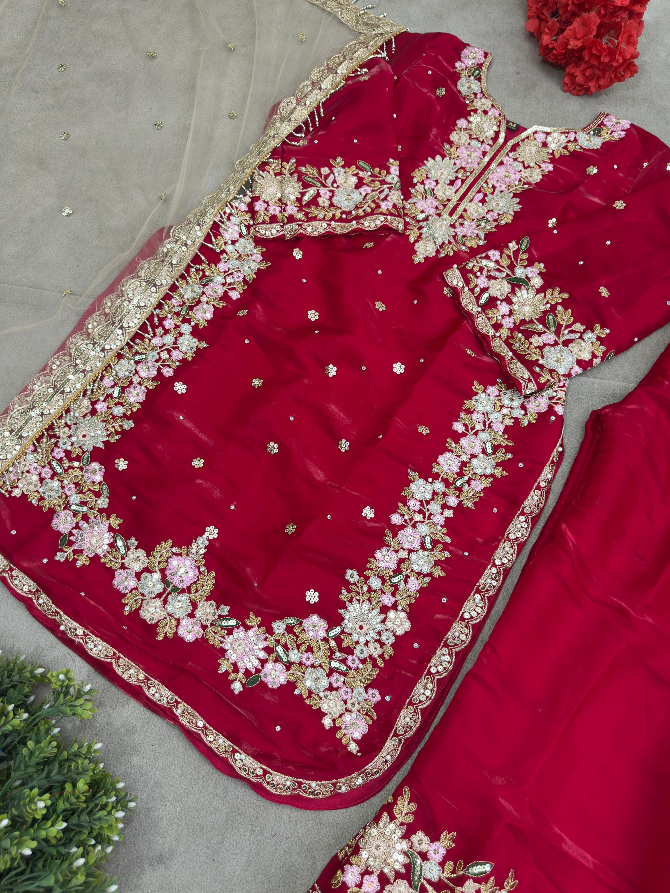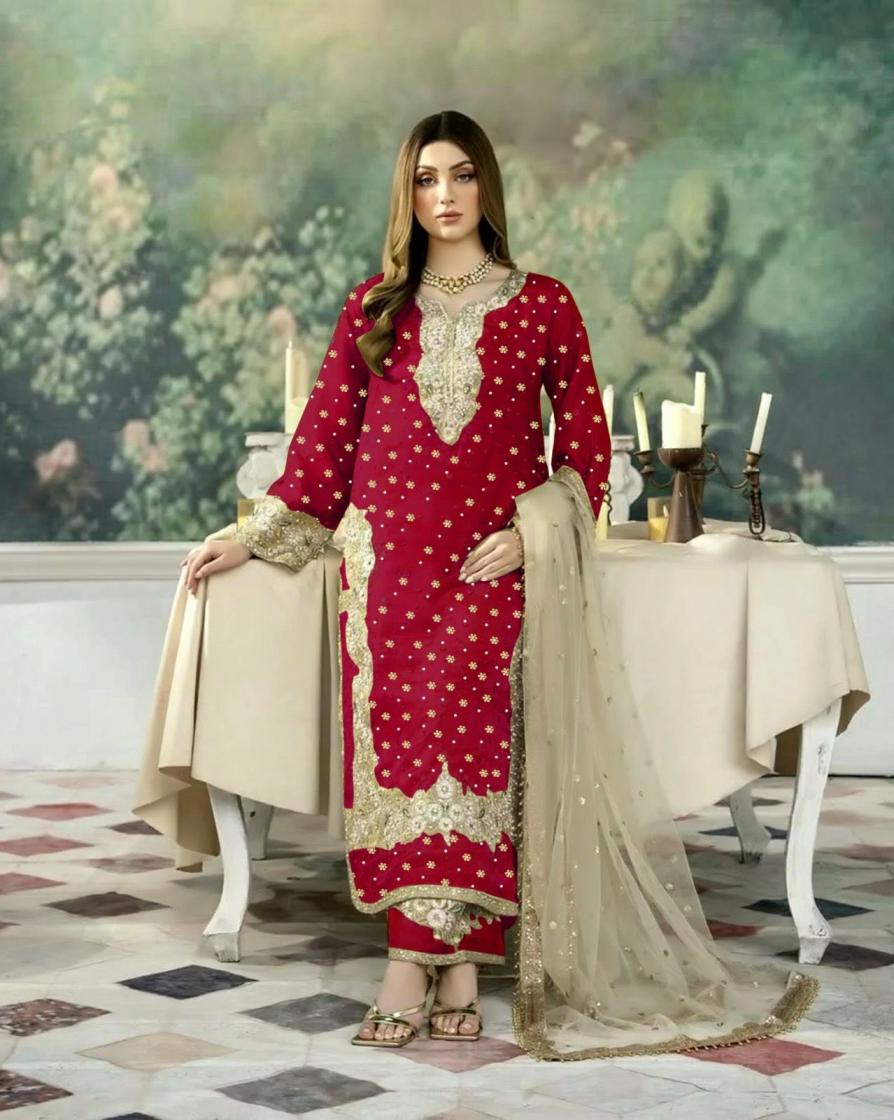 A stunning traditional outfit adorned with intricate golden embroidery, featuring a rich cherry-colored base paired with a delicate beige net dupatta. Perfect for festive occasions and formal gatherings. DN: 5115 👗TOP 👖BOTTOM Fabric :- JIMMY CHOO 👗Dupata Fabric : HEAVY NET Weight :- 1KG Price:- 1350₹ ❤️PREMIUM AND SHOWROOM COLLECTION |